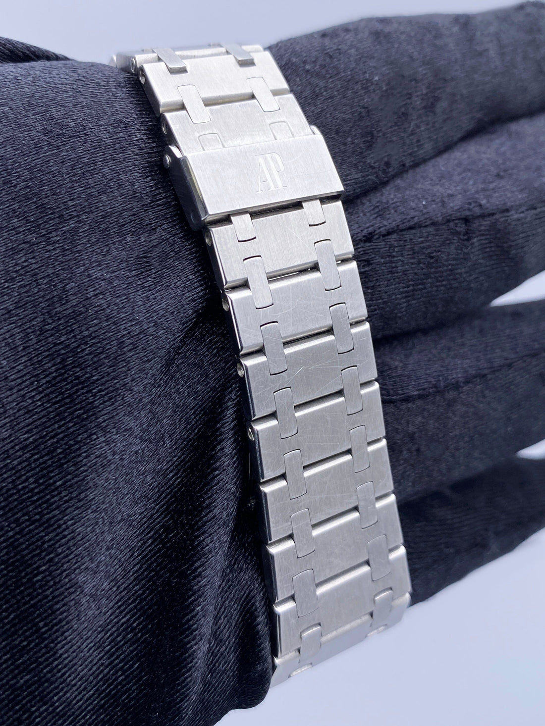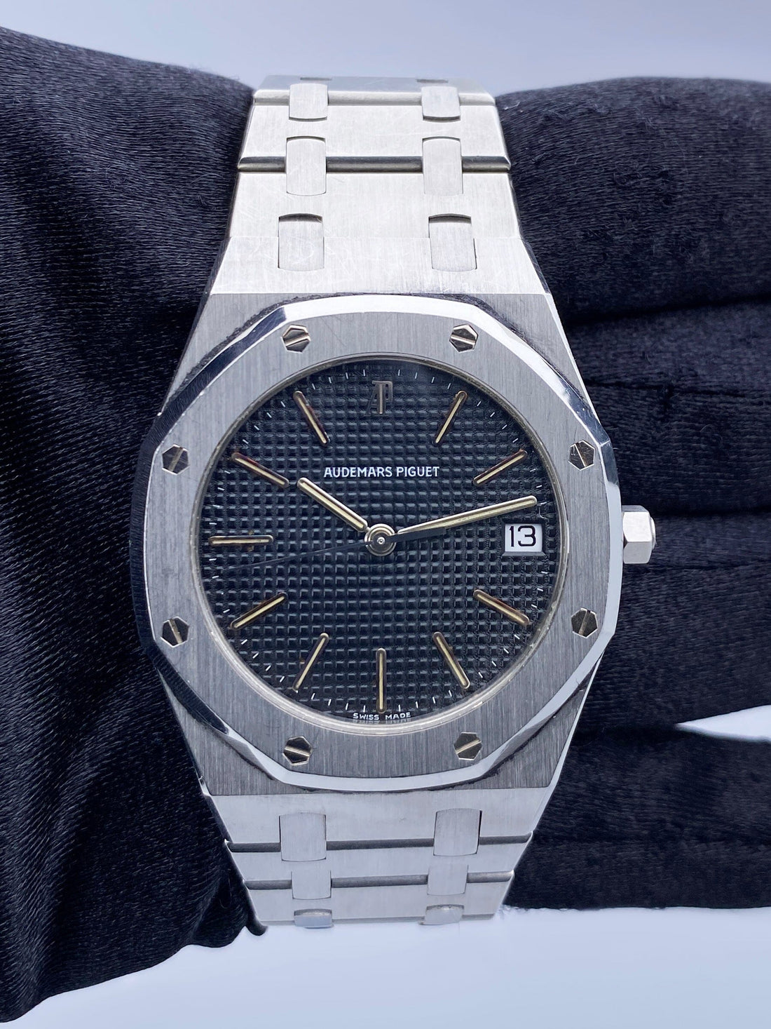 Audemars Piguet Royal Oak Mens Watch. 36mm stainless steel case. Stainless steel octagon shape bezel. Black dial with luminous hands and index hour marker. Date display at 3 o'clock. Stainless steel bracelet with fold over steel clasp with single push button safety. Will fit up to 6.25-Inch wrist. Sapphire crystal. Stainless steel case back. Quartz: Battery powered movement.