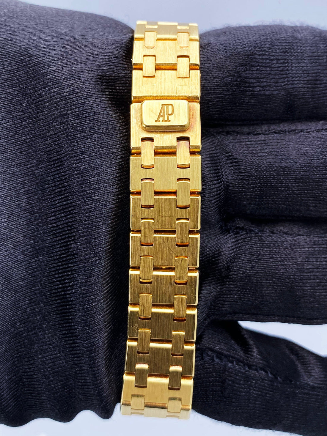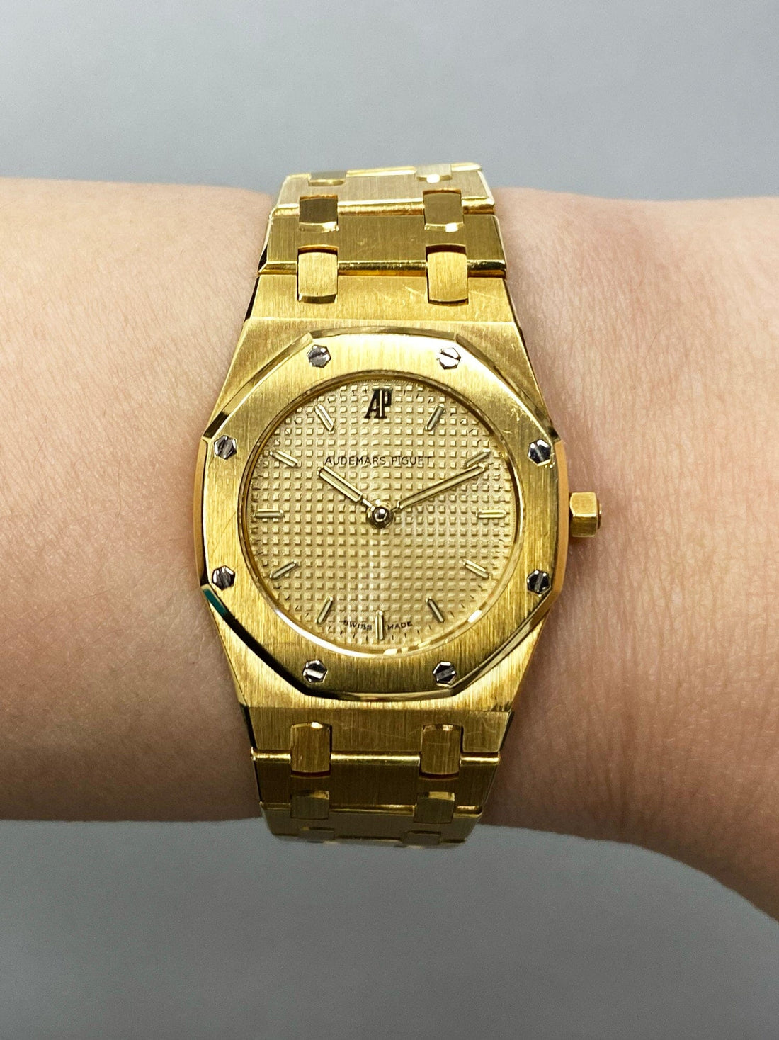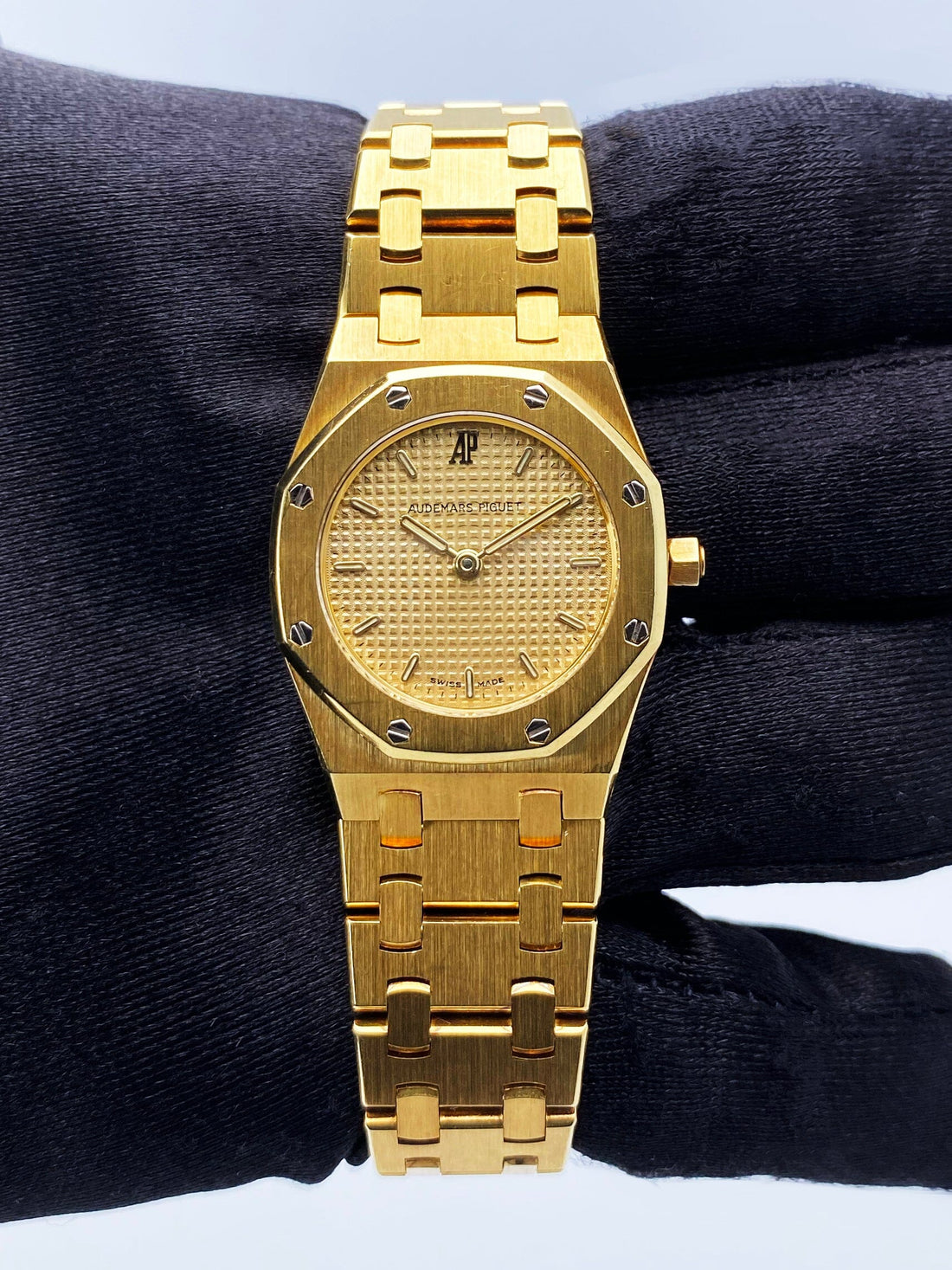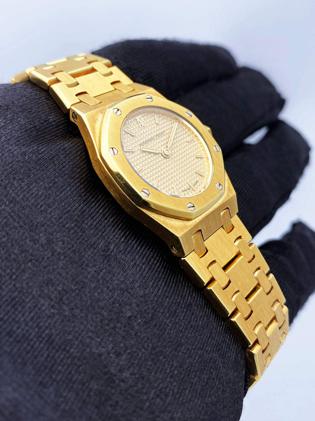 Audemars Piguet Royal Oak Ladies Watch. 25mm 18K yellow gold case. 18K yellow gold octagon shaped bezel. Champagne tapestry dial with gold hands and index hour marker. 18K yellow gold bracelet with 18K yellow gold fold over clasp with safety. Will fit up to 6.5-Inch wrist. Sapphire crystal. 18K yellow gold case back. Quartz: Battery powered movement.