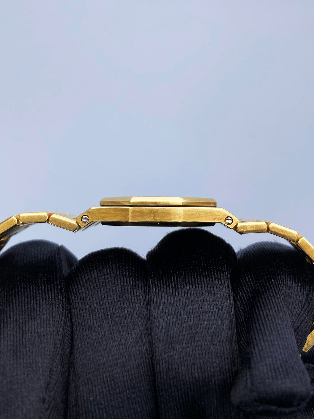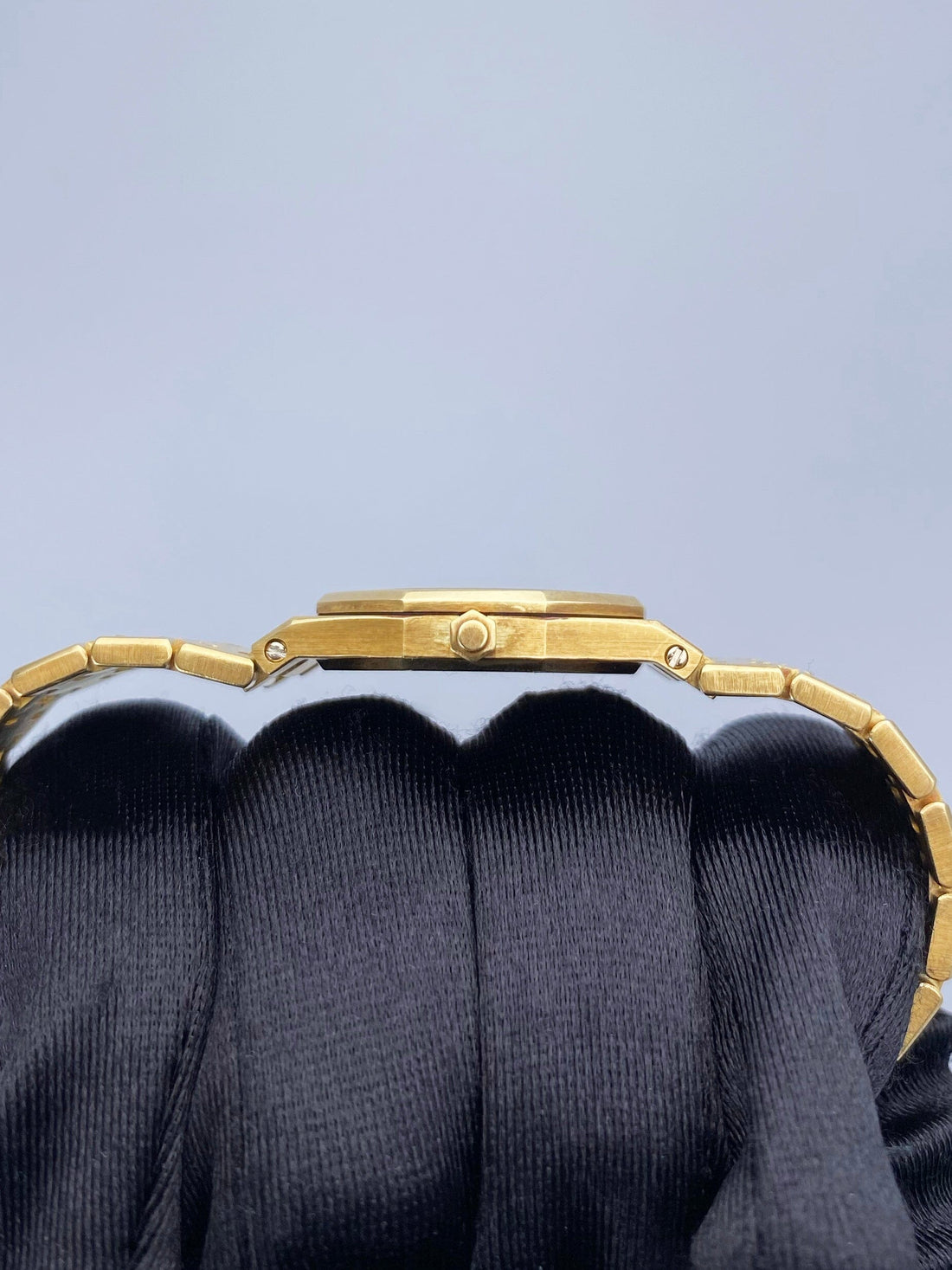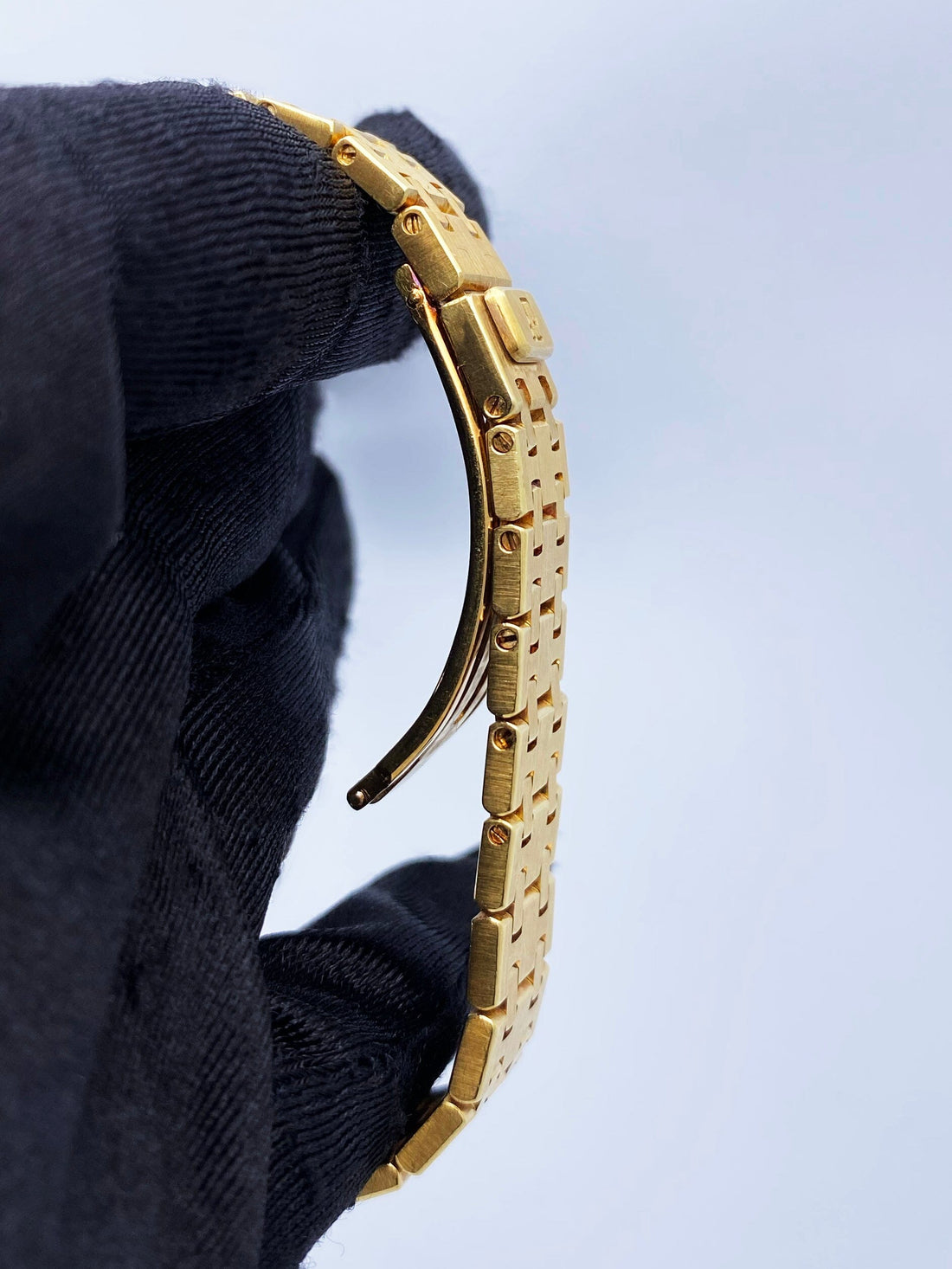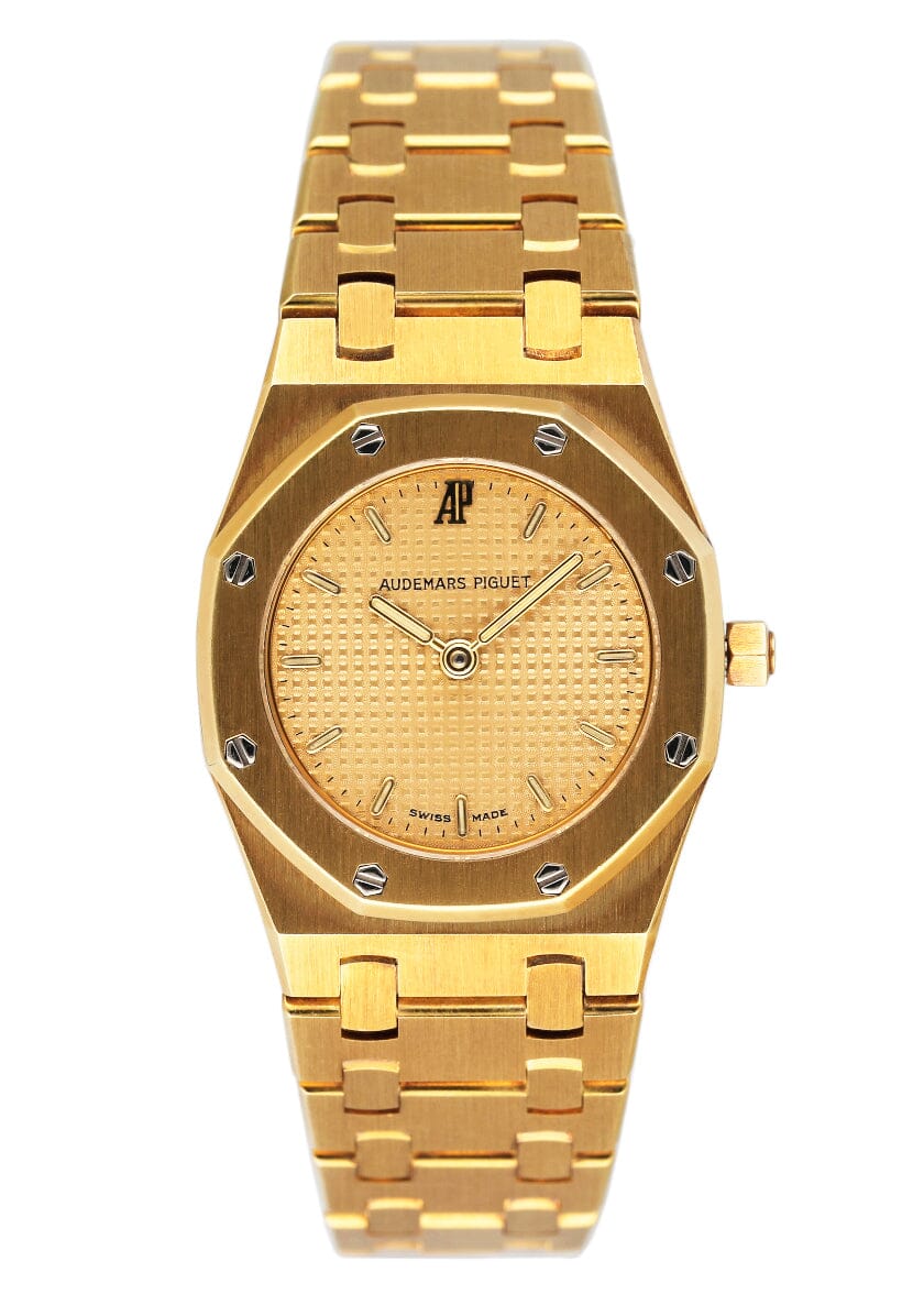 Audemars Piguet Royal Oak Ladies Watch. 25mm 18K yellow gold case. 18K yellow gold octagon shaped bezel. Champagne tapestry dial with gold hands and index hour marker. 18K yellow gold bracelet with 18K yellow gold fold over clasp with safety. Will fit up to 6.5-Inch wrist. Sapphire crystal. 18K yellow gold case back. Quartz: Battery powered movement.
