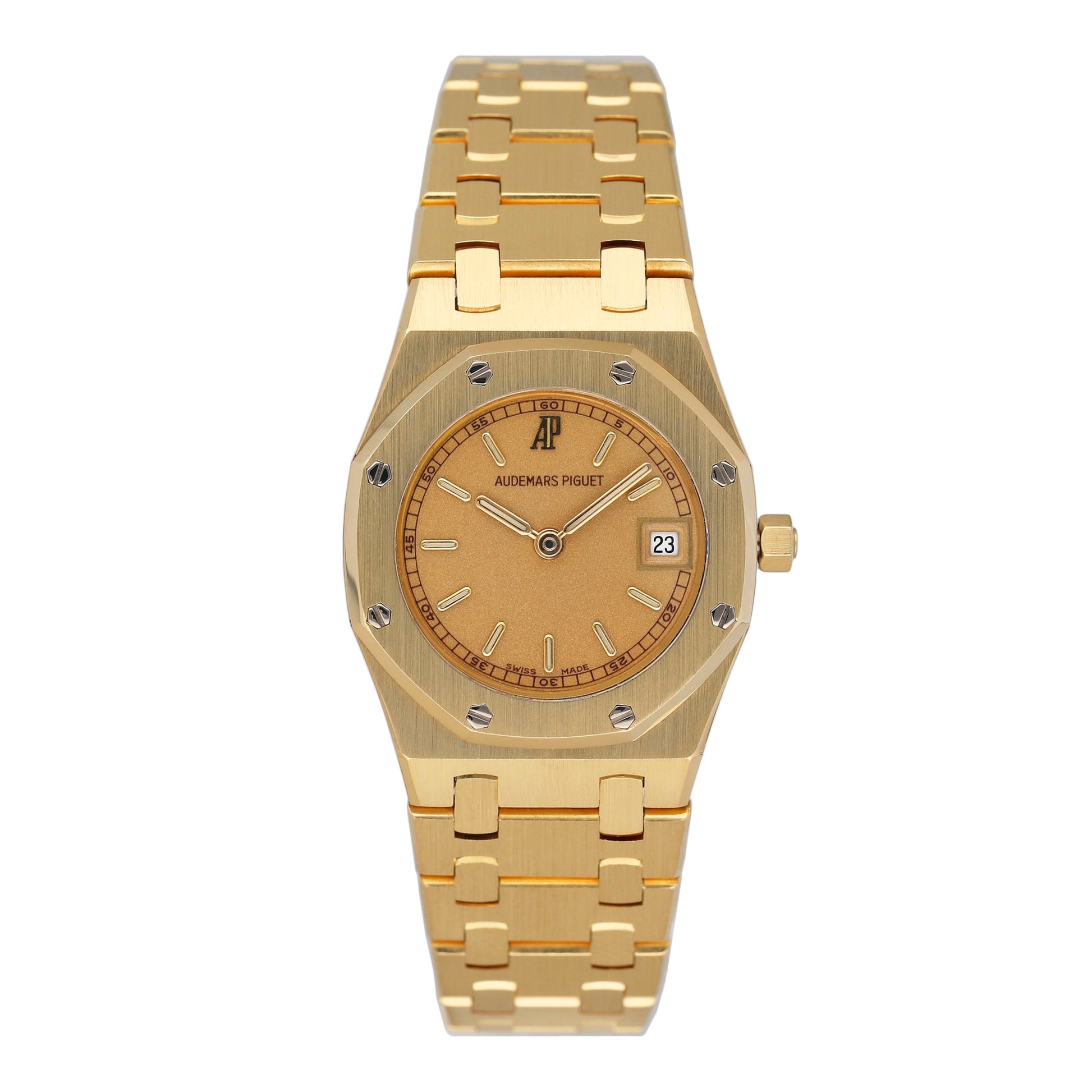 Audemars Piguet Royal Oak Ladies Watch. 25mm 18K yellow gold case. 18K yellow gold octagon shaped bezel. Champagne tapestry dial with gold hands and index hour marker. 18K yellow gold bracelet with 18K yellow gold fold over clasp with safety. Will fit up to 6.5-Inch wrist. Sapphire crystal. 18K yellow gold case back. Quartz: Battery powered movement.