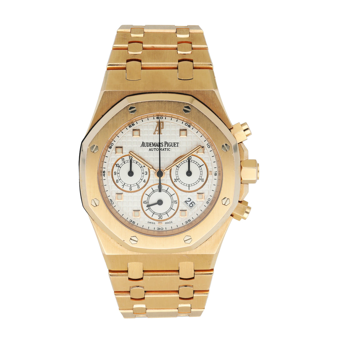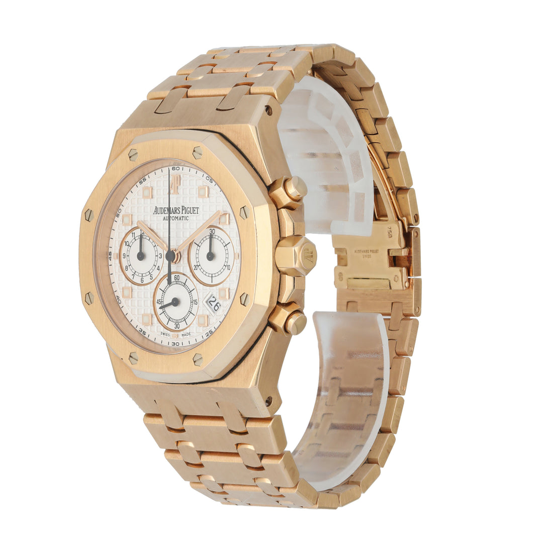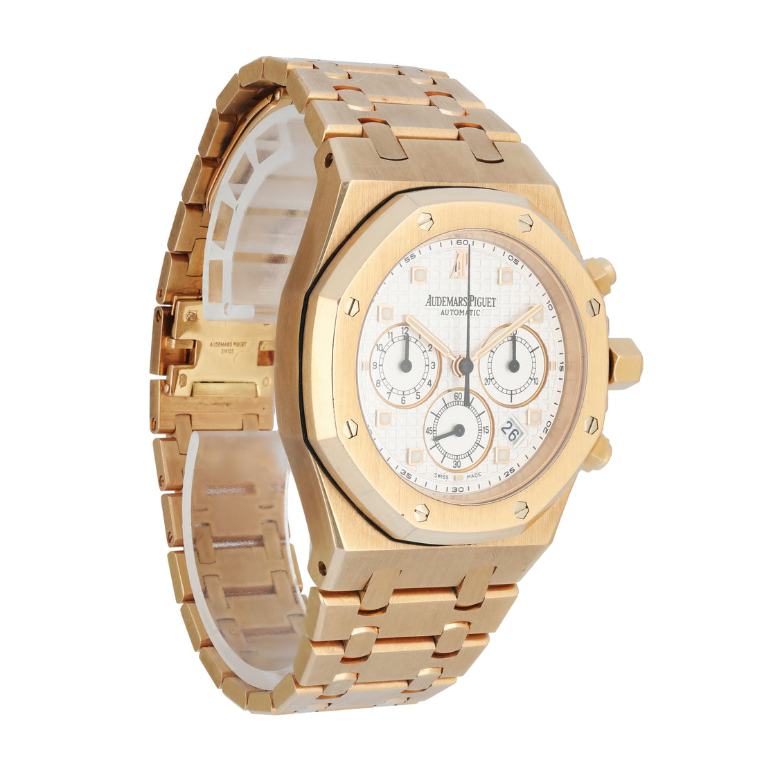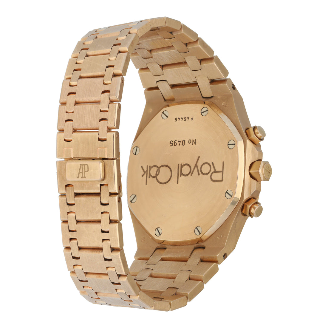 Rose gold royal oak bracelet with foldover clasp and safety.