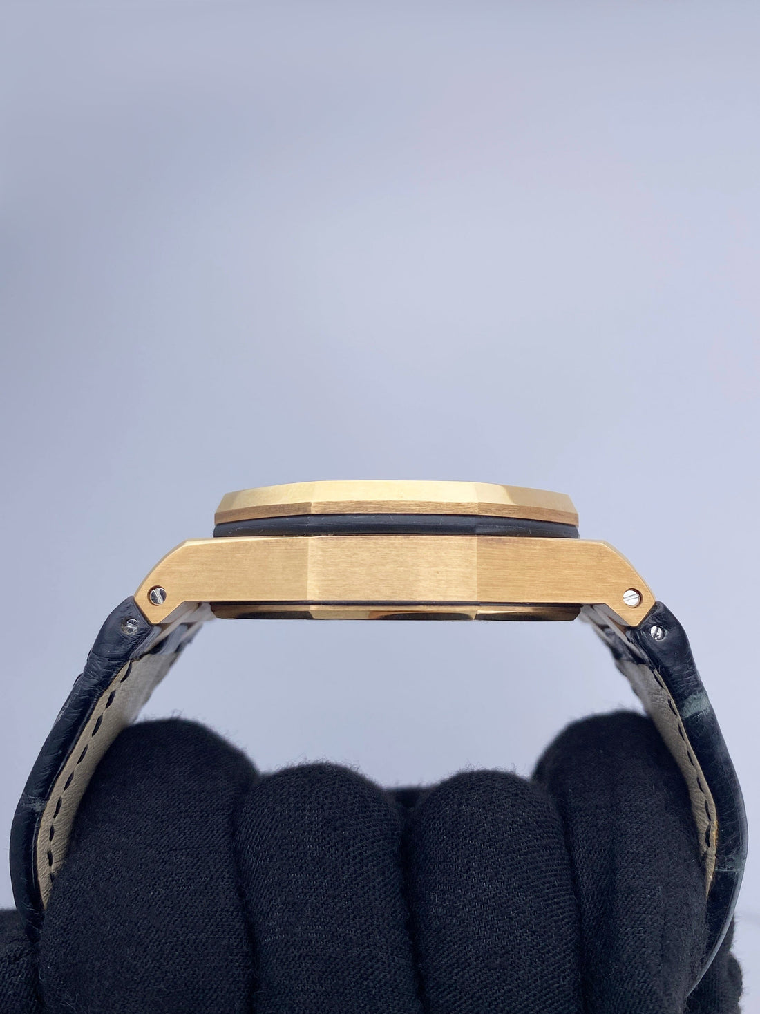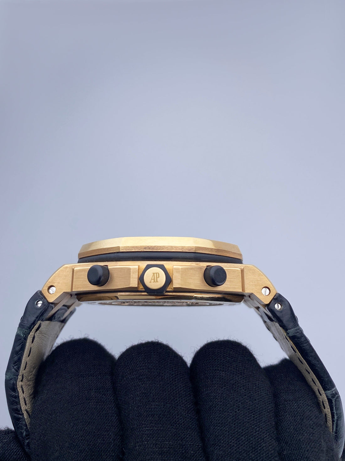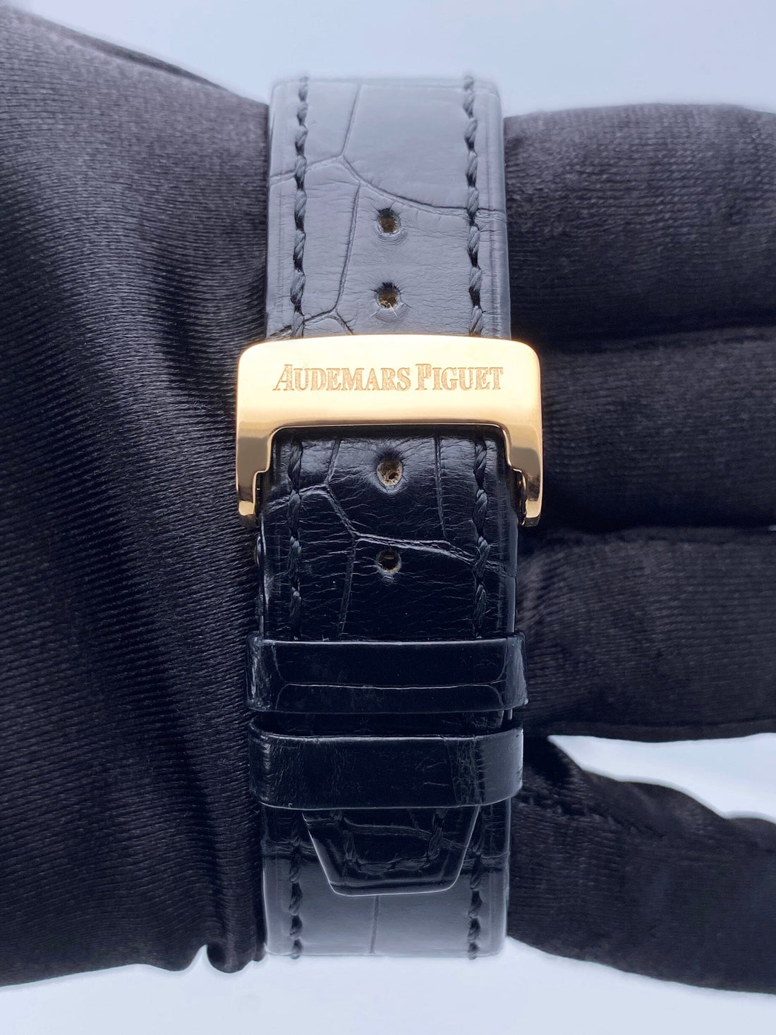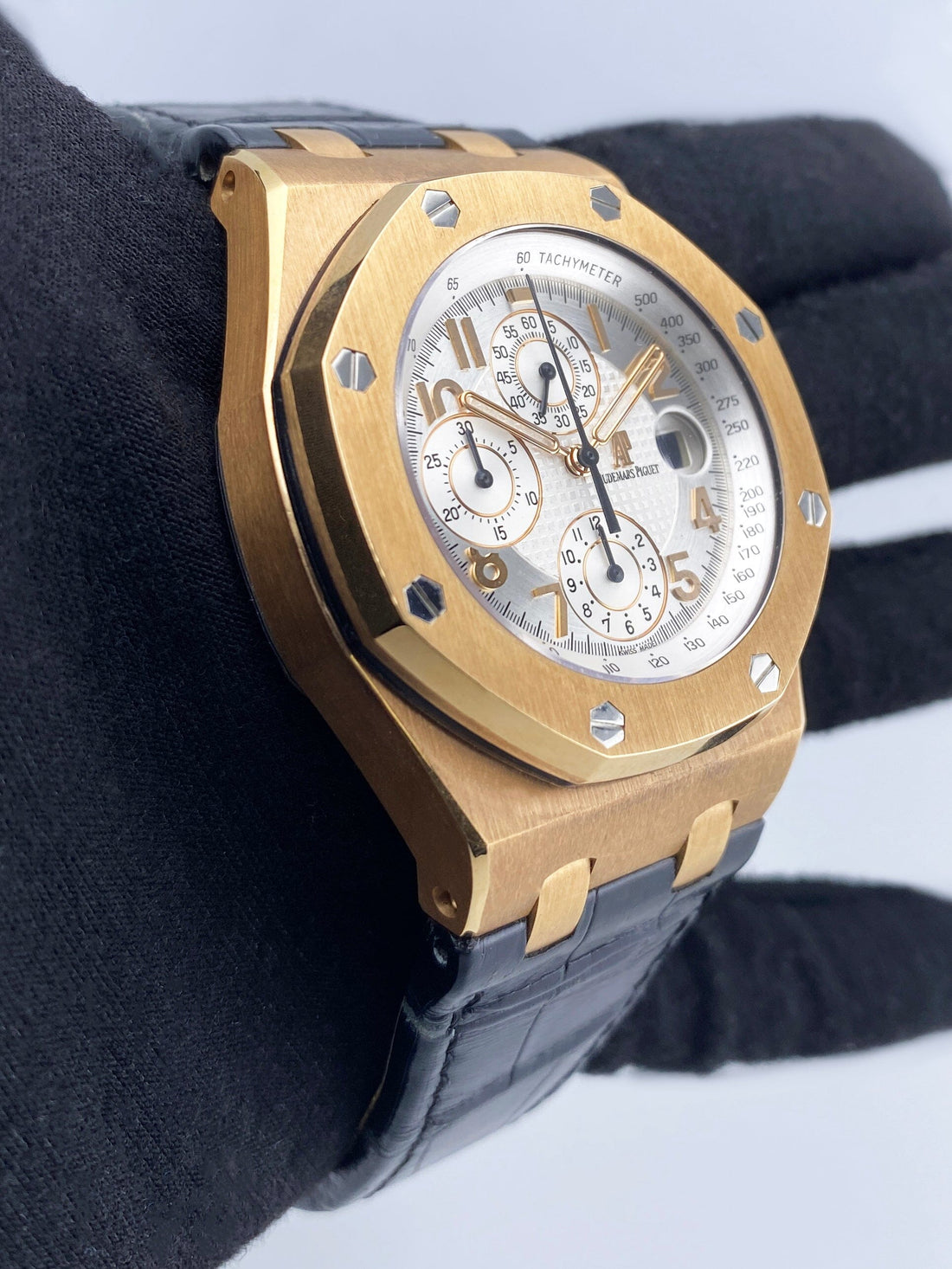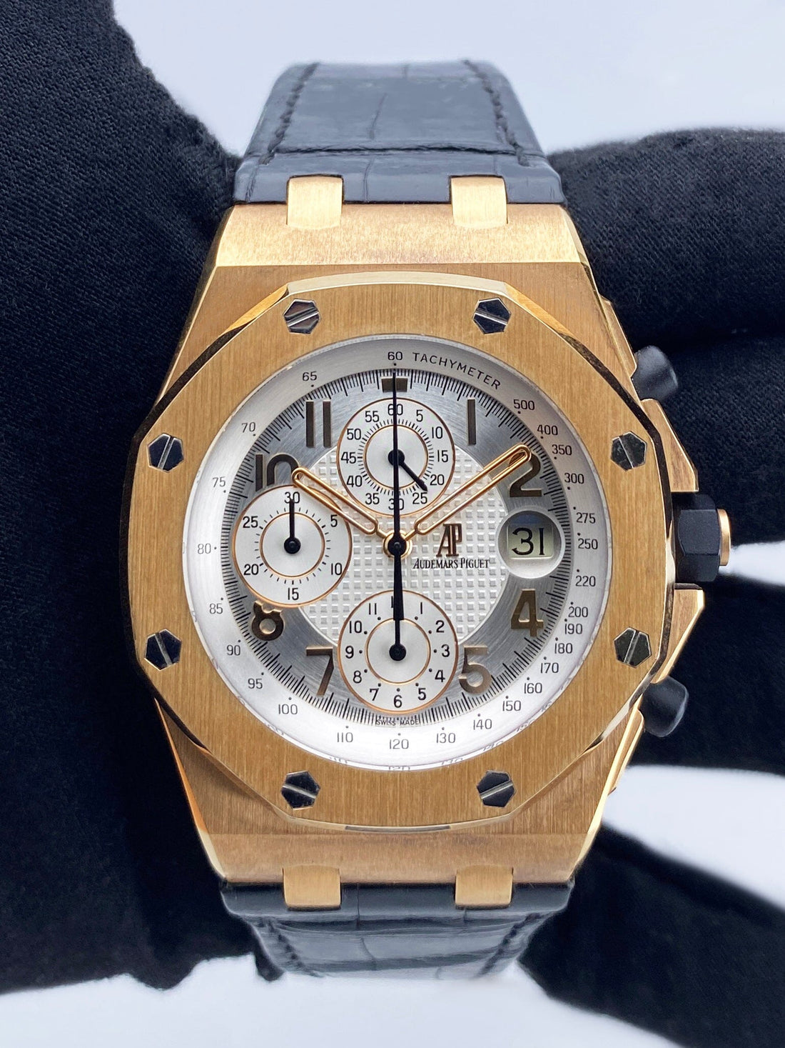 Audemars Piguet Royal Oak Offshore 26061OR.00.D002CR.01 Mens Watch. Pride of Russia. 44mm 18K rose gold case. 18K rose gold octagon shaped bezel. Silver Tapisserie dial with luminous rose gold hands and Arabic numeral hour markers. It includes chronograph functions, small seconds, and a date display at the 3 o'clock position. Black leather strap with 18K rose gold deployment buckle. Will fit up to a 7.5-inch wrist. Sapphire crystal. 18K rose gold case back. Automatic self-winding movement. This watch comes with original Box and Papers. This watch is a limited edition of 200 pieces