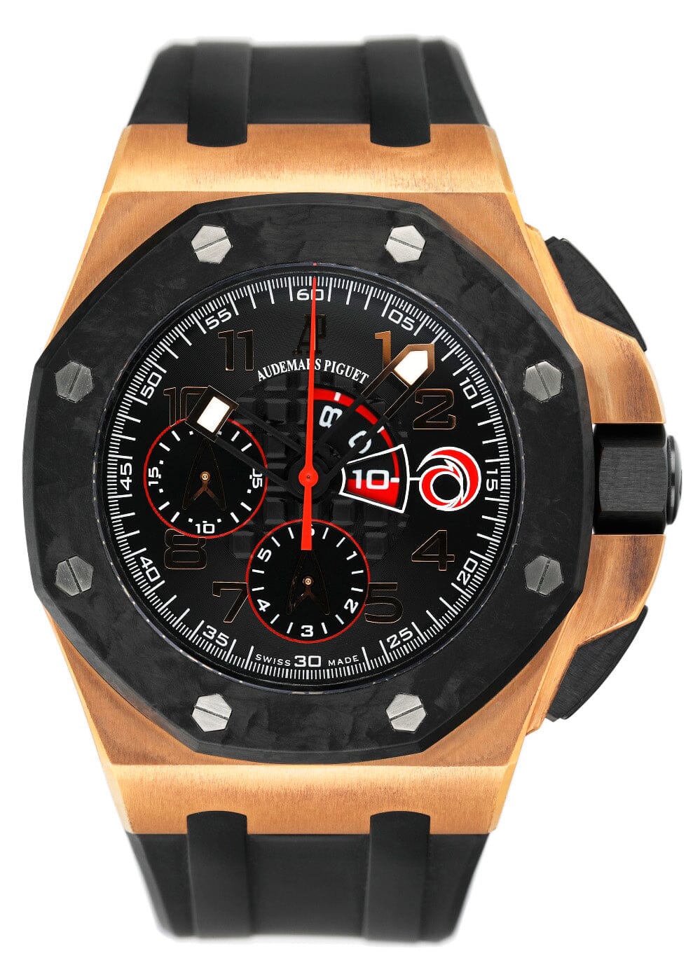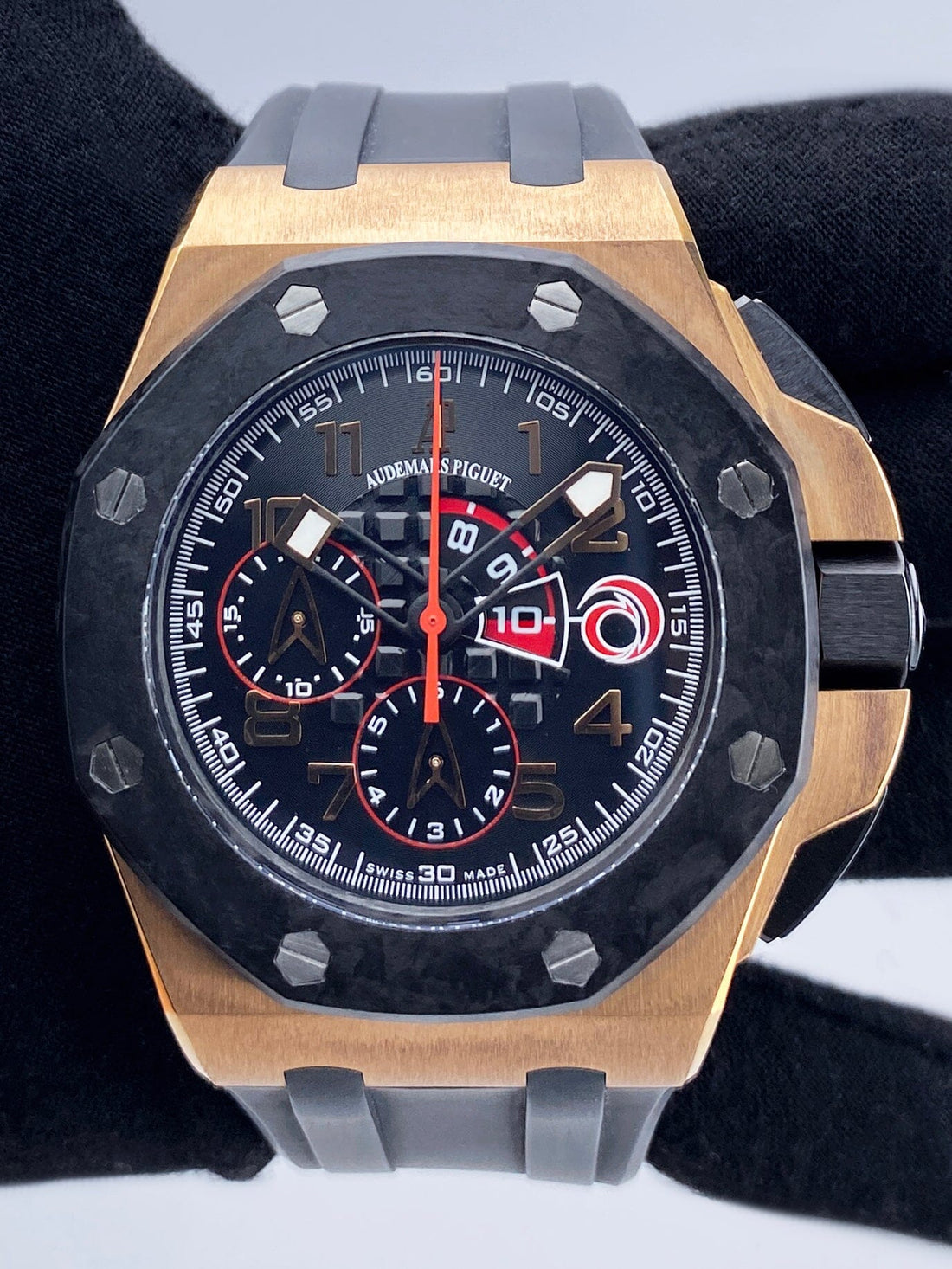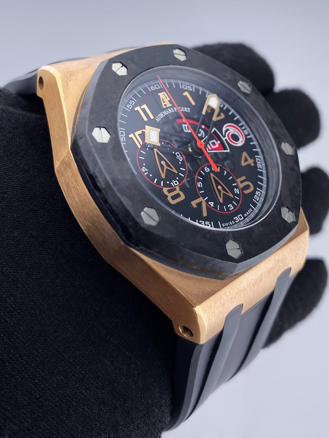 Audemars Piguet Royal Oak Offshore 26062OR.OO.A002CA.01 Alinghi Team Mens Watch. 44mm 18K rose gold case. Carbon octagon shaped bezel. Black Mega Tapisserie dial with luminous two-tone hands and Arabic numeral hour markers. It includes chronograph functions, a flyback function, and a regatta timer with a 10-minute countdown. Black rubber strap with 18K rose gold buckle. Will fit up to a 7.5-inch wrist. Sapphire crystal. 18K rose gold case back. Automatic self-winding movement. This watch comes with original Box and Papers.