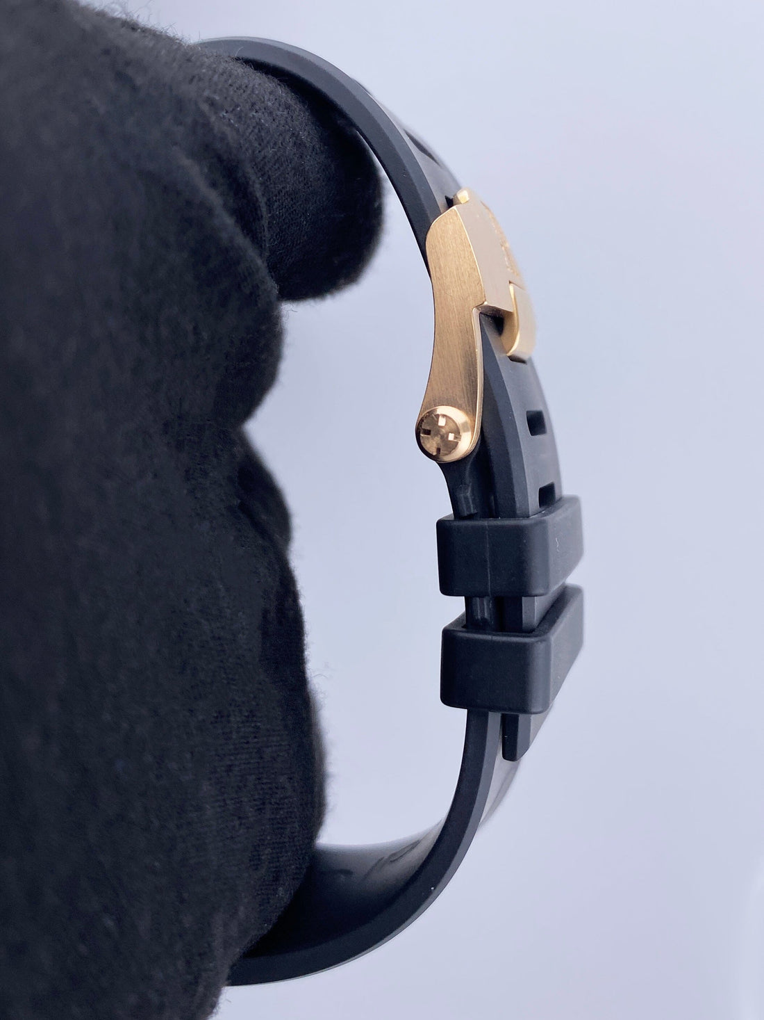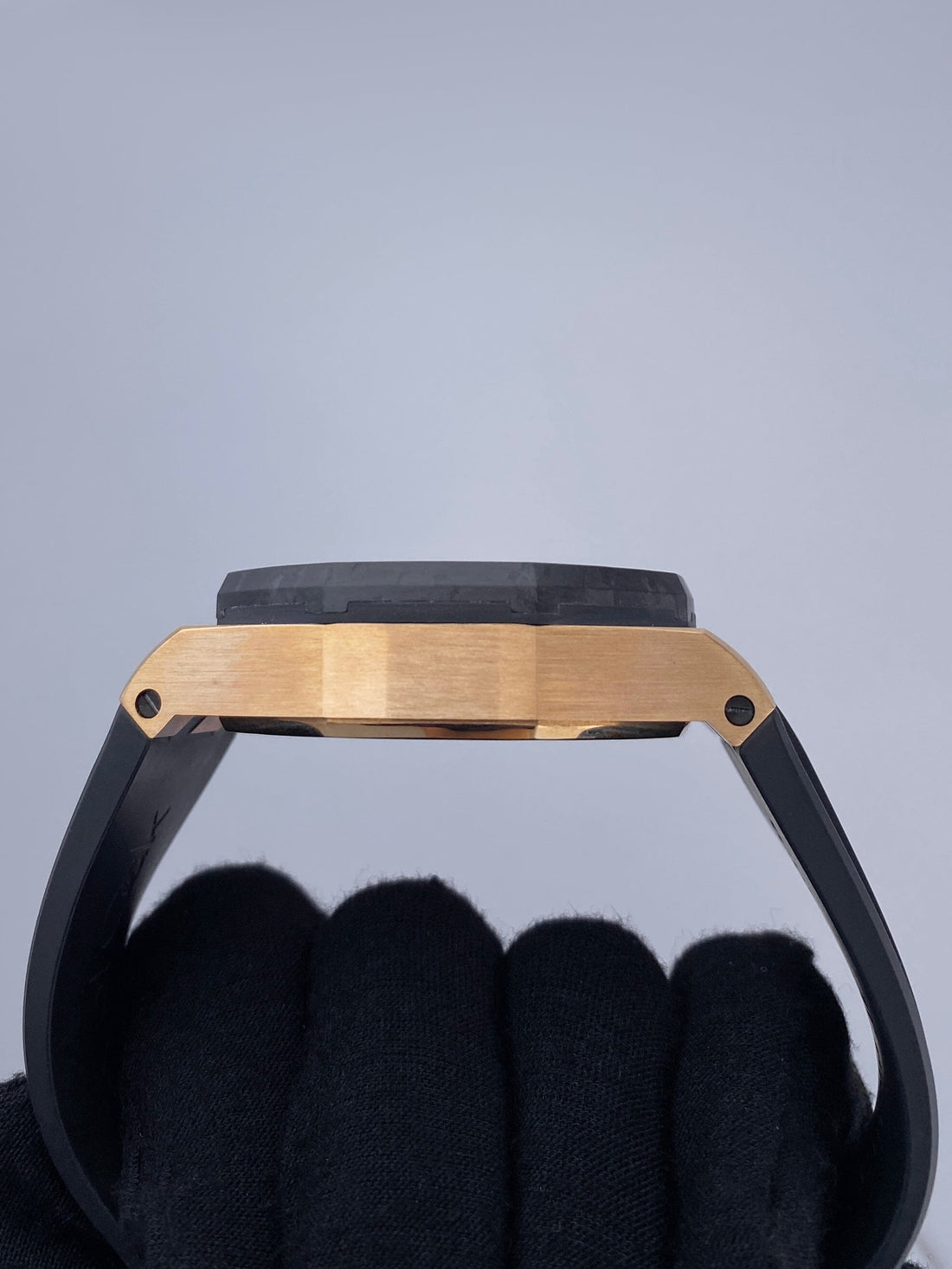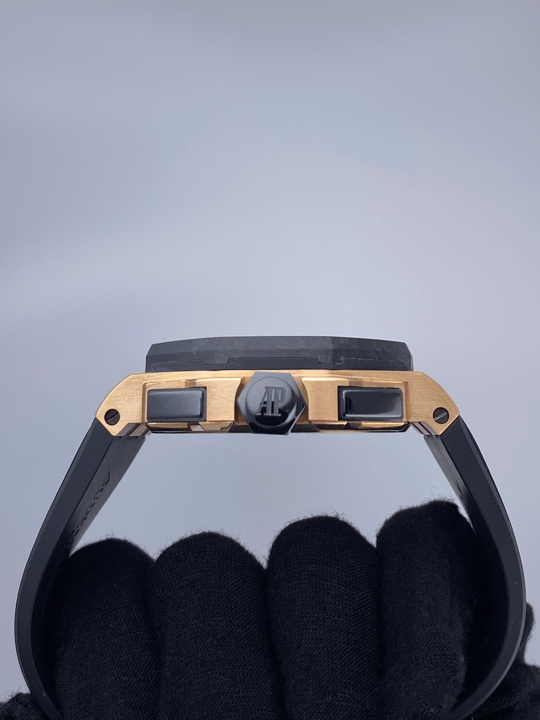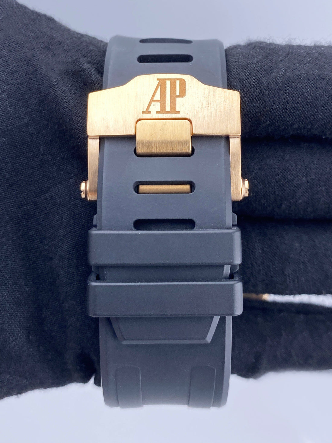 Audemars Piguet Royal Oak Offshore 26062OR.OO.A002CA.01 Alinghi Team Mens Watch. 44mm 18K rose gold case. Carbon octagon shaped bezel. Black Mega Tapisserie dial with luminous two-tone hands and Arabic numeral hour markers. It includes chronograph functions, a flyback function, and a regatta timer with a 10-minute countdown. Black rubber strap with 18K rose gold buckle. Will fit up to a 7.5-inch wrist. Sapphire crystal. 18K rose gold case back. Automatic self-winding movement. This watch comes with original Box and Papers.