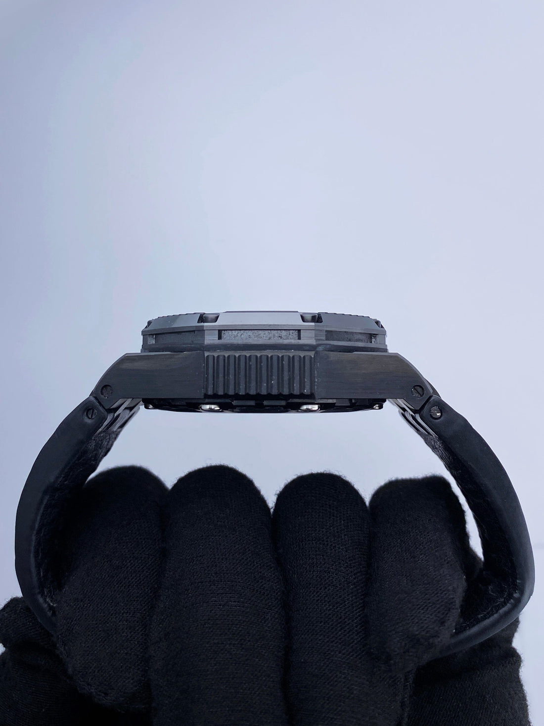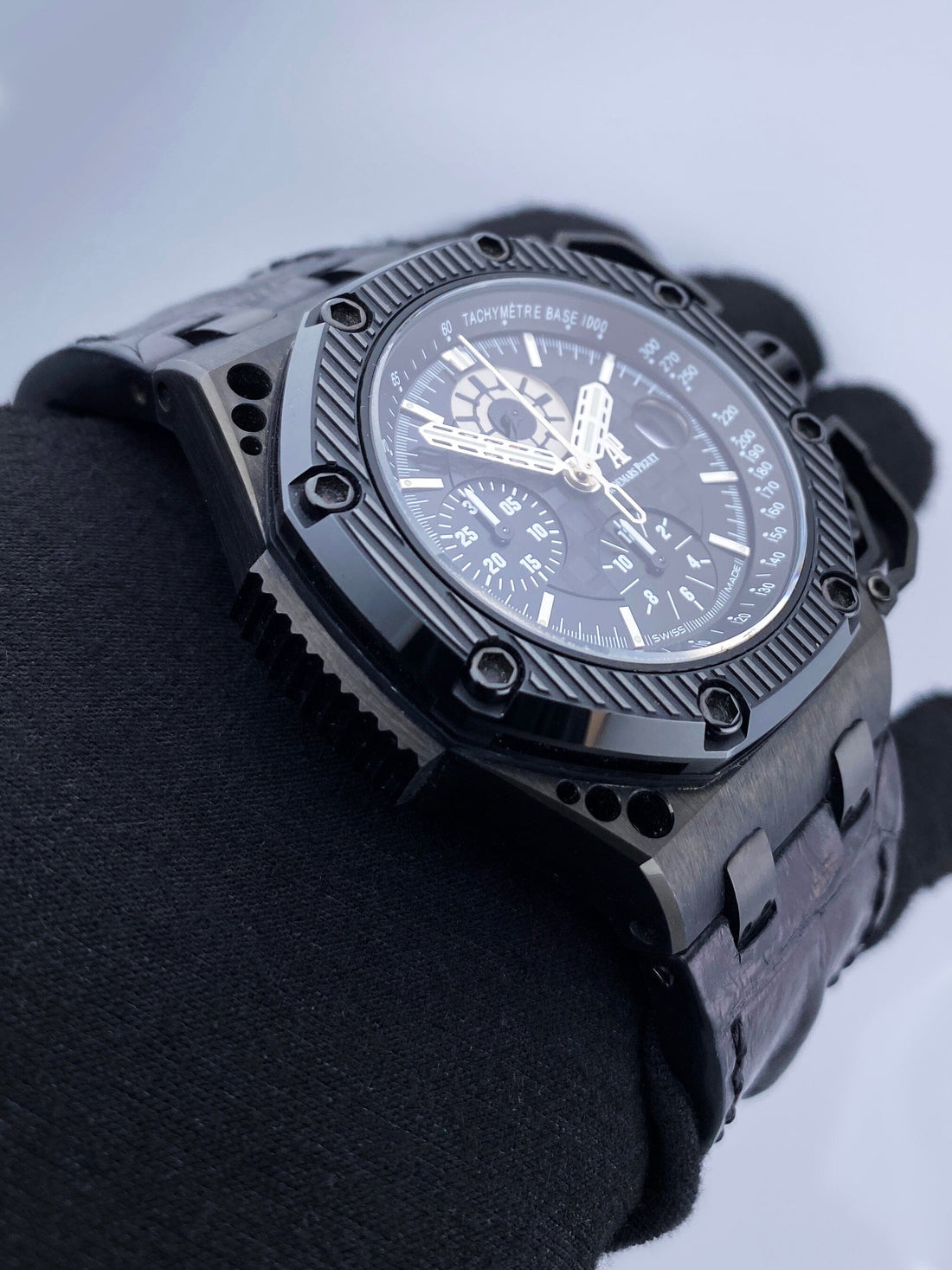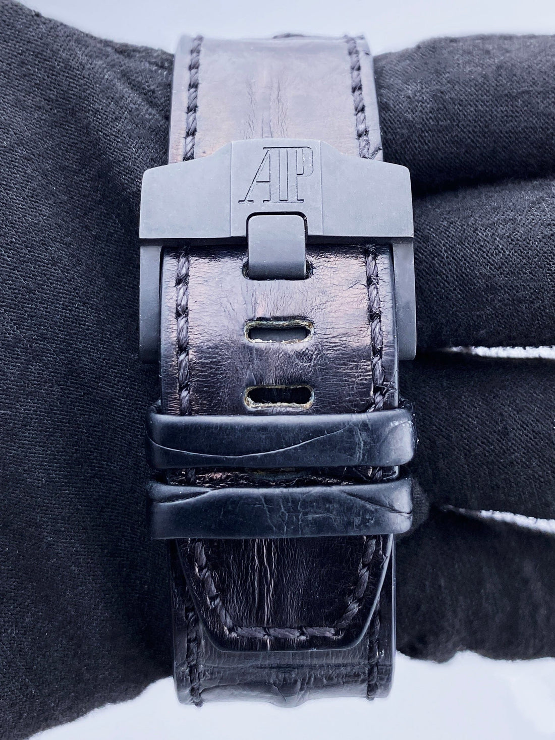 Audemars Piguet Royal Oak Offshore 26165IO.OO.A002CA.01 Mens Watch. 42mm titanium case. Ceramic octagon shaped bezel. Black Mega Tapisserie dial with luminous silver-tone hands and index hour markers. The date is displayed at 3 o'clock. Three sub-dials. Small seconds hand at 12 o'clock. 30-minute counter at 9 o'clock. 12-hour counter at 6 o'clock. Black leather strap with titanium buckle. Will fit up to a 8-inch wrist. Sapphire crystal. Titanium case back. Automatic self-winding movement.