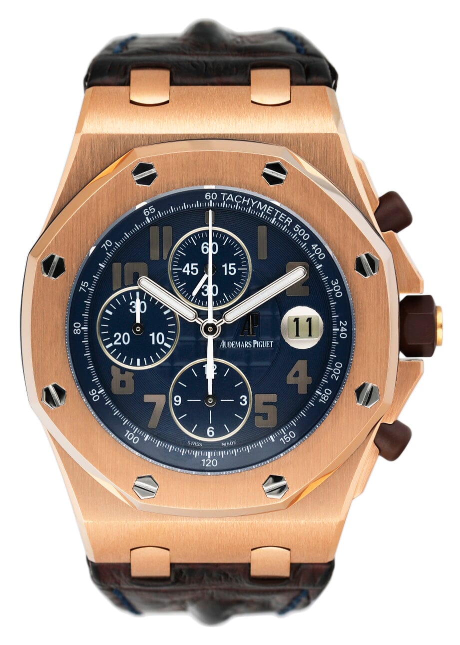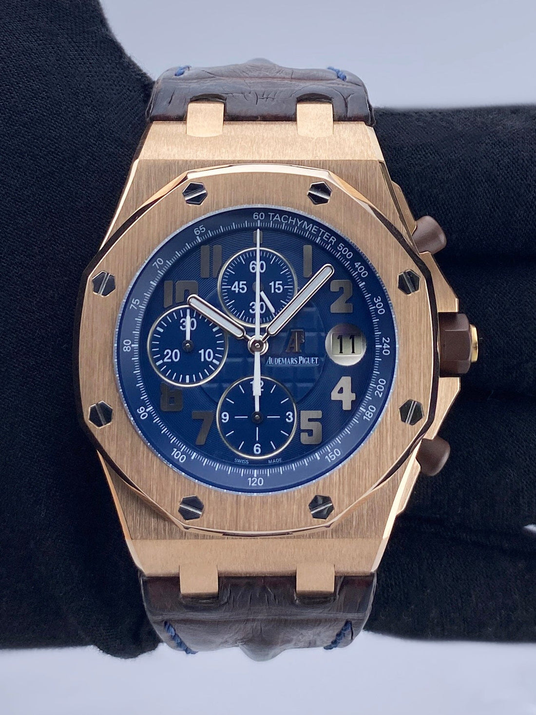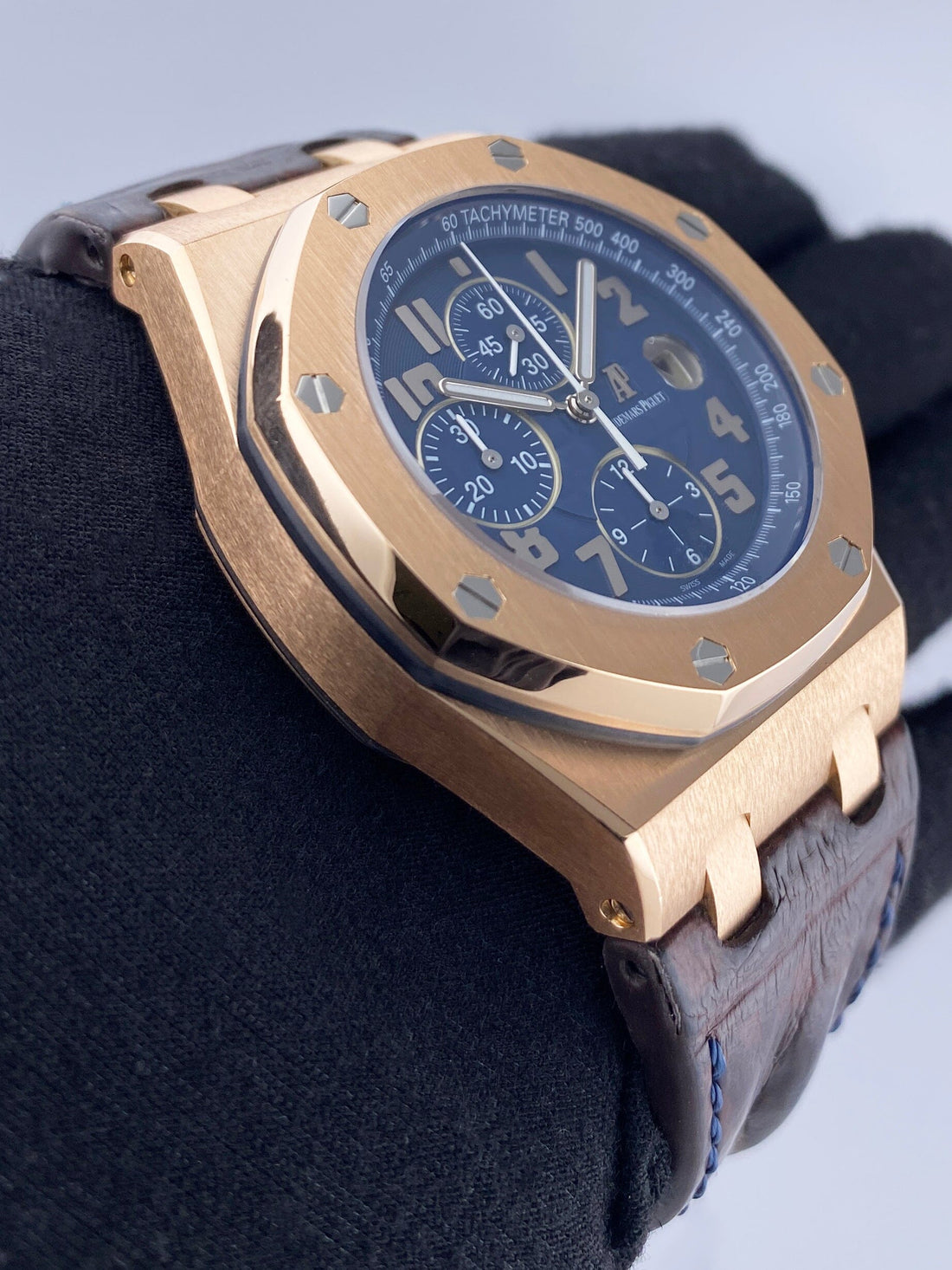 Audemars Piguet Royal Oak Offshore 26365OR.OO.D801CR.01 Pride of Argentina Mens Watch. 44mm 18K rose gold case. 18K rose gold octagon shaped bezel. Blue Mega Tapisserie dial with luminous silver-tone hands and Arabic numeral hour markers. It includes chronograph functions, small seconds at the 6 o'clock position, and a date display. Brown leather strap with 18K rose gold deployment buckle. Will fit up to a 7.5-inch wrist. Sapphire crystal. 18K rose gold case back. Automatic self-winding movement. This watch comes with Archives.