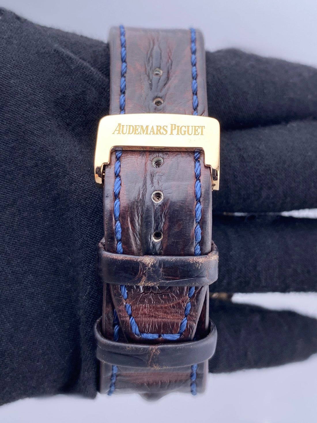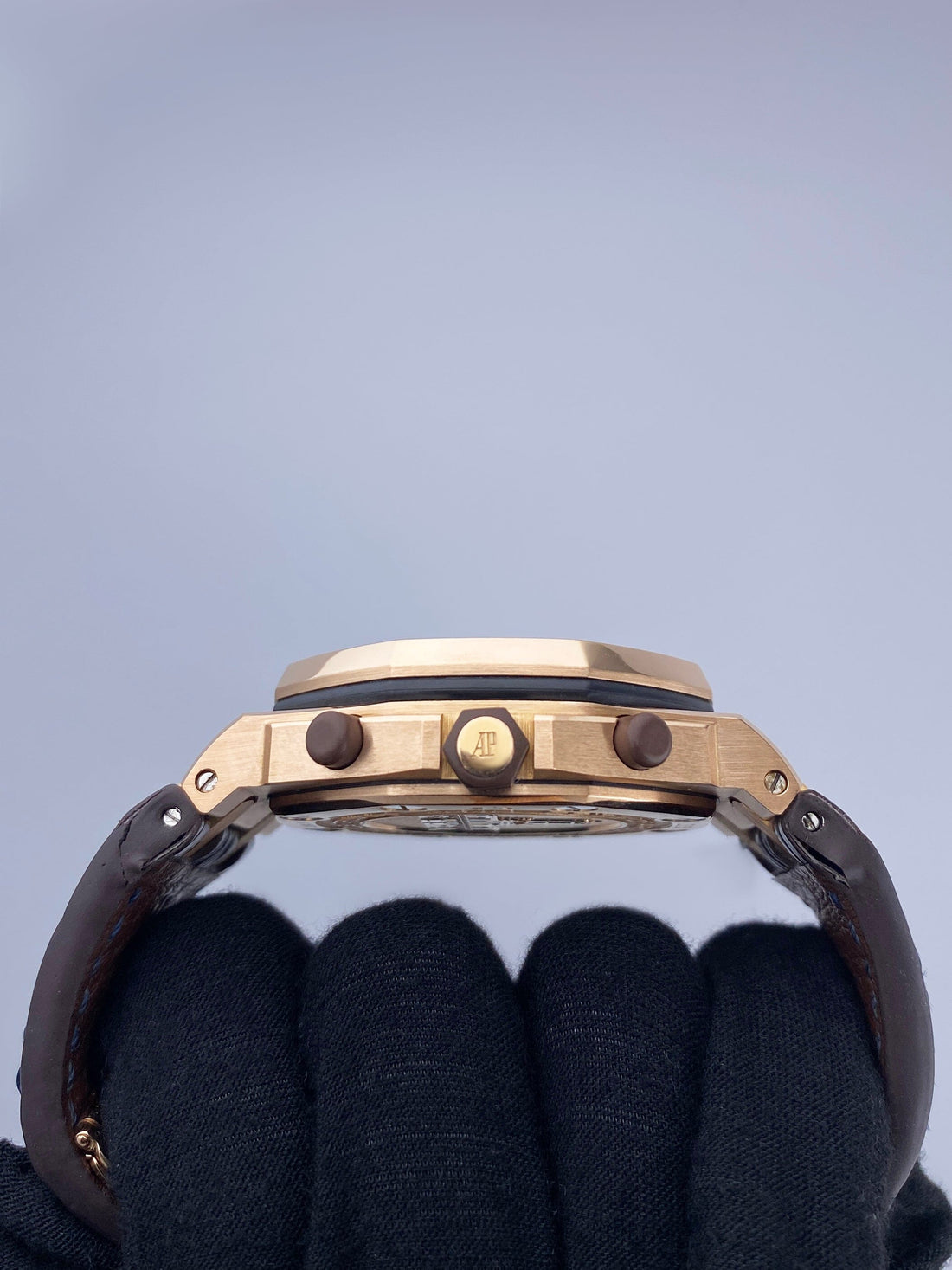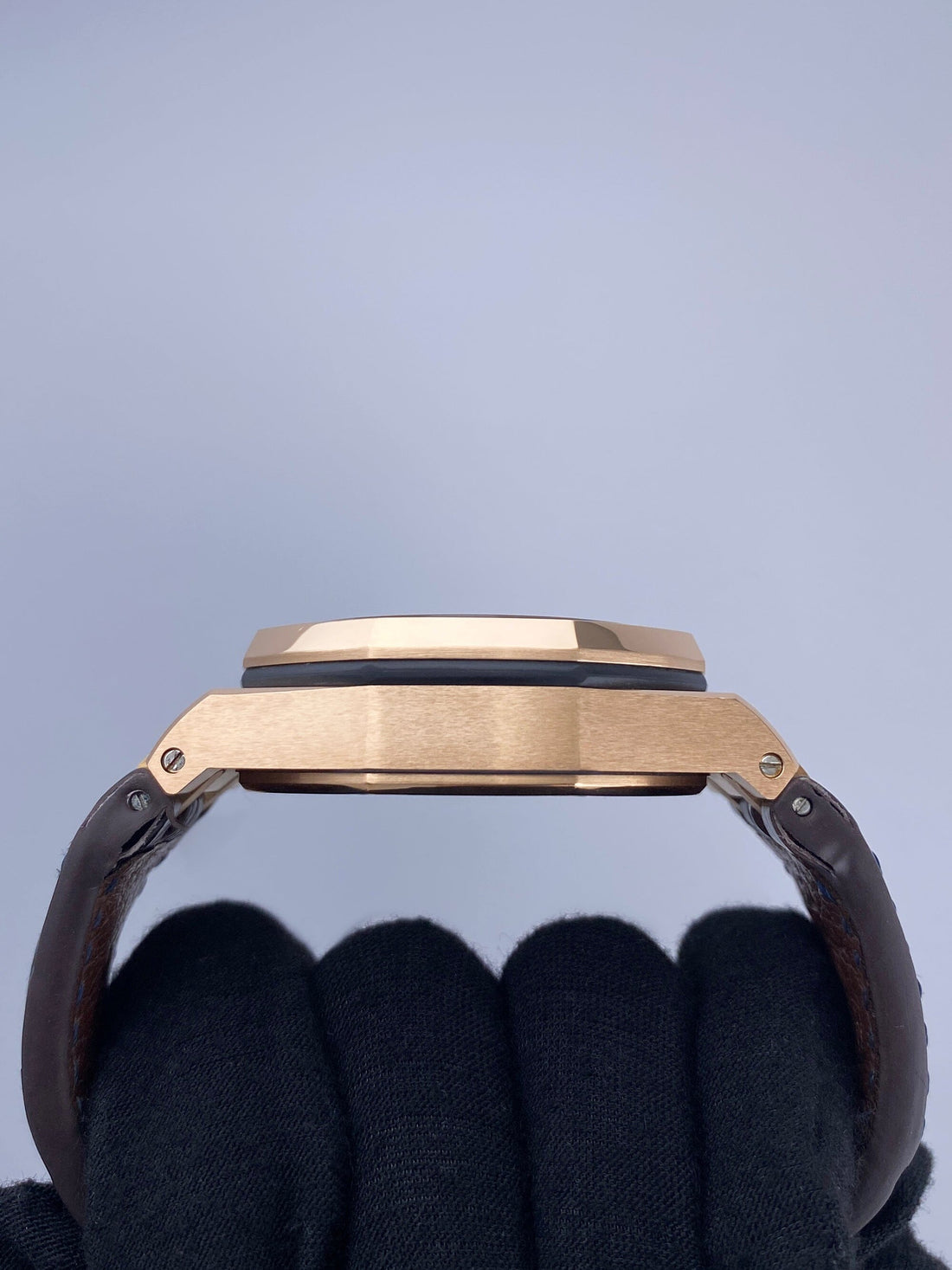 Audemars Piguet Royal Oak Offshore 26365OR.OO.D801CR.01 Pride of Argentina Mens Watch. 44mm 18K rose gold case. 18K rose gold octagon shaped bezel. Blue Mega Tapisserie dial with luminous silver-tone hands and Arabic numeral hour markers. It includes chronograph functions, small seconds at the 6 o'clock position, and a date display. Brown leather strap with 18K rose gold deployment buckle. Will fit up to a 7.5-inch wrist. Sapphire crystal. 18K rose gold case back. Automatic self-winding movement. This watch comes with Archives.