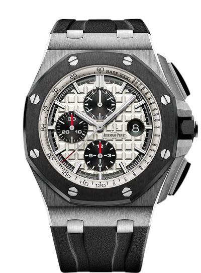 Audemars Piguet Royal Oak Offshore 26400SO.OO.A002CA.01 Mens Watch. 44mm stainless steel case. Black ceramic bezel. Silver-toned dial with “Méga Tapisserie†pattern, gold tone hands and hour-markers. Silver-toned inner bezel ring. Three chronograph subdials with black counters displaying small seconds, 30 minutes, and 12 hours. Minute markers around the outer dial. Date display at the 3 o'clock position. Black rubber strap with stainless steel buckle. Sapphire crystal. Calibre 3126 automatic self-winding movement with a 50-hour power reserve. Original Box and Papers.