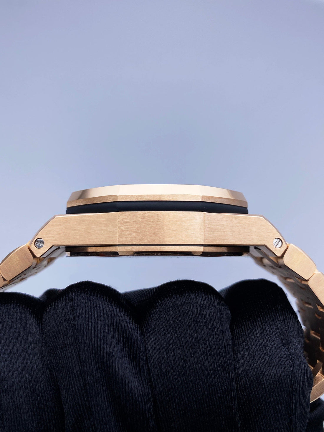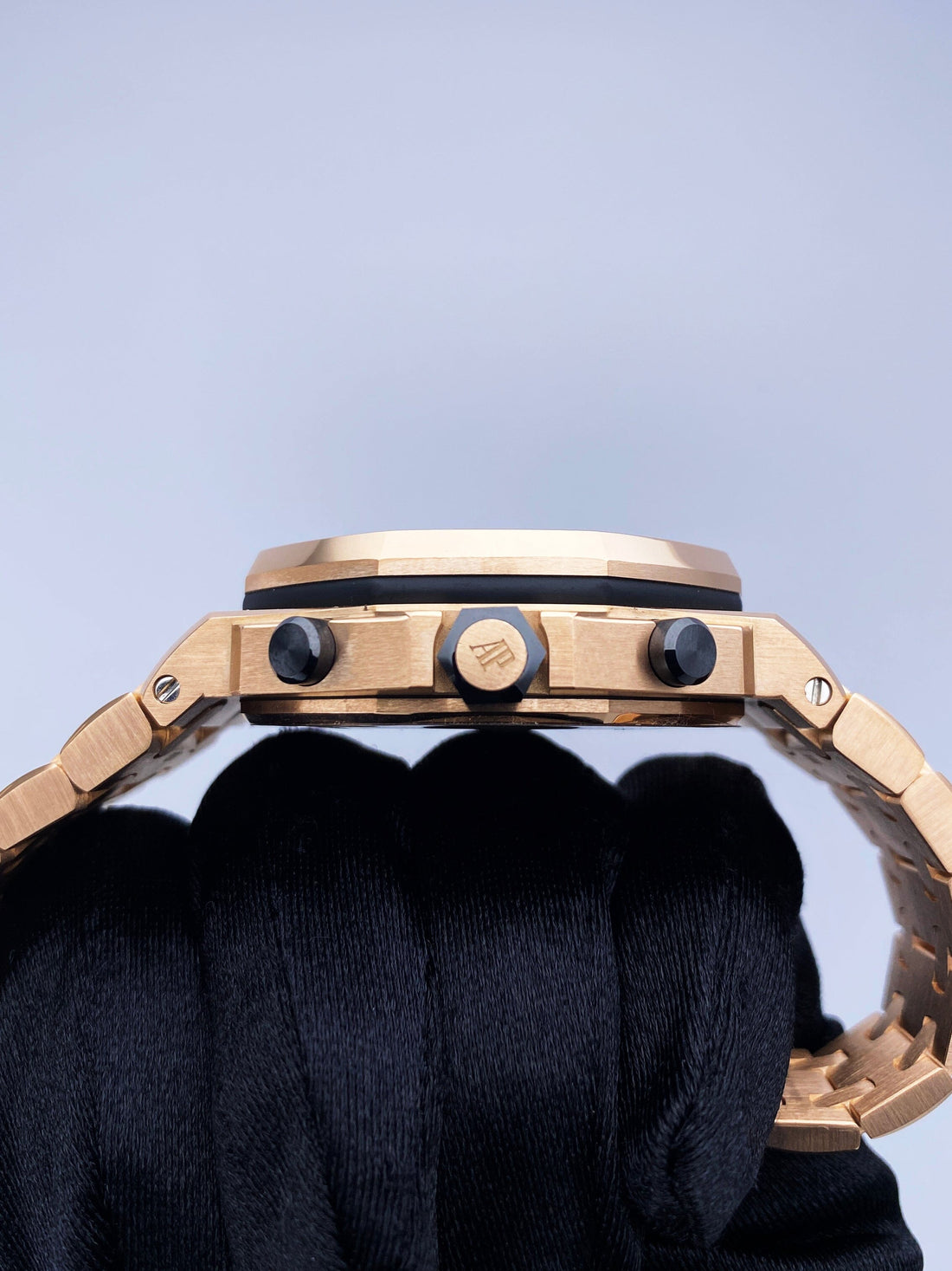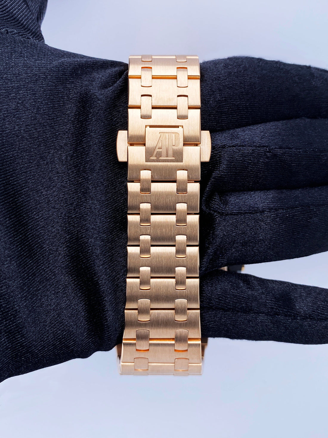 Audemars Piguet Royal Oak Offshore 26470OR.OO.1000OR.02 Mens Watch. 42mm 18K rose gold case. 18K rose gold octagon shaped bezel. Rose gold-toned Tapisserie dial with luminous rose gold hands and Arabic numeral hour markers. Date display at 3 o'clock. Three sub-dials. Small seconds hand at 12 o'clock. 30-minute counter at 9 o'clock. 12-hour counter at 6 o'clock. 18K rose gold bracelet with fold over clasp with double push button safety. Will fit up to a 7.5-inch wrist. Sapphire crystal. Transparent sapphire crystal case back. Automatic self-winding movement. This watch comes with original Box and Papers.