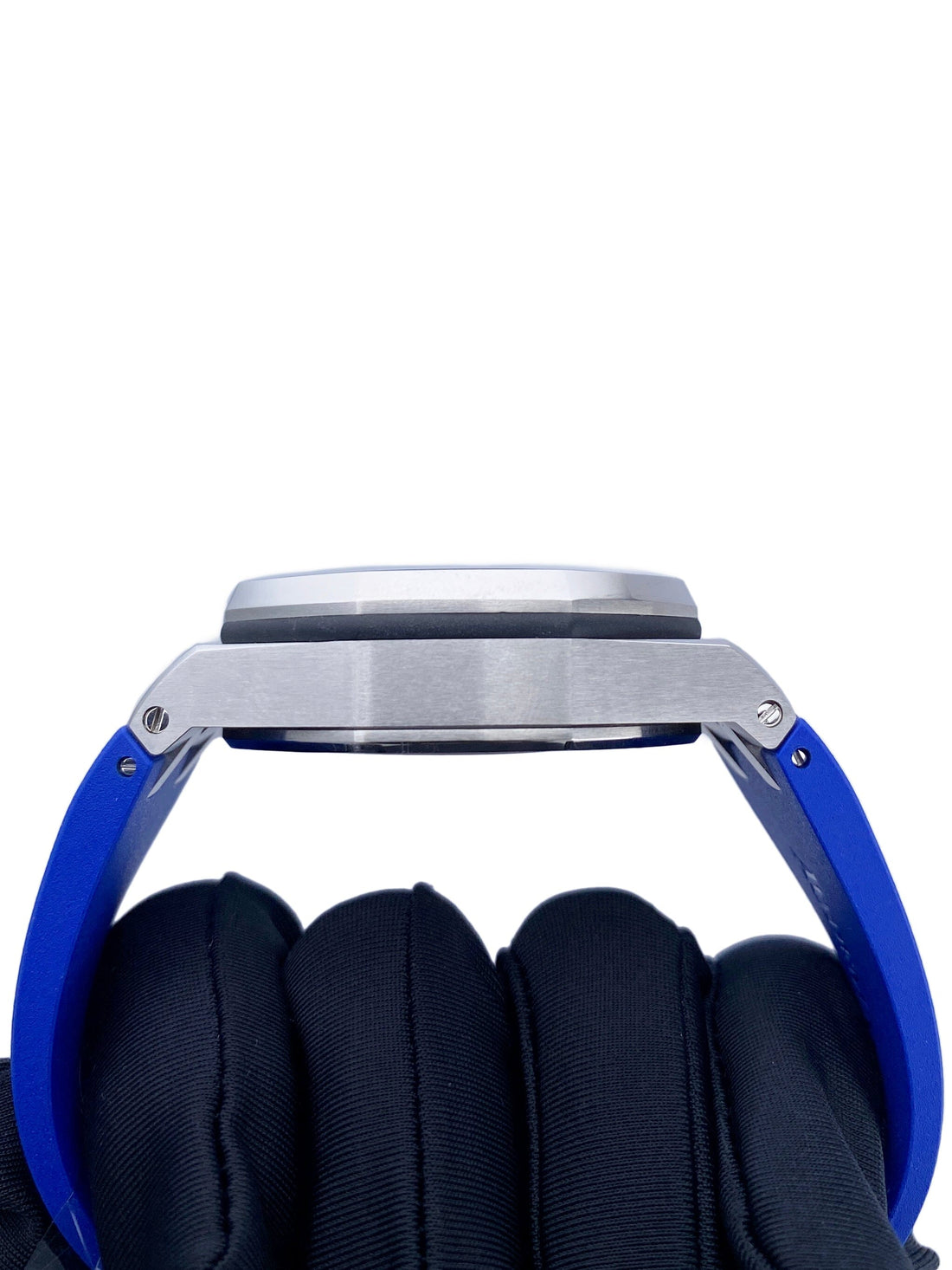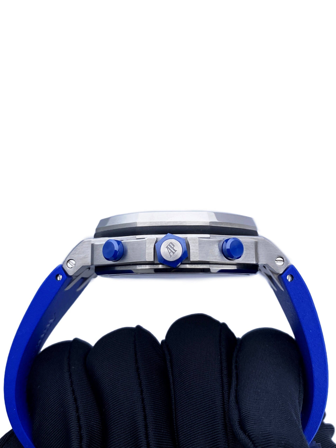 Audemars Piguet Royal Oak Offshore 26470ST.OO.A030CA.01 Mens Watch. 42mm stainless steel case. Stainless steel octagon shaped bezel. Blue Indigo Mega Tapisserie dial with luminous steel hands and Arabic numeral hour markers. The date is displayed at 3 o'clock. Three sub-dials. Small seconds hand at 12 o'clock. 30-minute counter at 9 o'clock. 12-hour counter at 6 o'clock. Blue rubber strap with stainless steel buckle. Will fit up to a 7.5-inch wrist. Sapphire crystal. Transparent sapphire crystal case back. Automatic self-winding movement. This watch comes with original Papers.