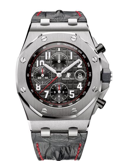 Audemars Piguet Royal Oak Offshore 26470ST.OO.A101CR.01 Men's Watch. 42mm stainless steel case with a stationary bezel. Black dial with “Méga Tapisserie†pattern, white gold hands and white Arabic numerals. Tachymeter markings around the outer dial. Date display at the 3 o'clock position. Three Chronograph sub-dials displaying 60 seconds, 30 minutes and 12 hours. Black Hornback Alligator leather strap with stainless steel buckle. Sapphire crystal and clear case back. Calibre 3126 automatic self-winding movement with a 50-hour power reserve. Original Box and Papers.