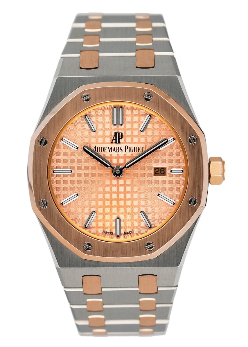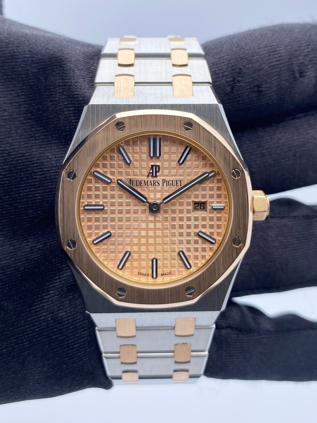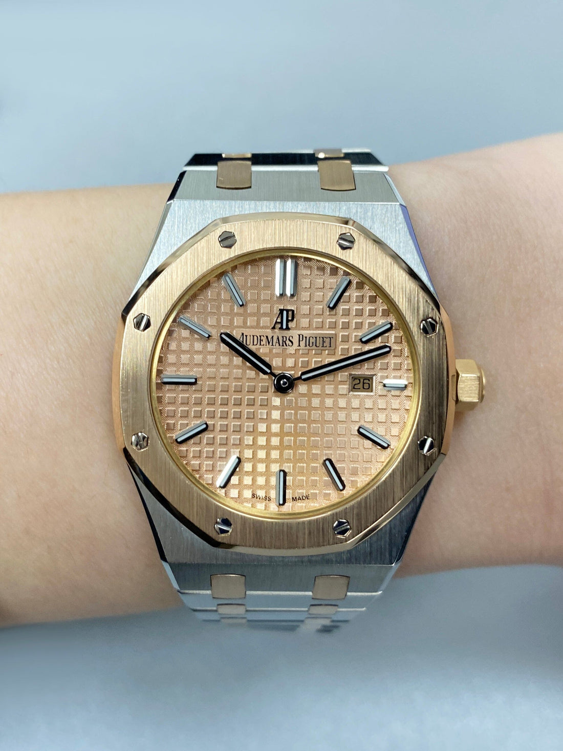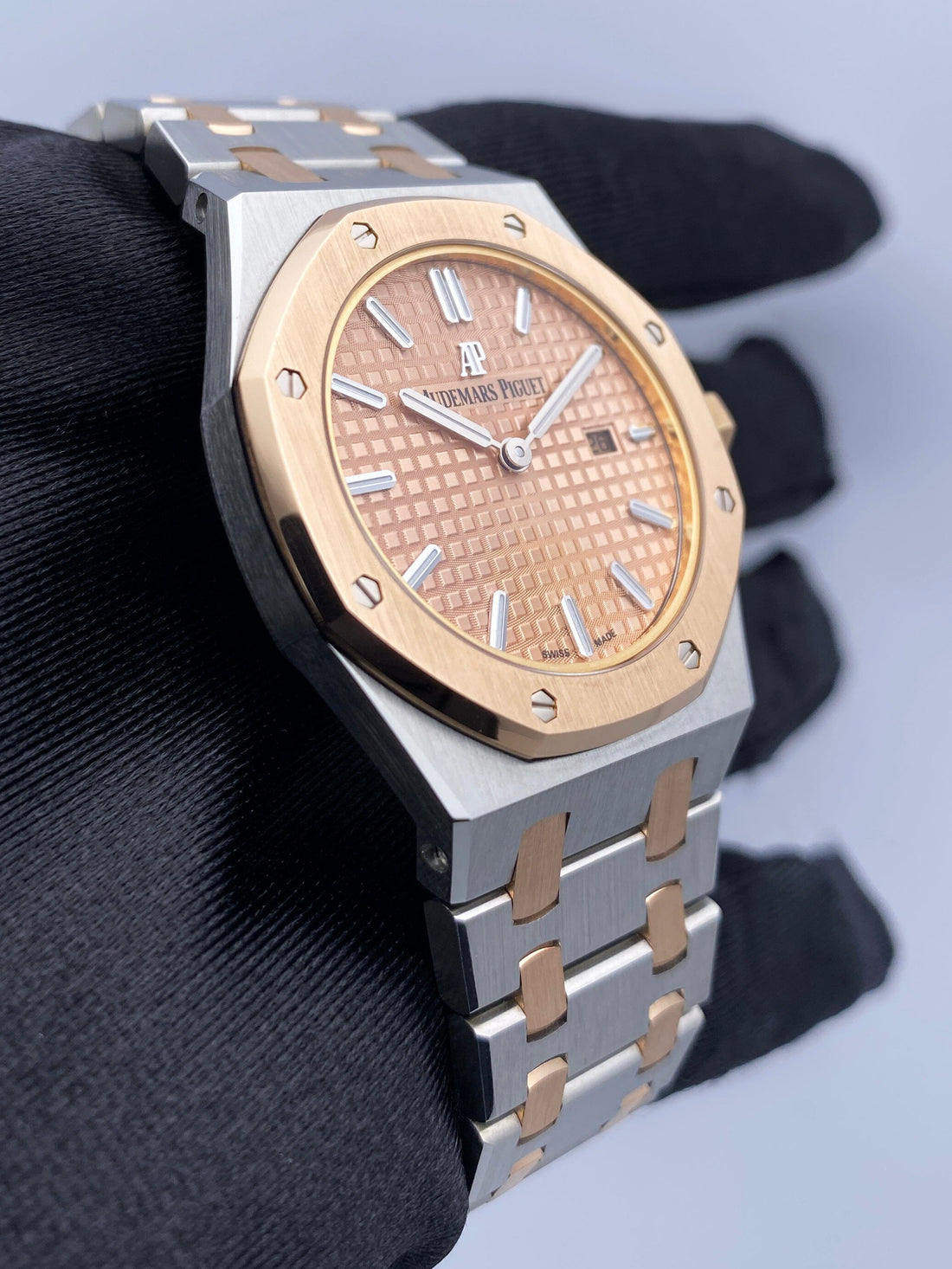 Audemars Piguet Royal Oak 67650SR.OO.1261SR.01 Watch. 33mm stainless steel case. 18K rose gold octagon-shaped bezel. Pink tapisserie dial with luminous steel hands and index hour markers. The date is displayed at 3 o'clock position. 18K rose gold & stainless steel bracelet with fold over clasp with double push button safety. Will fit up to a 6-inch wrist. Sapphire crystal. Stainless steel case back. Quartz: Battery powered movement. This watch comes with an original Paper.