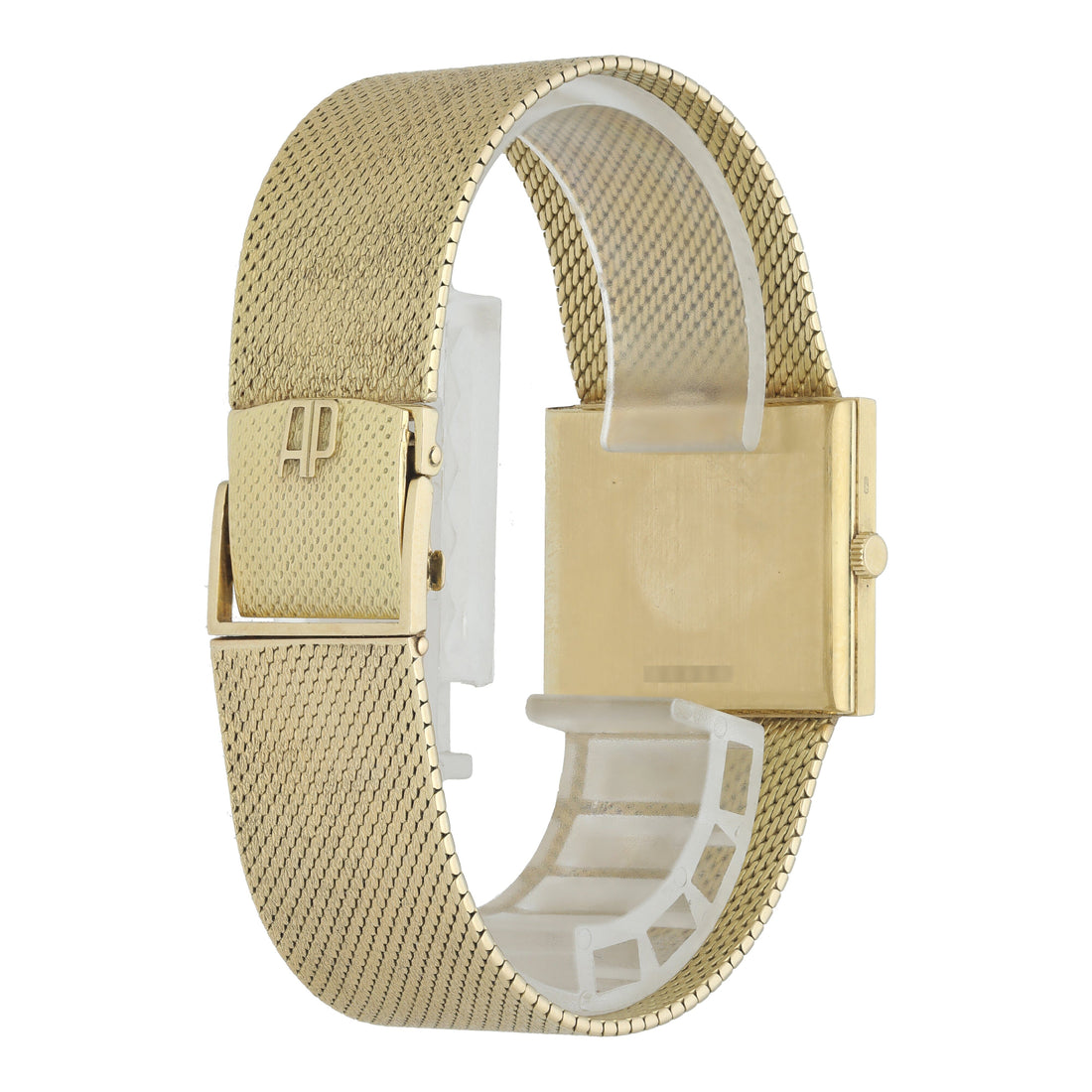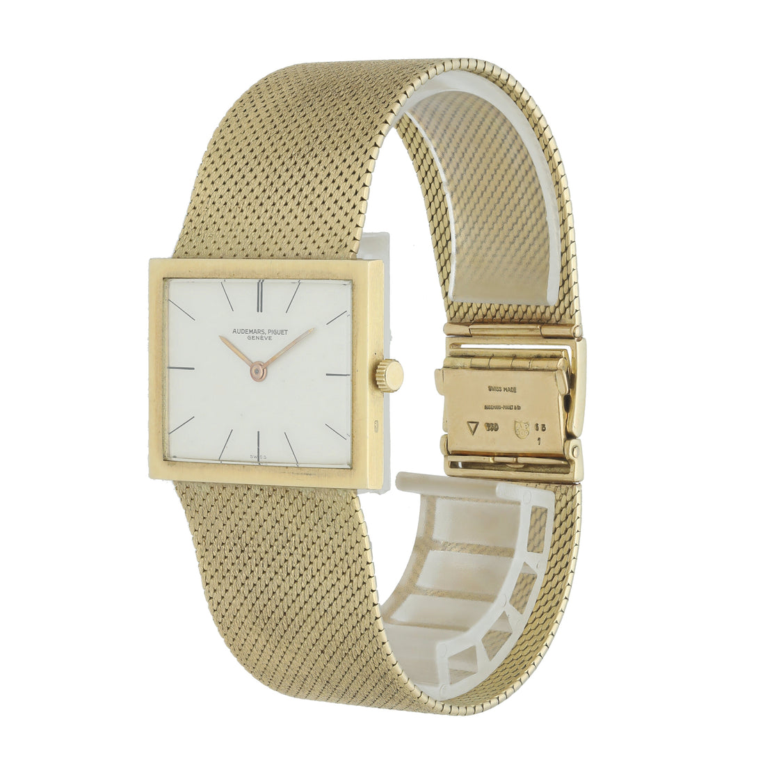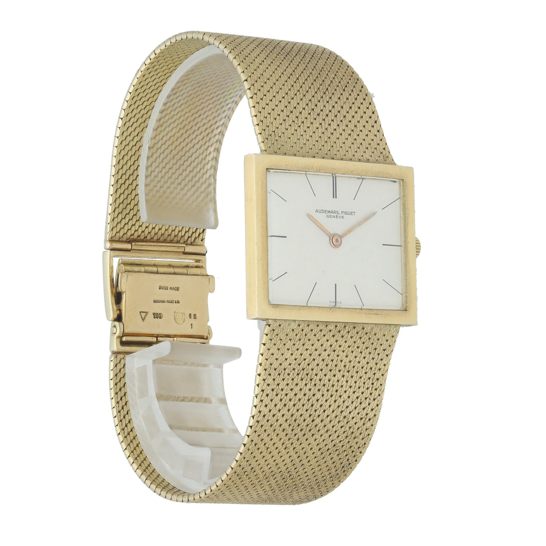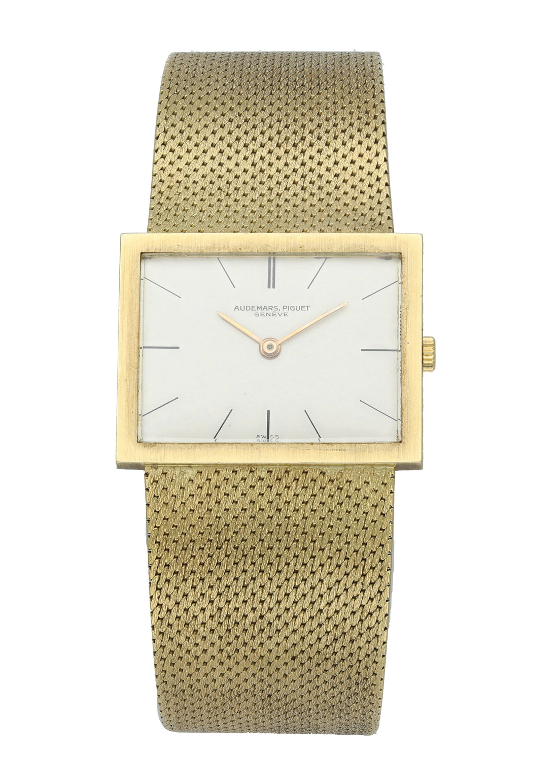 Audemars Piguet Ultra-Thin Vintage Yellow Gold Watch. 29mm ultra-thin yellow gold case with yellow gold bezel. White dial with gold hands and black index hour markers. Yellow gold mesh bracelet with an adjustable Jewelry clasp Will fit up to a 7-inch wrist. Circa 1970s. Sapphire crystal, yellow gold case back. Mechanical hand-winding movement. This watch is backed by our two year warranty