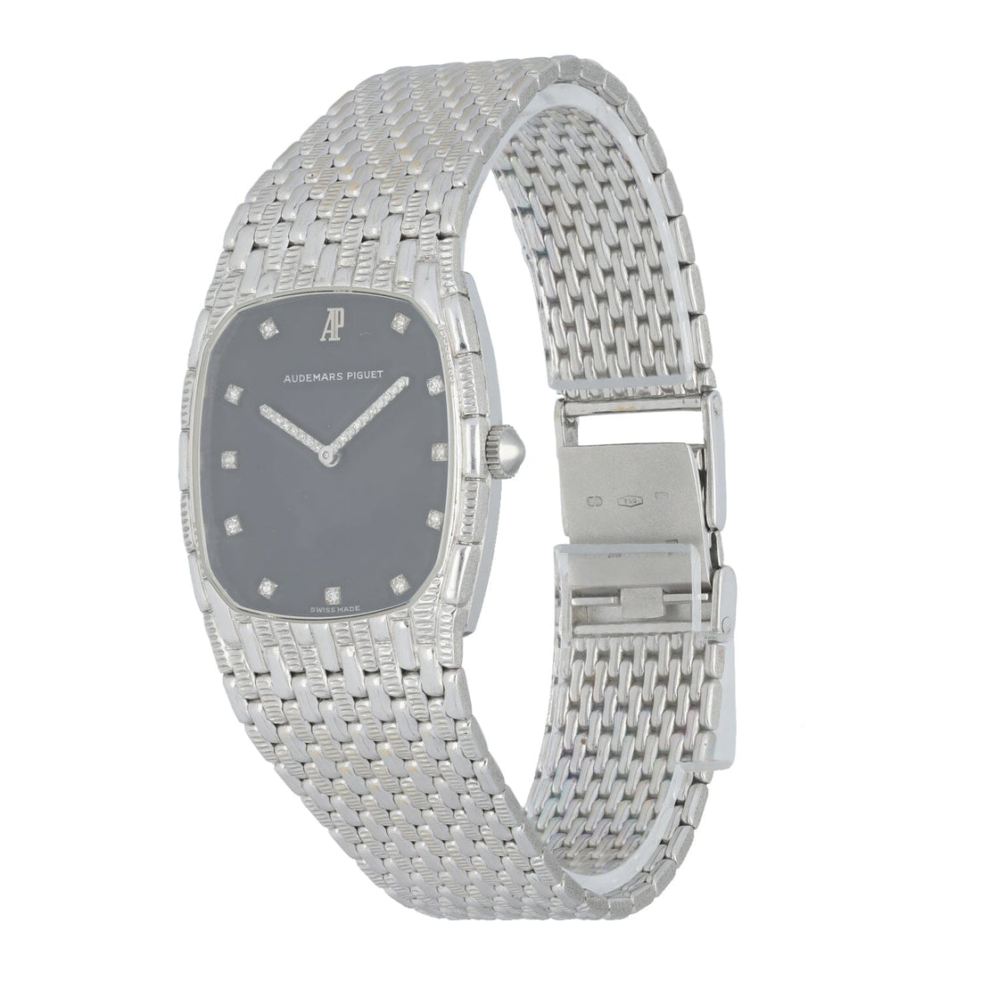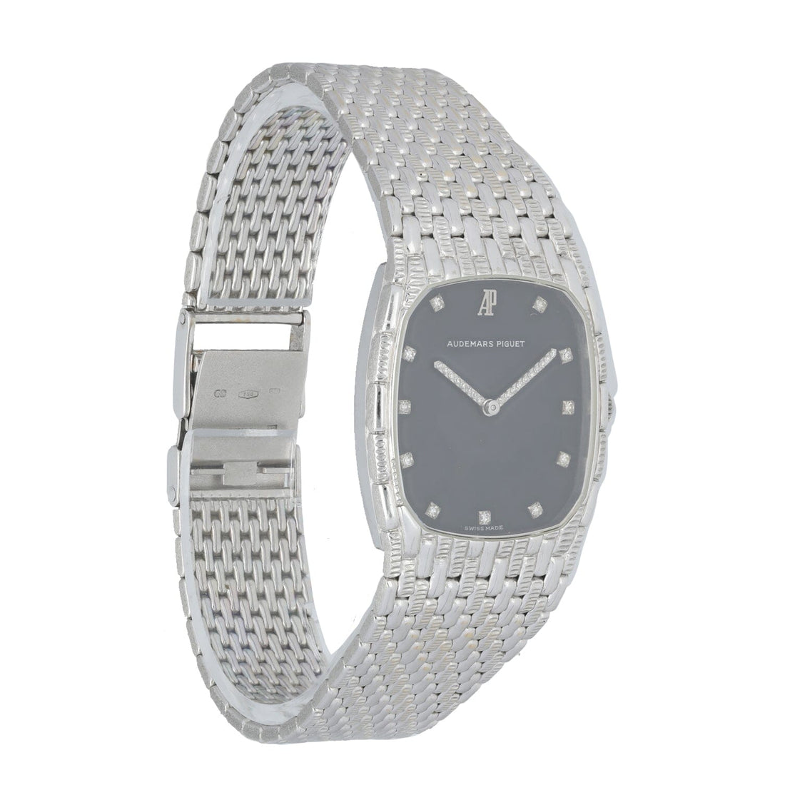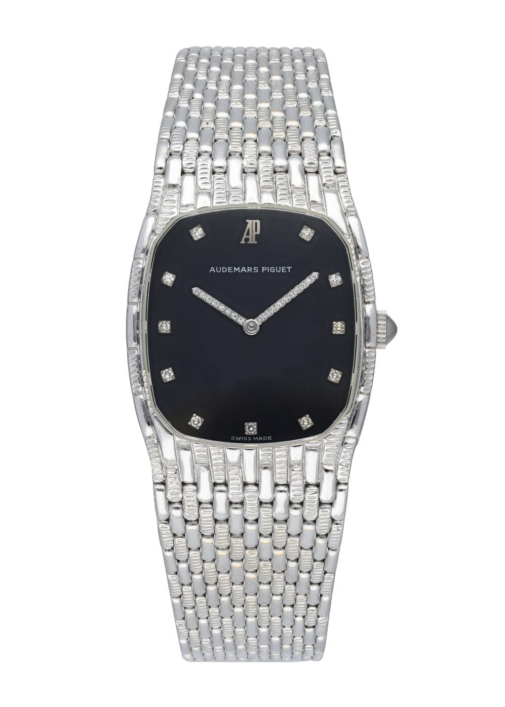 Audemars Piguet Ladies Watch. 27mm 18K white gold case with factory design bezel. Black dial with original factory diamond set hands and original factory diamond set hour marker. 18K white gold AP mesh bracelet with jewelry clasp. Will fit up to 6.5-Inch wrist.Sapphire crystal. 18K white gold case back.