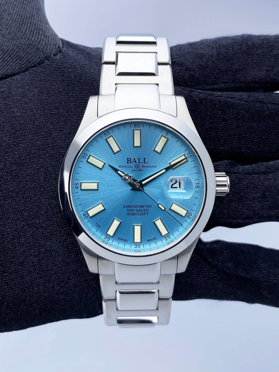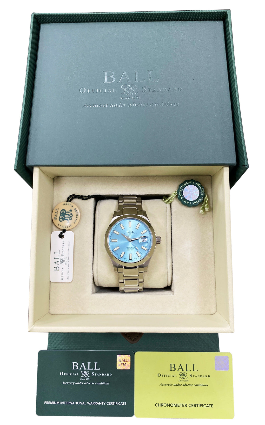 Brand New. BALL Engineer III Marvelight Chronometer NM9026C-S6CJ-IBE Watch. 40mm stainless steel case with stainless steel smooth bezel. Ice blue dial with luminous steel hands and index hour marker. Date display at 3 o'clock position. Stainless steel bracelet with hidden butterfly clasp. Will fit up to a 7-inch wrist. Sapphire crystal. Stainless steel case back. Automatic caliber BALL RR1103-C self-winding movement. This watch comes with original Box and Papers.