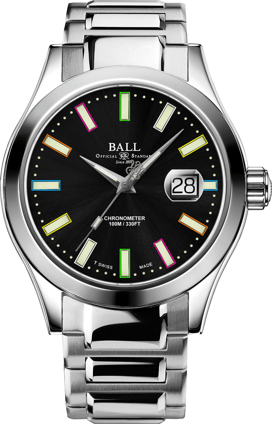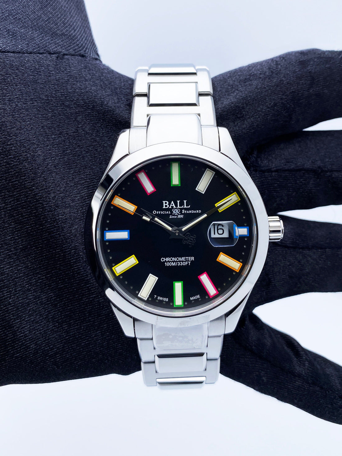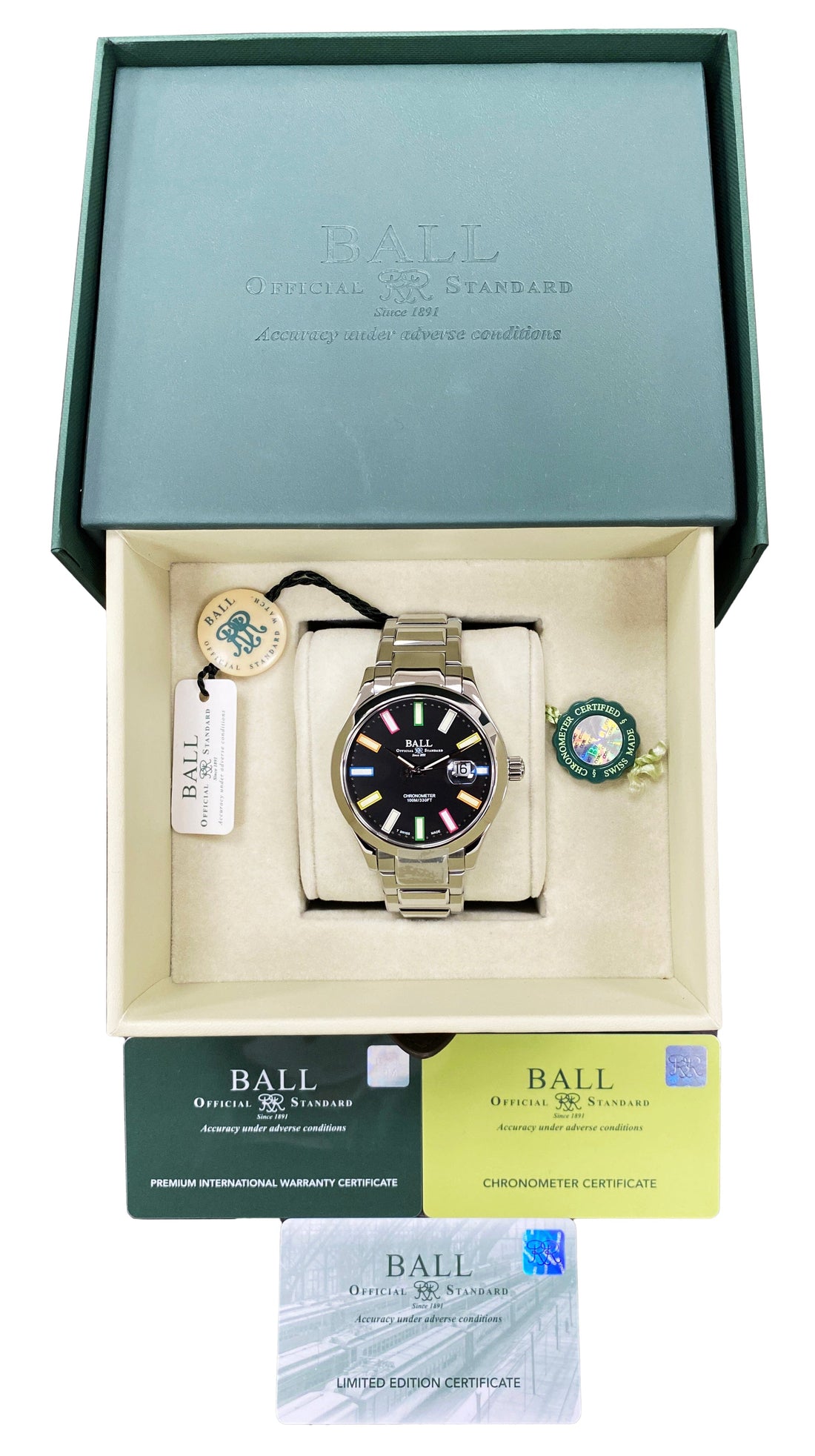 Brand New. BALL Engineer III Marvelight Chronometer Caring Edition NM9028C-S29C-BK Mens Watch. 43mm stainless steel case with stainless steel smooth bezel. Black dial with luminous steel hands and index hour marker. Date display at 3 o'clock position. Stainless steel bracelet with hidden butterfly clasp. Will fit up to a 7-inch wrist. Sapphire crystal. Stainless steel case back. Automatic caliber BALL RR1103-C self-winding movement. This watch comes with original Box and Papers.