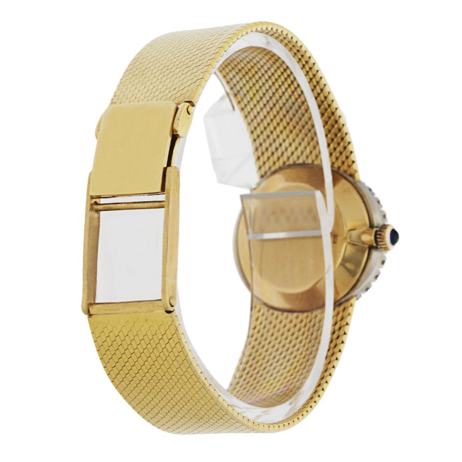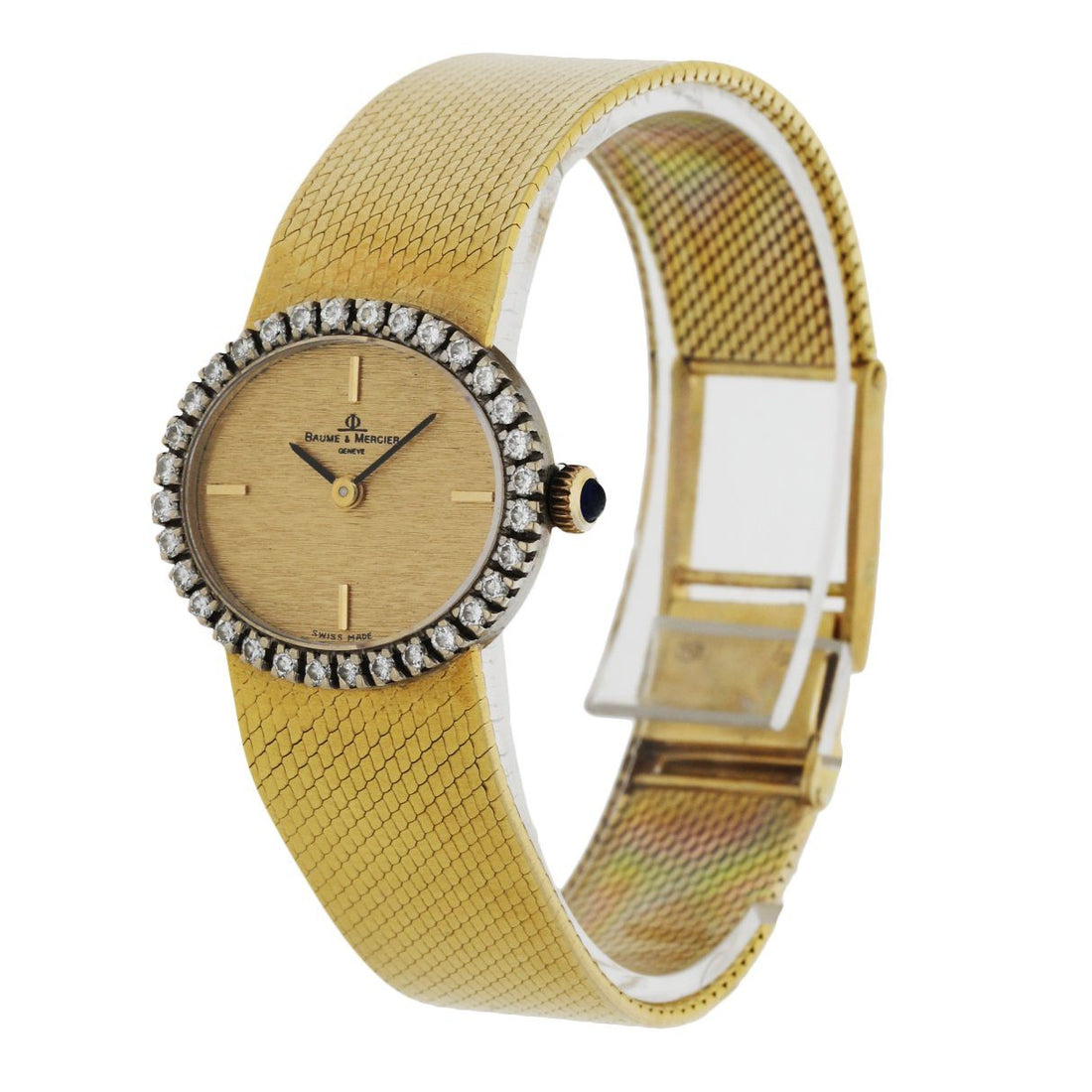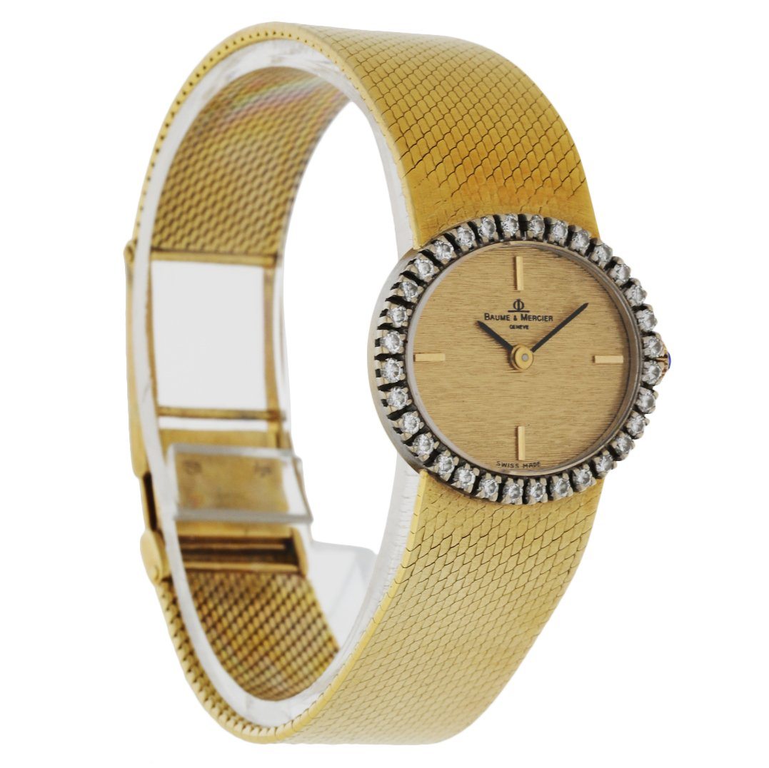 Baume & Mercier ladies watch. 25MM 18K yellow gold case with 18K yellow gold bezel with factory diamond set. Champagne dial with black steel hands and index markers. 18K yellow gold bracelet with jewelry clasp. Will fit up to 6.25-Inch wrist. Mechanical hand winding movement. Sapphire crystal, 18K yellow gold case back.