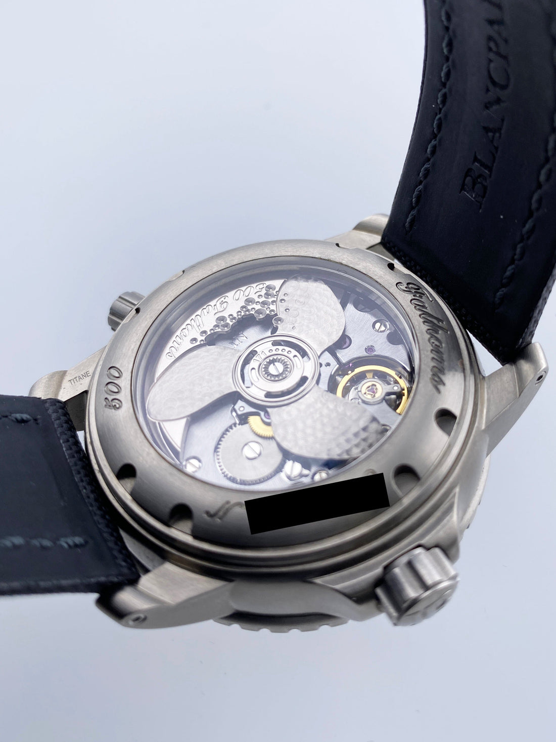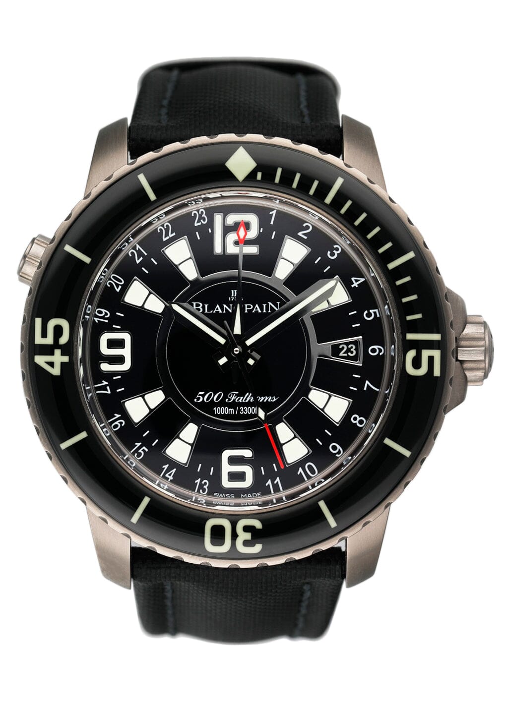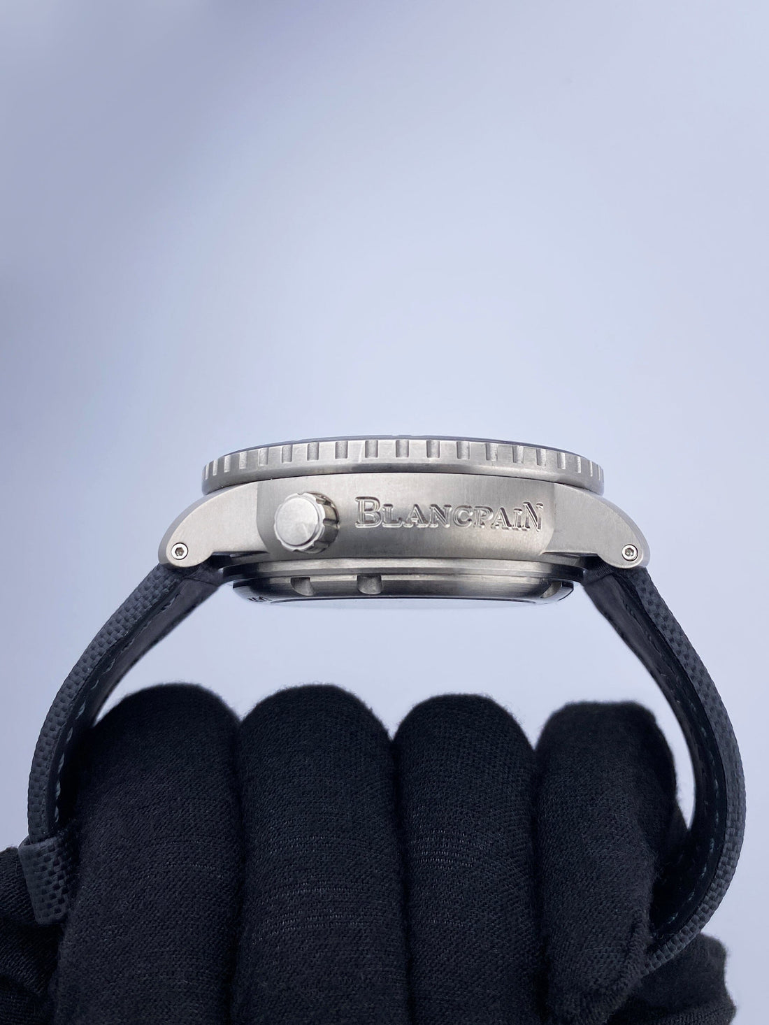 Blancpain 500 Fathoms GT 50021-12B30-52B Mens Watch. 48mm titanium case. Unidirectional rotating titanium bezel with black insert. Black dial with luminous hands and Arabic numeral & index hour markers. Date is displayed 3 o'clock position. Black sail-canvas fabric strap with stainless steel deployment buckle. Will fit up to 8-Inch wrist. Sapphire crystal. Transparent sapphire crystal case back. Caliber 5215 automatic self-winding movement. This watch comes with original Box and Papers.