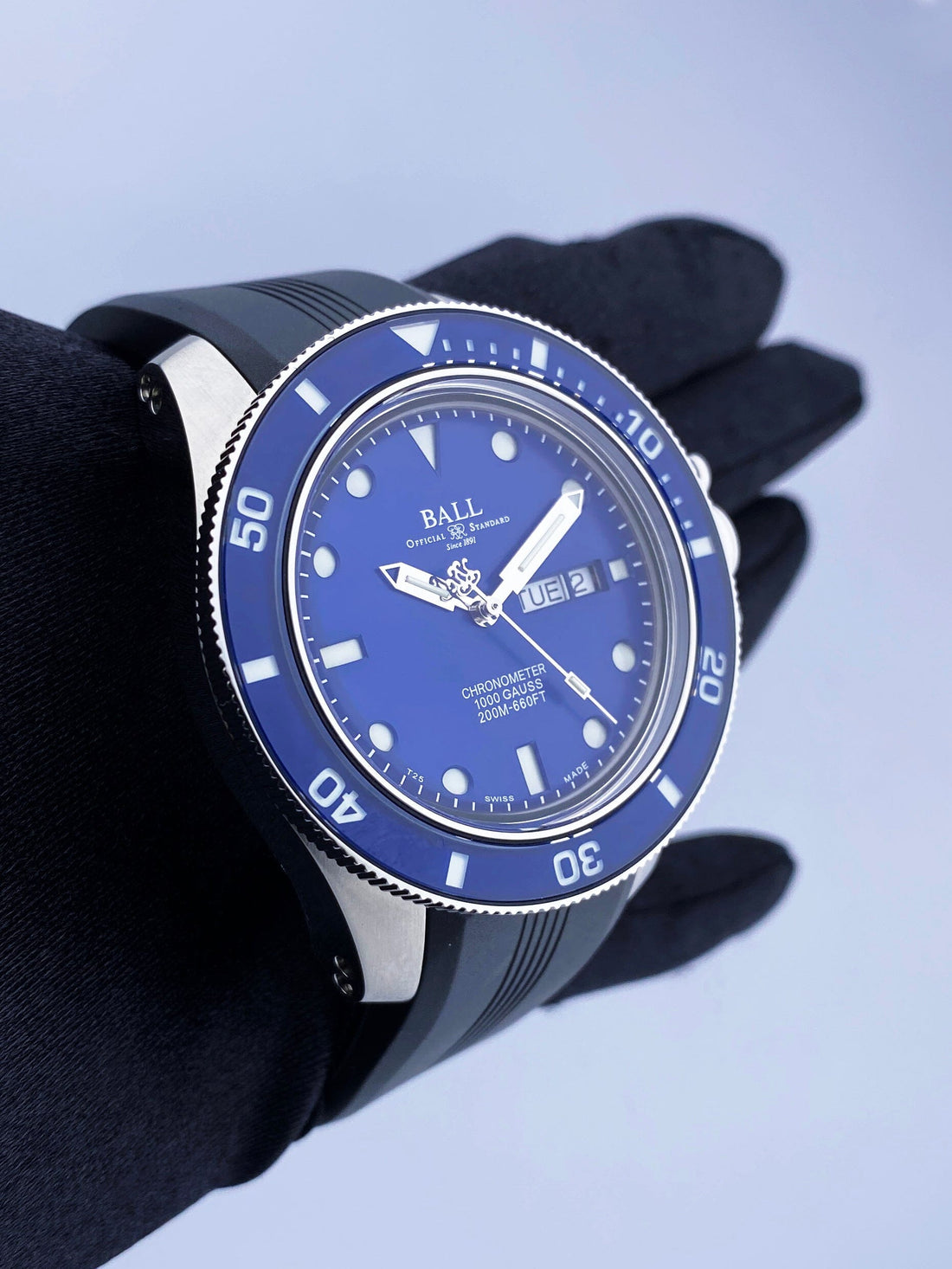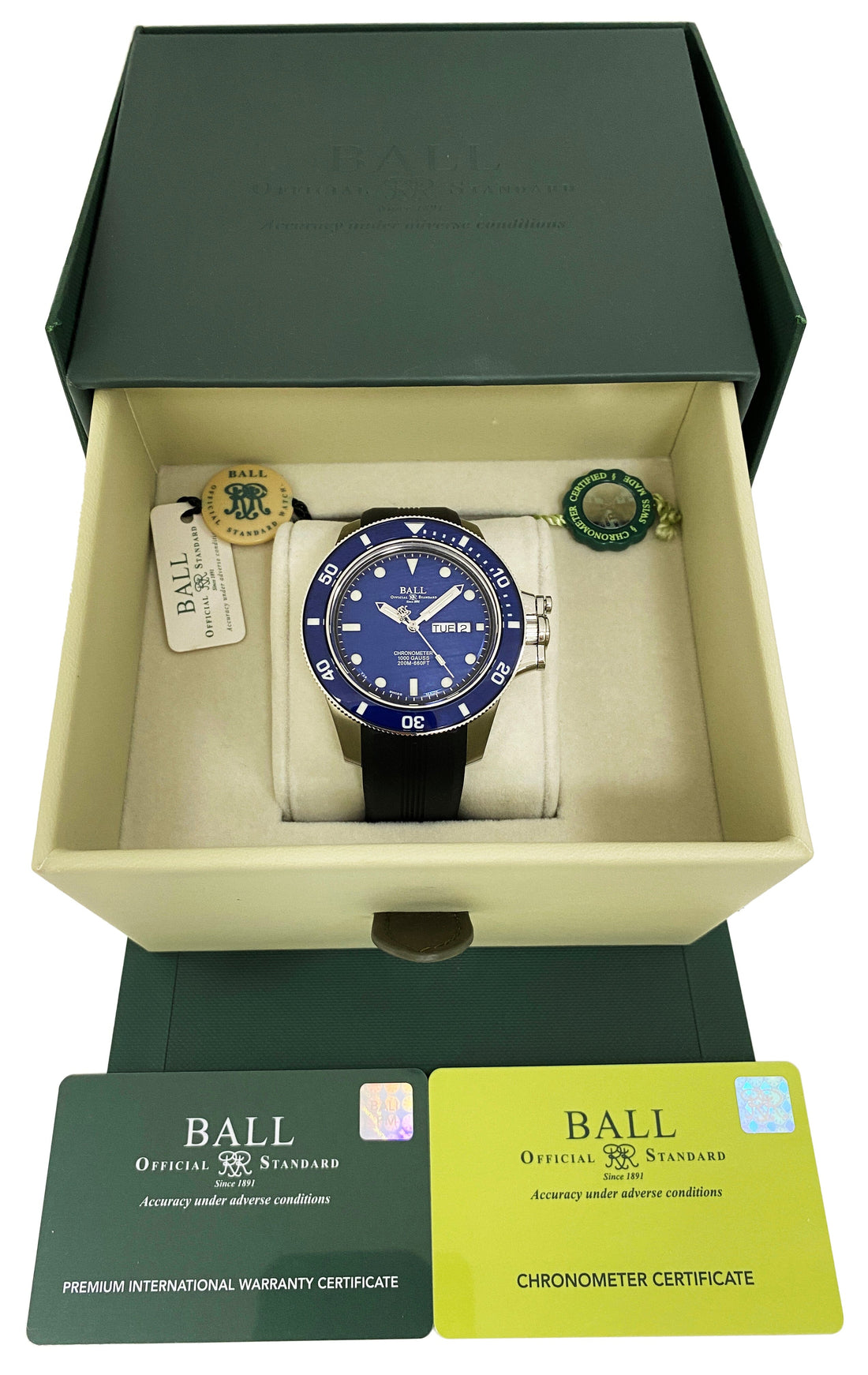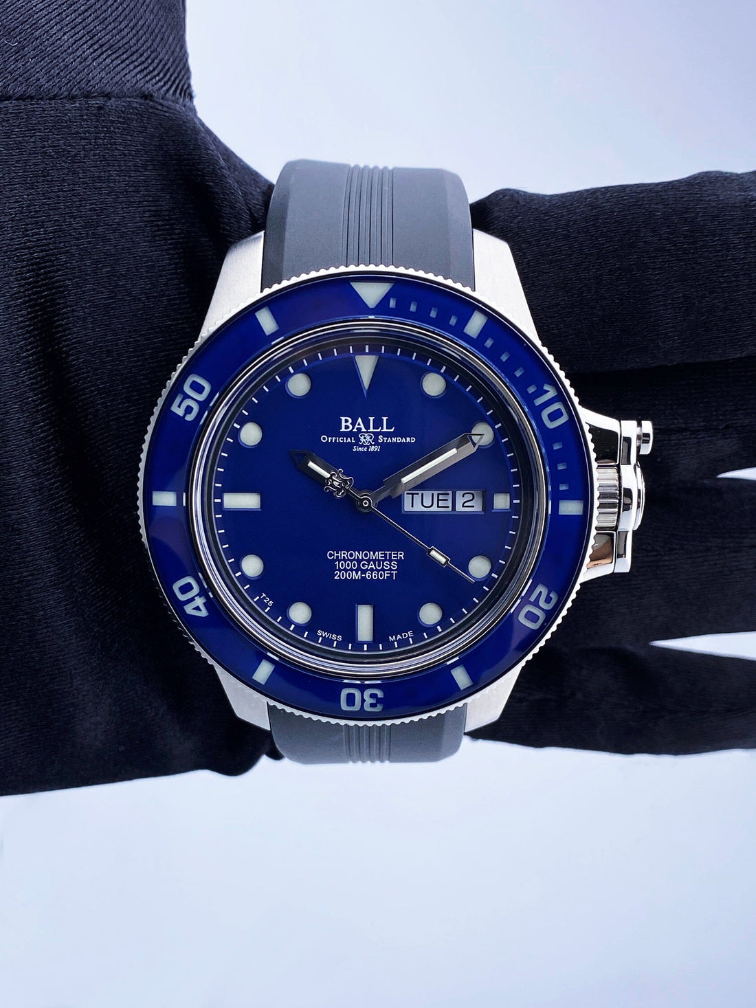 Brand New. BALL Engineer Hydrocarbon Original 43mm DM2218B-P1CJ-BE Mens Watch. 43mm stainless steel case. Unidirectional rotating curved sapphire bezel with micro gas tubes for night reading capability. Blue dial with luminous steel hands and luminous index hour markers. Minute markers on the outer dial. Date and day display at the 3 o'clock position. Black rubber strap with buckle. Will fit up to a 7-inch wrist. Sapphire crystal. Stainless steel case back. Automatic caliber BALL RR1102-CSL self-winding chronometer movement. This watch comes with original Box and Papers.
