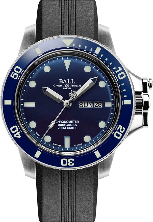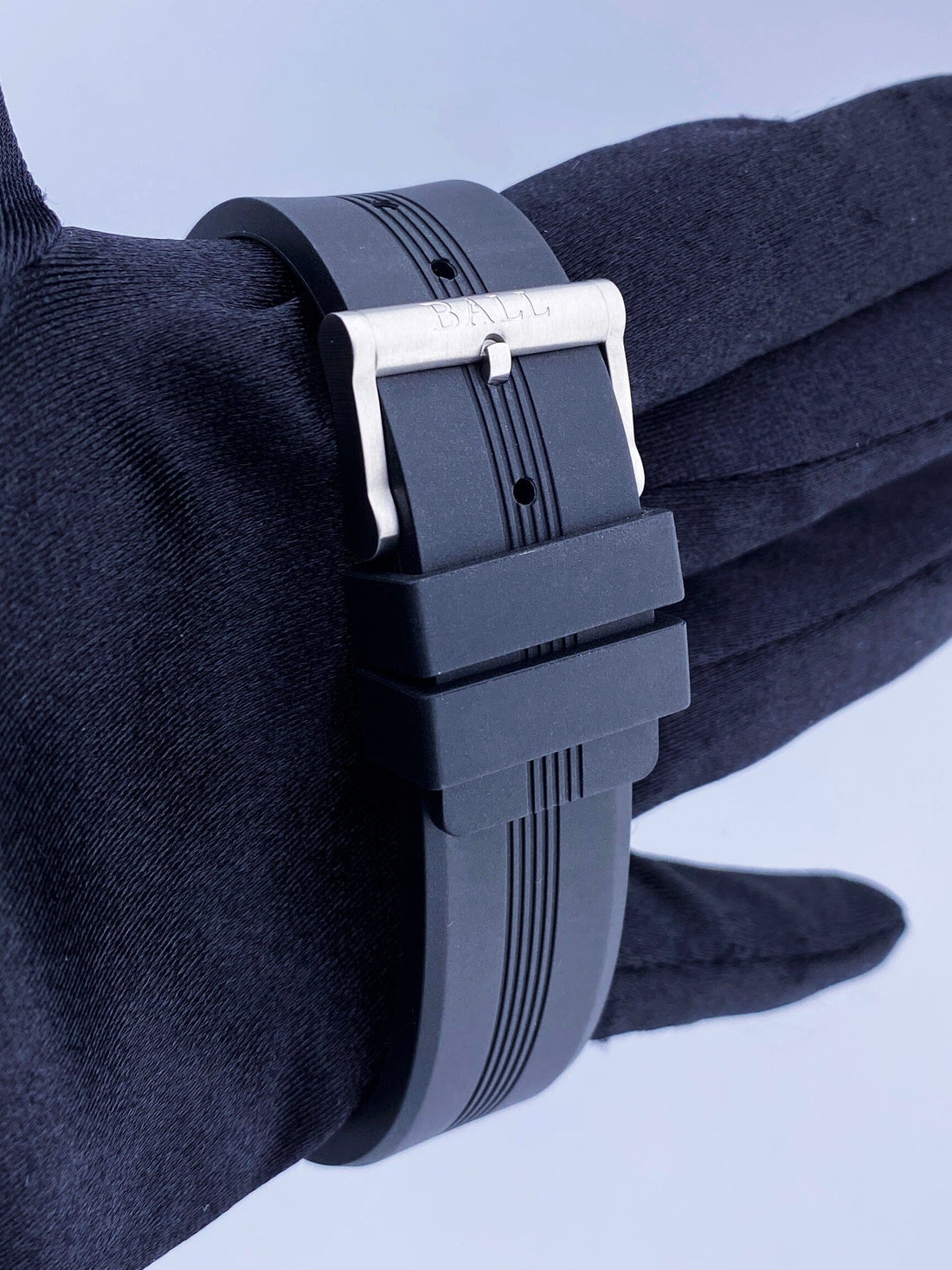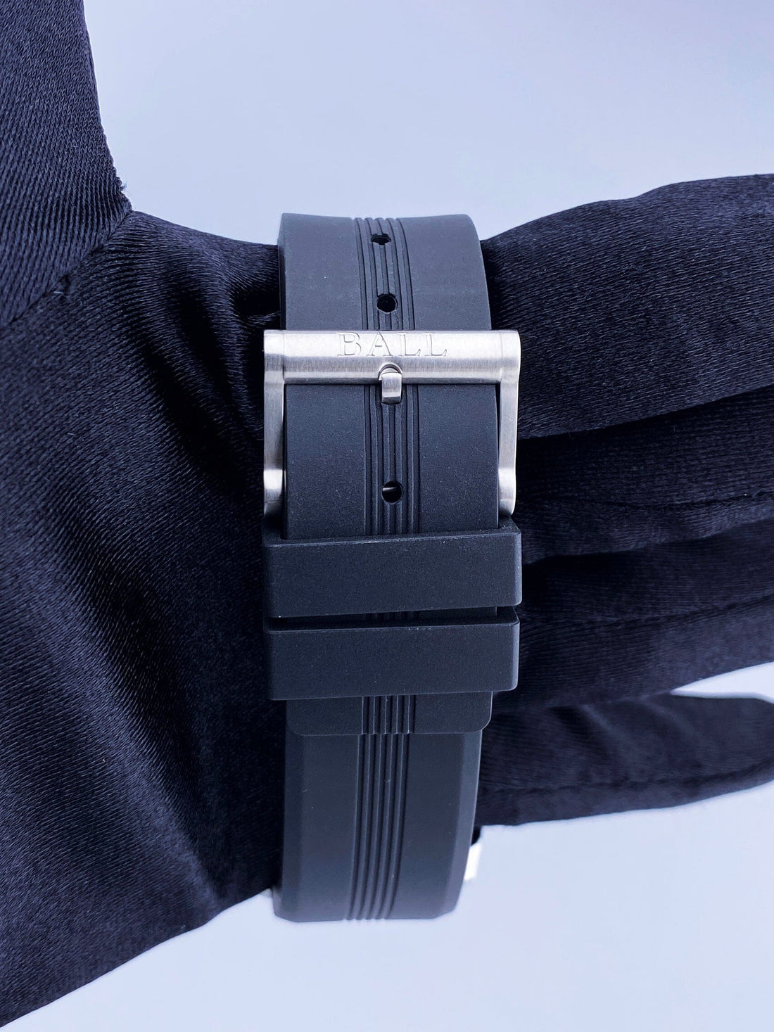 Brand New. BALL Engineer Hydrocarbon Original 43mm DM2218B-P1CJ-BE Mens Watch. 43mm stainless steel case. Unidirectional rotating curved sapphire bezel with micro gas tubes for night reading capability. Blue dial with luminous steel hands and luminous index hour markers. Minute markers on the outer dial. Date and day display at the 3 o'clock position. Black rubber strap with buckle. Will fit up to a 7-inch wrist. Sapphire crystal. Stainless steel case back. Automatic caliber BALL RR1102-CSL self-winding chronometer movement. This watch comes with original Box and Papers.