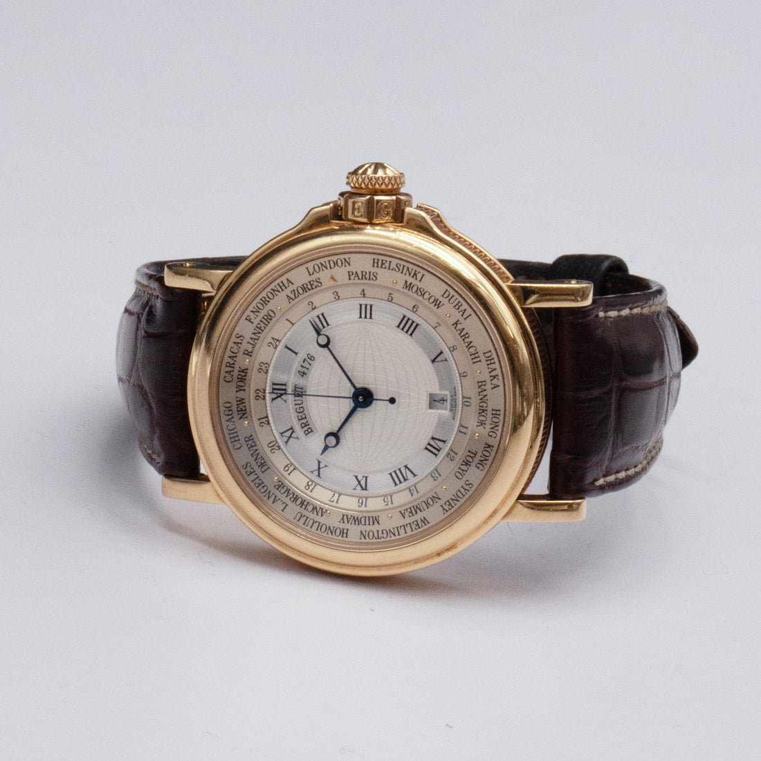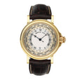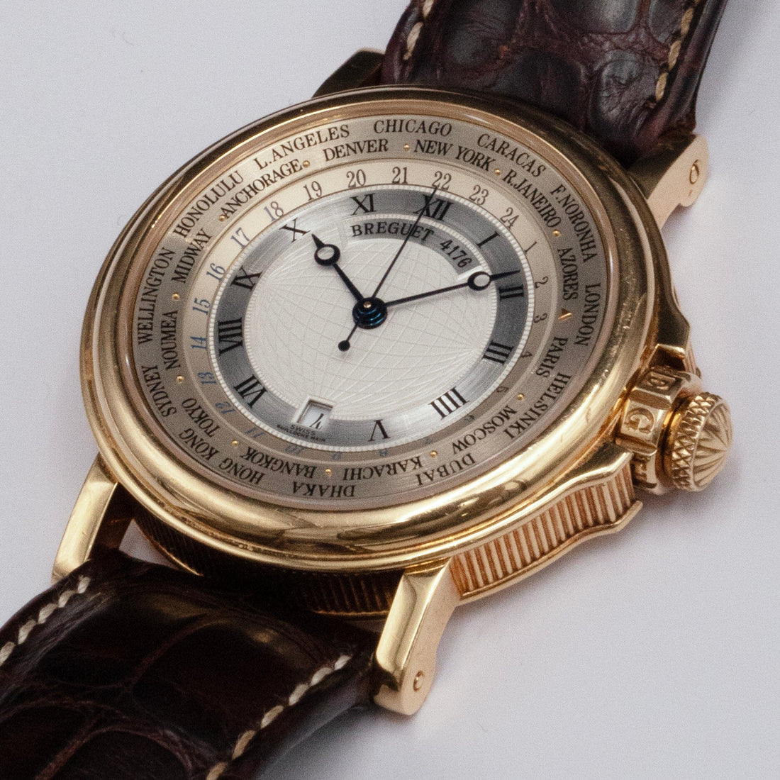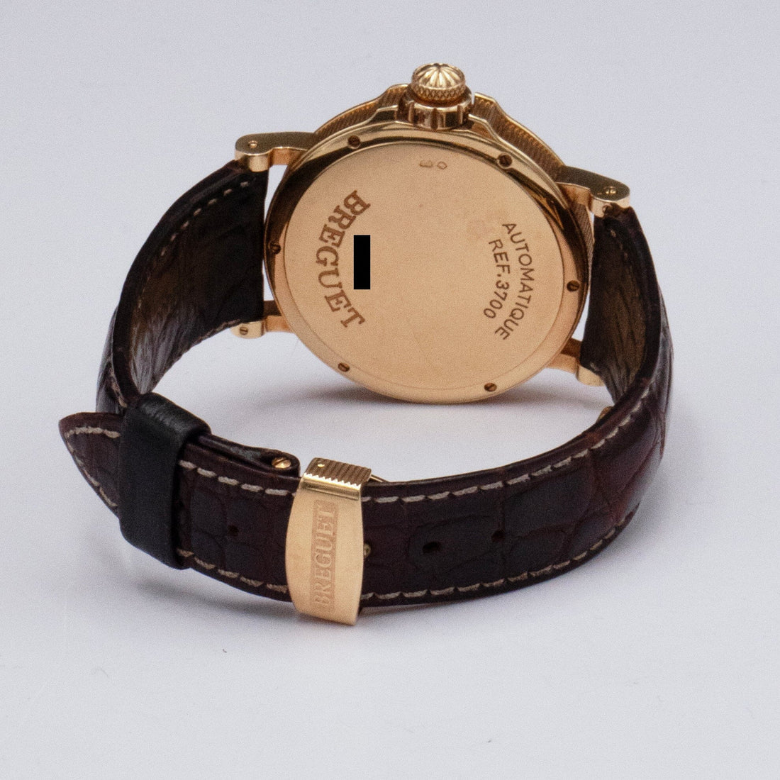 Breguet Marine 3700BA/12/9V6 Mens Watch. 38.00mm 18k yellow gold case. 18k yellow gold bezel. Silver dial and roman numeral hour markers. Date Indicator. World Time. Brown leather strap with 18k yellow gold deployment clasp. Will fit up to 7.00-inch wrist. Sapphire cyrstal. 18k yellow gold case back. Mechanical hand winding movement.