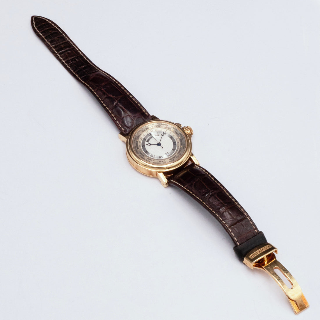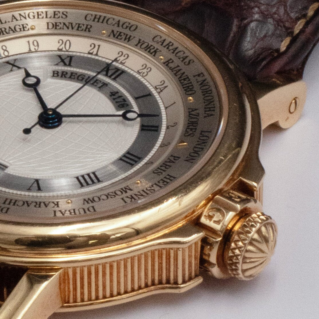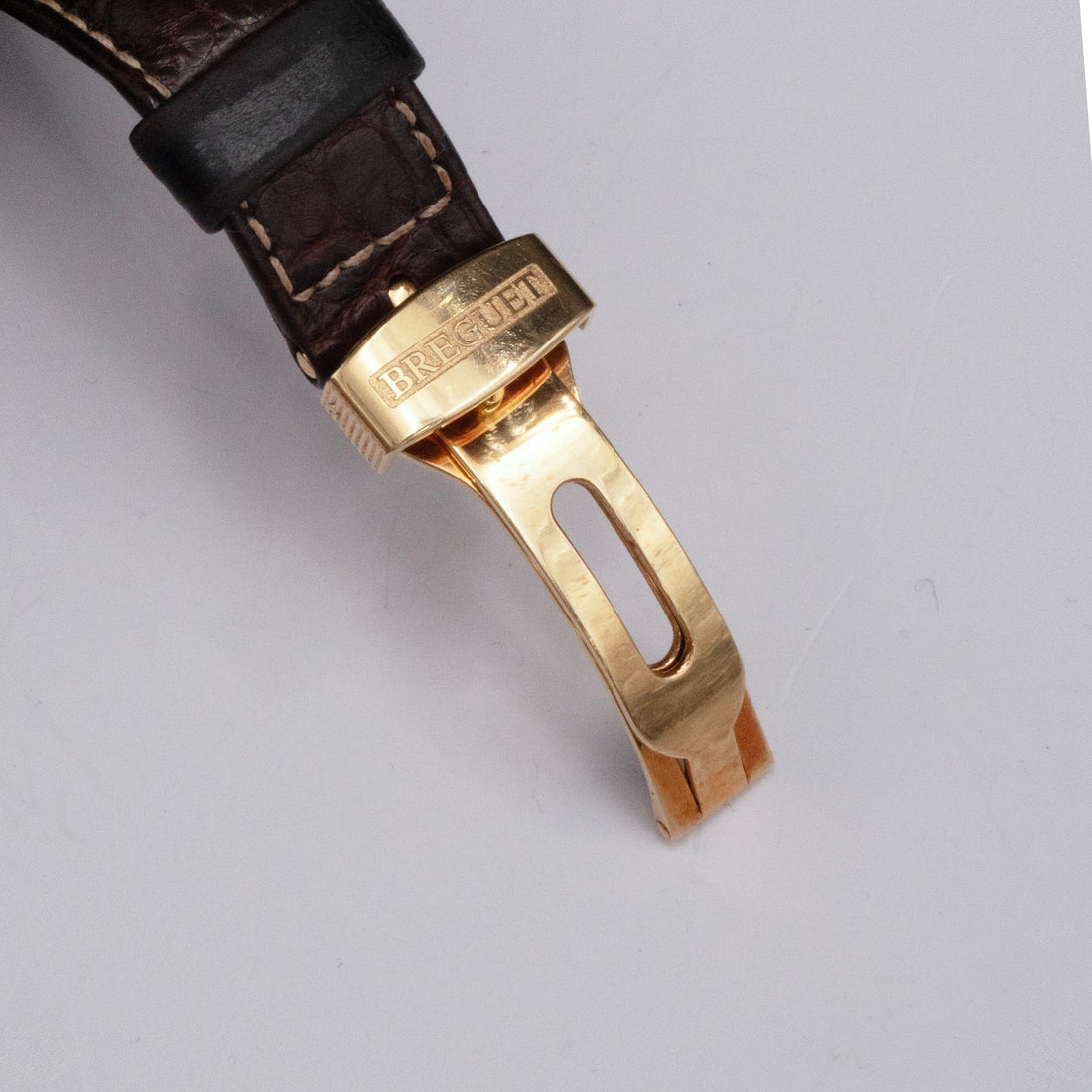 Breguet Marine 3700BA/12/9V6 Mens Watch. 38.00mm 18k yellow gold case. 18k yellow gold bezel. Silver dial and roman numeral hour markers. Date Indicator. World Time. Brown leather strap with 18k yellow gold deployment clasp. Will fit up to 7.00-inch wrist. Sapphire cyrstal. 18k yellow gold case back. Mechanical hand winding movement.