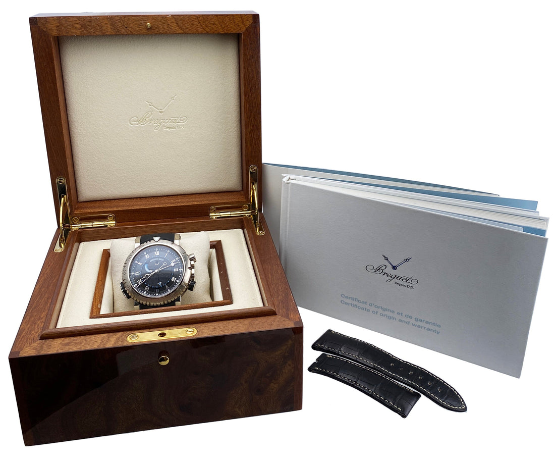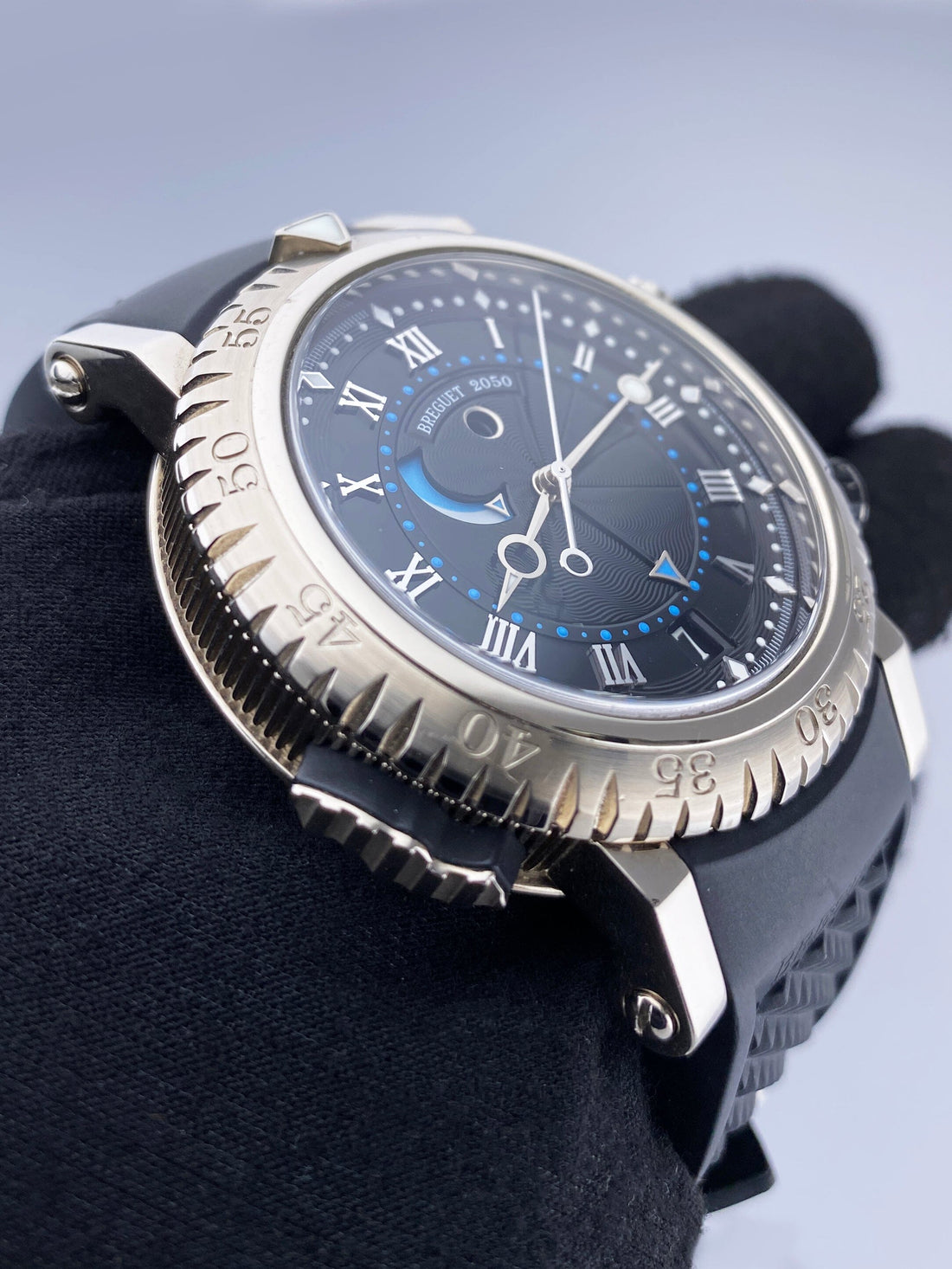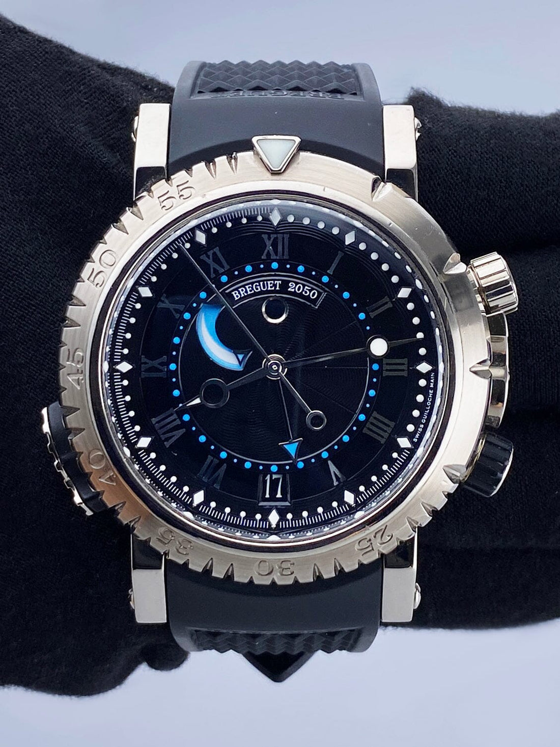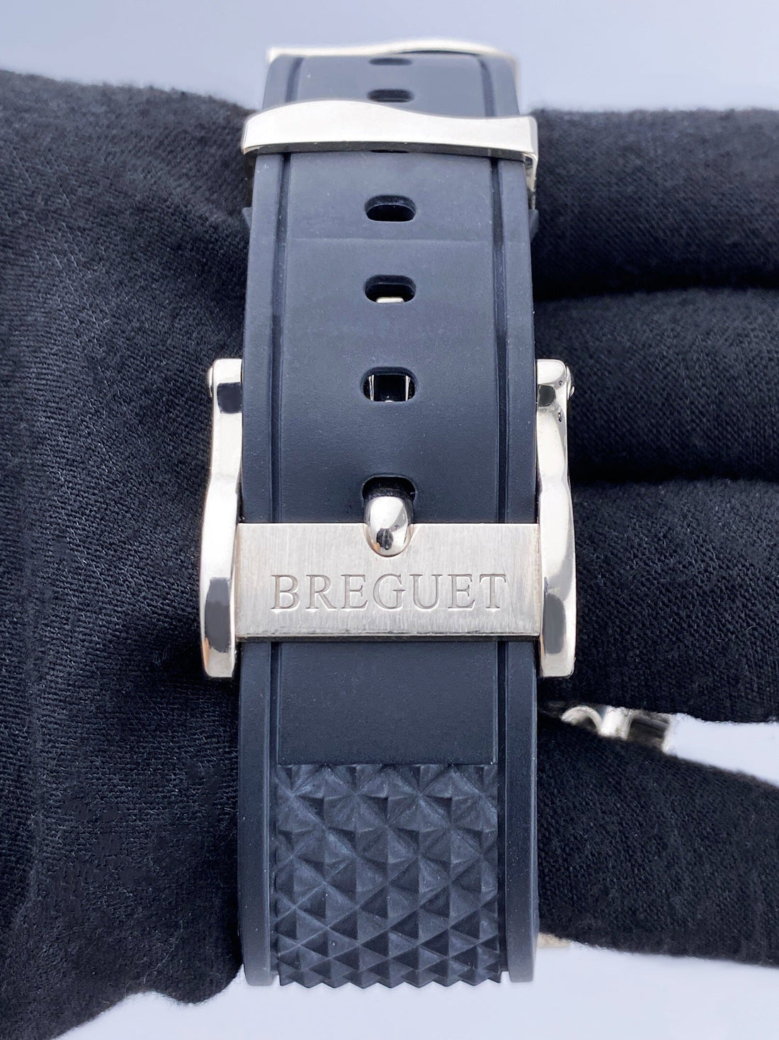 Breguet Marine Royal 5847 Mens Watch. 45mm 18K white gold case. Unidirectional 18K white gold bezel. Black dial with silver-tone hands and Roman numeral hour marker. Date displays at 6 o'clock position. Alarm clock. Black rubber strap with deployment buckle. Will fit up to a 7.5-inch wrist. Sapphire crystal. Transparent sapphire crystal case back. Automatic self-winding movement. This watch comes with original Box and Papers.