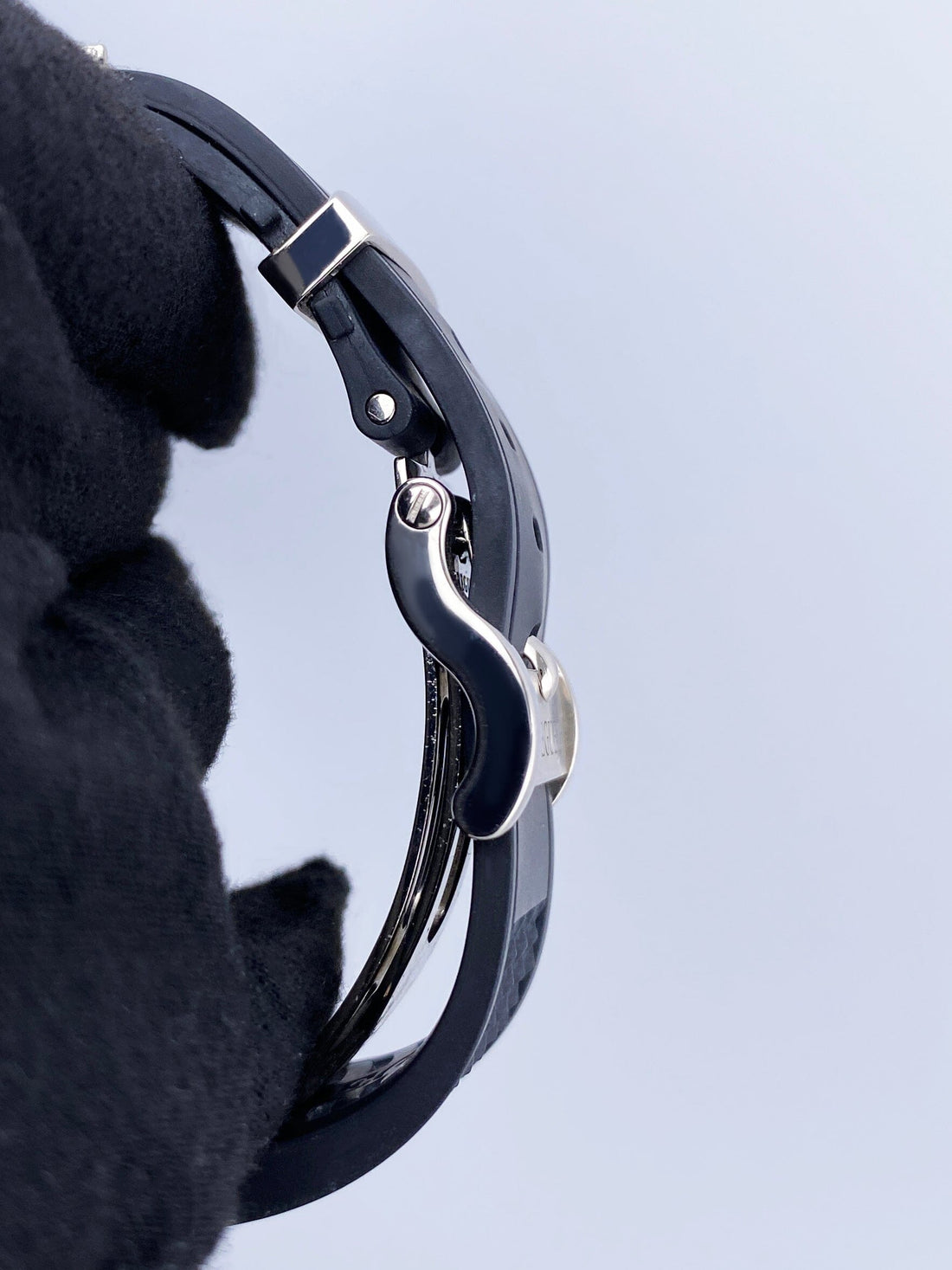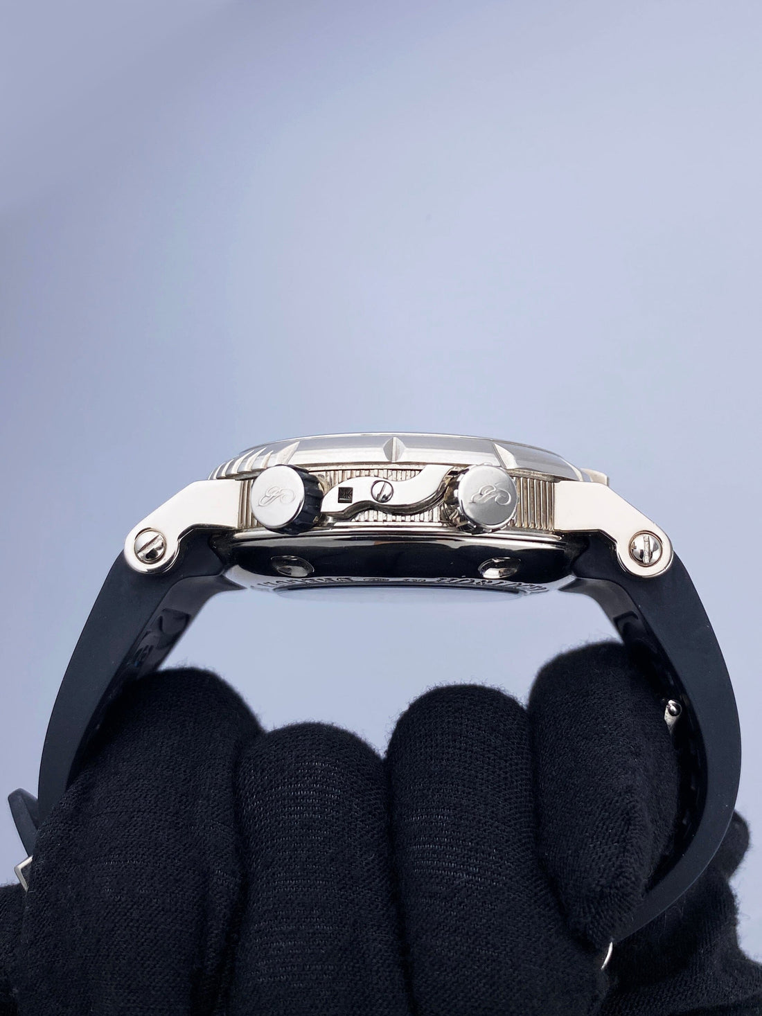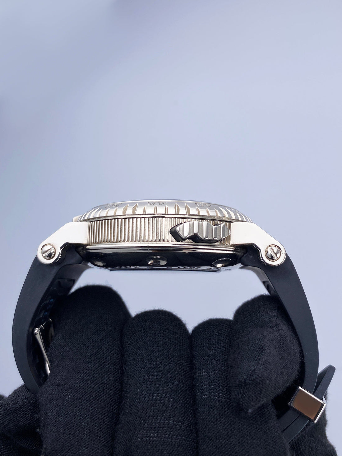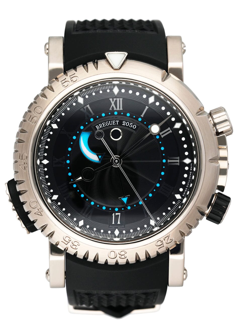 Breguet Marine Royal 5847 Mens Watch. 45mm 18K white gold case. Unidirectional 18K white gold bezel. Black dial with silver-tone hands and Roman numeral hour marker. Date displays at 6 o'clock position. Alarm clock. Black rubber strap with deployment buckle. Will fit up to a 7.5-inch wrist. Sapphire crystal. Transparent sapphire crystal case back. Automatic self-winding movement. This watch comes with original Box and Papers.