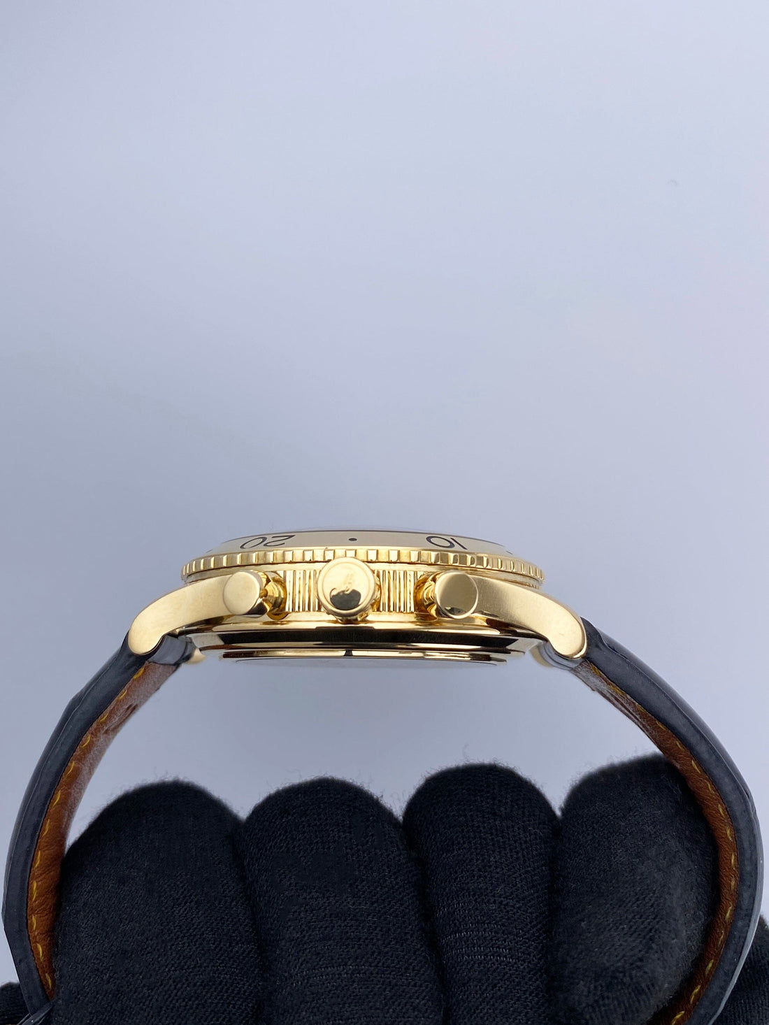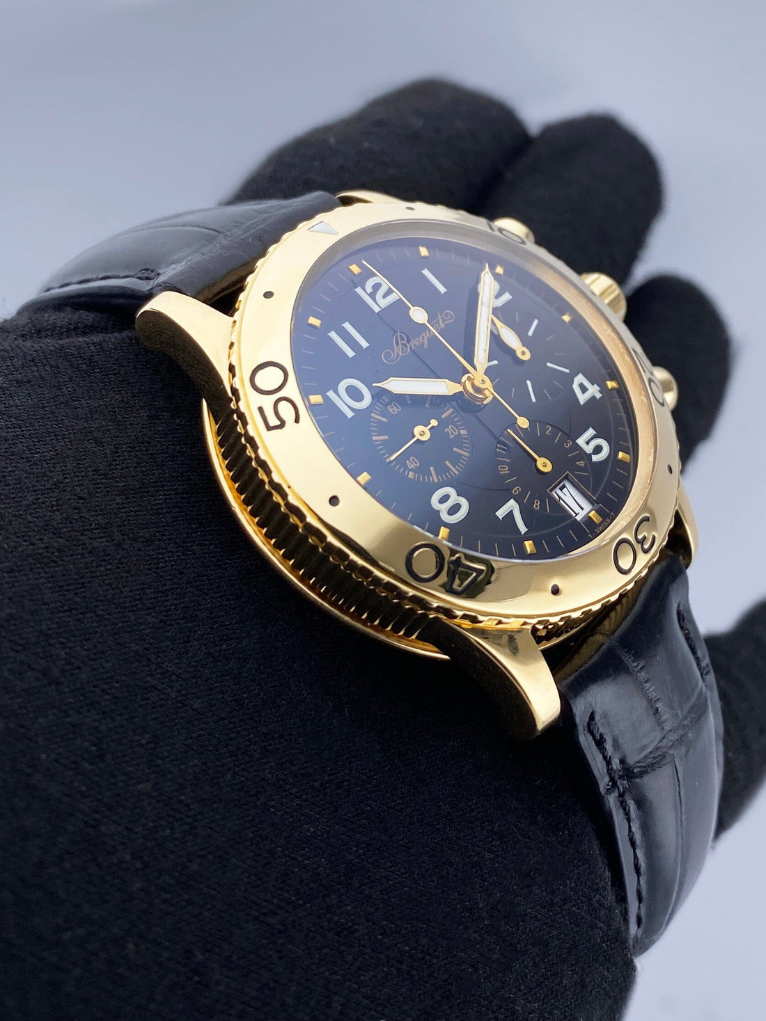 Breguet Type XX 3820 Mens Watch. 39mm 18K yellow gold case. Bidirectional 18K yellow gold bezel. Black dial with gold hands and Arabic numeral hour marker. Three sub-dials. Small seconds hand at 9 o'clock. 30-minute counter at 3 o'clock. 12-hour counter at 6 o'clock. Date is displayed at 6 o'clock. Black aftermarket strap with deployment buckle. Will fit up to a 7.5-inch wrist. Sapphire crystal. 18K white gold case back. Automatic self-winding movement.