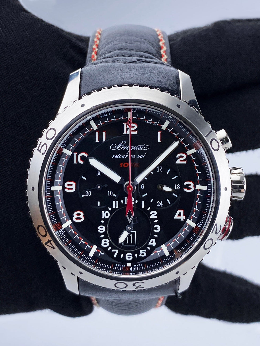 Breguet Type XXII 3880 Mens Watch. 44mm stainless steel case. Bidirectional stainless steel bezel. Black dial with silver-tone hands and Arabic numeral hour marker. Three sub-dials. Small seconds on a 30-second basis at 9 o'clock. 24-hour indicator at 3 o'clock. Second time zone indicator at 6 o'clock. Date is displayed at 6 o'clock. Black strap with buckle. Will fit up to a 7.5-inch wrist. Sapphire crystal. Stainless steel case back. Automatic self-winding movement.