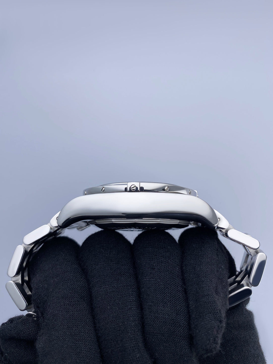 44mm stainless steel case. Unidirectional rotating stainless steel bezel. Black dial with luminous silver-tone hands and index hour markers. Three sub-dials. Small seconds at 9 o'clock. 30-minute counter at 3 o'clock. 12-hour counter at 6 o'clock. Minute markers on the outer dial. Date display between 4 and 5 o'clock. Stainless steel bracelet with fold over clasp with safety. Will fit up to a 7.5-inch wrist. Sapphire crystal. Stainless steel case back. Automatic self-winding movement. This watch comes with original Box and Papers.