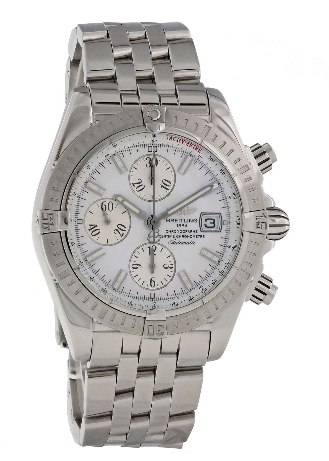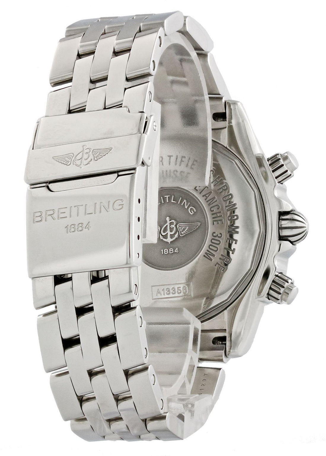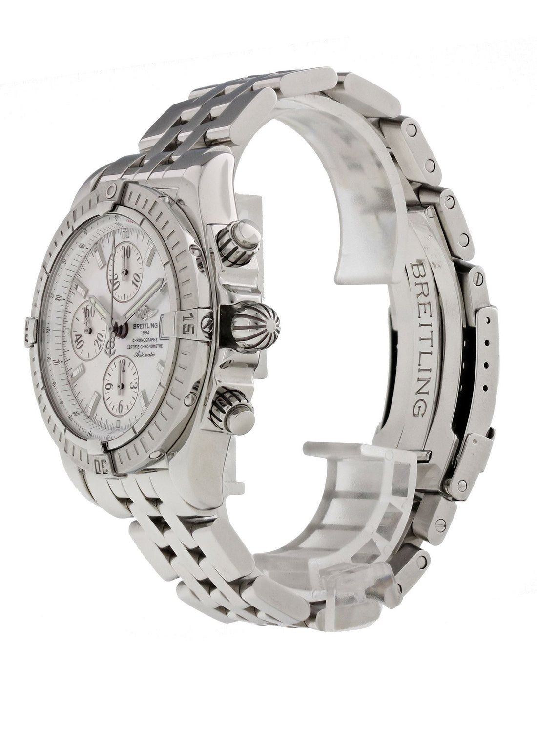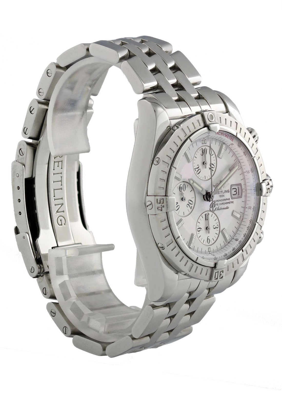 Breitling Chronomat A13356 Mens Watch. 44mm Stainless Steel case. Stainless Steel Unidirectional bezel. Mother-of-Pearl dial with Luminous Steel hands and index hour markers. Minute markers on the outer dial. Date display at the 3 o'clock position. Stainless Steel Bracelet with Fold Over Clasp With Safety. Will fit up to a 7.75-inch wrist. Sapphire Crystal, Stainless steel case back. Automatic self-winding chronometer movement. This watch is backed by our two year warranty.