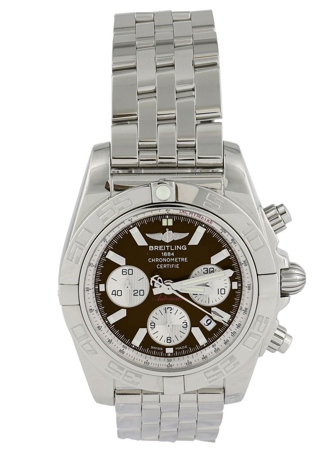 Breitling Chronomat AB0110 Men Watch. 44mm Stainless Steel case. Stainless Steel Unidirectional bezel. Brown dial with Luminous Steel hands and index hour markers. Minute markers on the outer dial. Date display between the 4 & 5 o'clock position. Stainless Steel Bracelet with Fold Over Clasp With Safety. Will fit up to a 7.25-inch wrist. Sapphire Crystal, Stainless steel case back. Automatic self-winding chronometer movement. This watch is backed by our two year warranty.