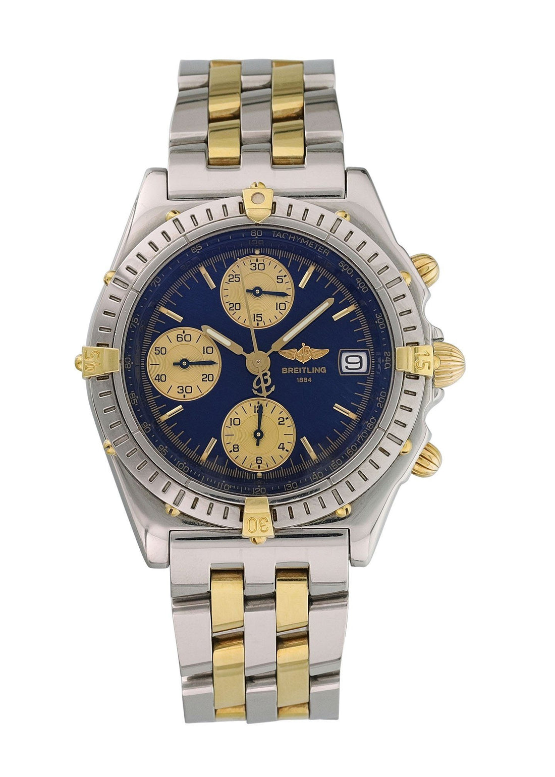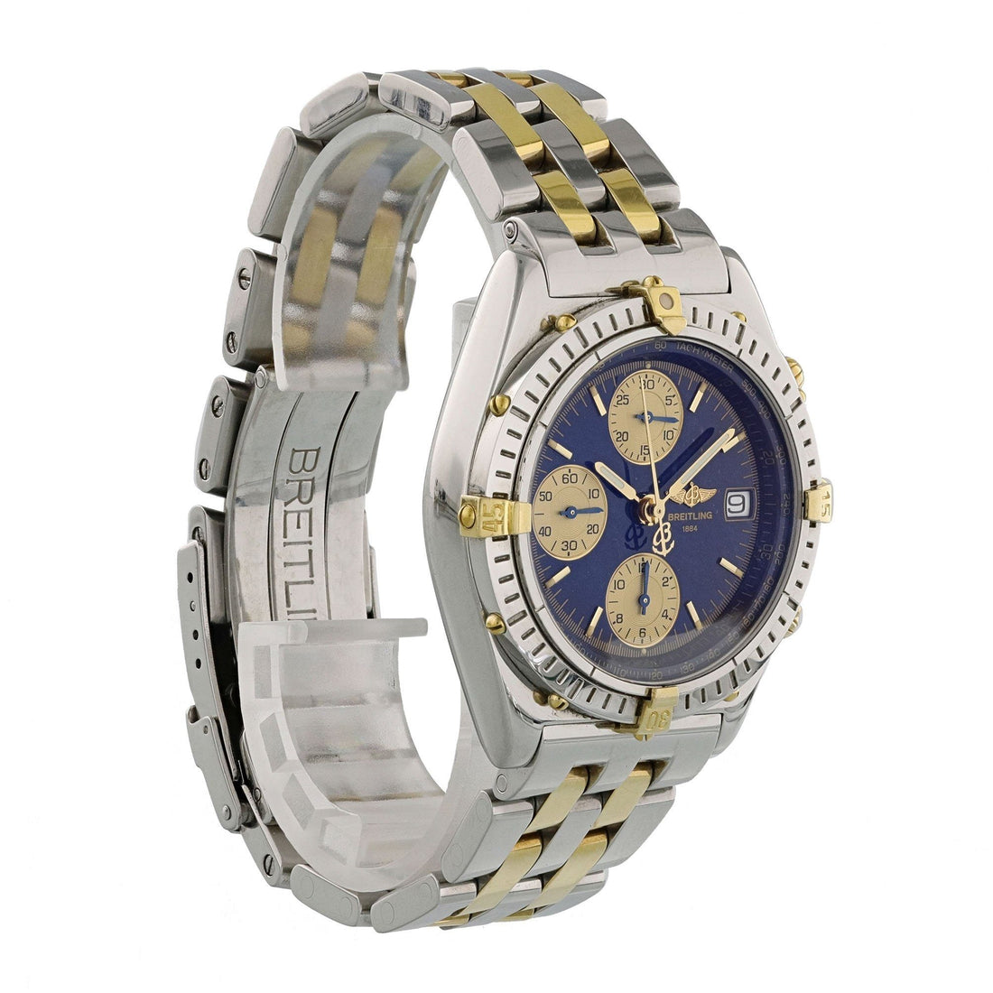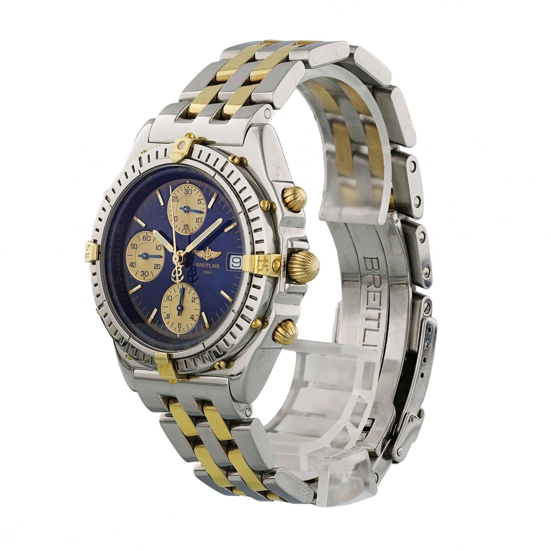 Breitling Chronomat B130501 Men's Watch. Breitling Chronomat Professional B130501 Men Watch. 44mm Stainless Steel case. Stainless Steel Unidirectional rotating bezel. Blue dial with luminous gold hands and index hour markers. Minute markers on the outer dial. Date display at the 3 o'clock position. Stainless Steel Bracelet with Fold Over Clasp. Will fit up to a 7-inch wrist. Sapphire Crystal, Stainless steel case back. Automatic self-winding movement. This watch is backed by our one year warranty.
