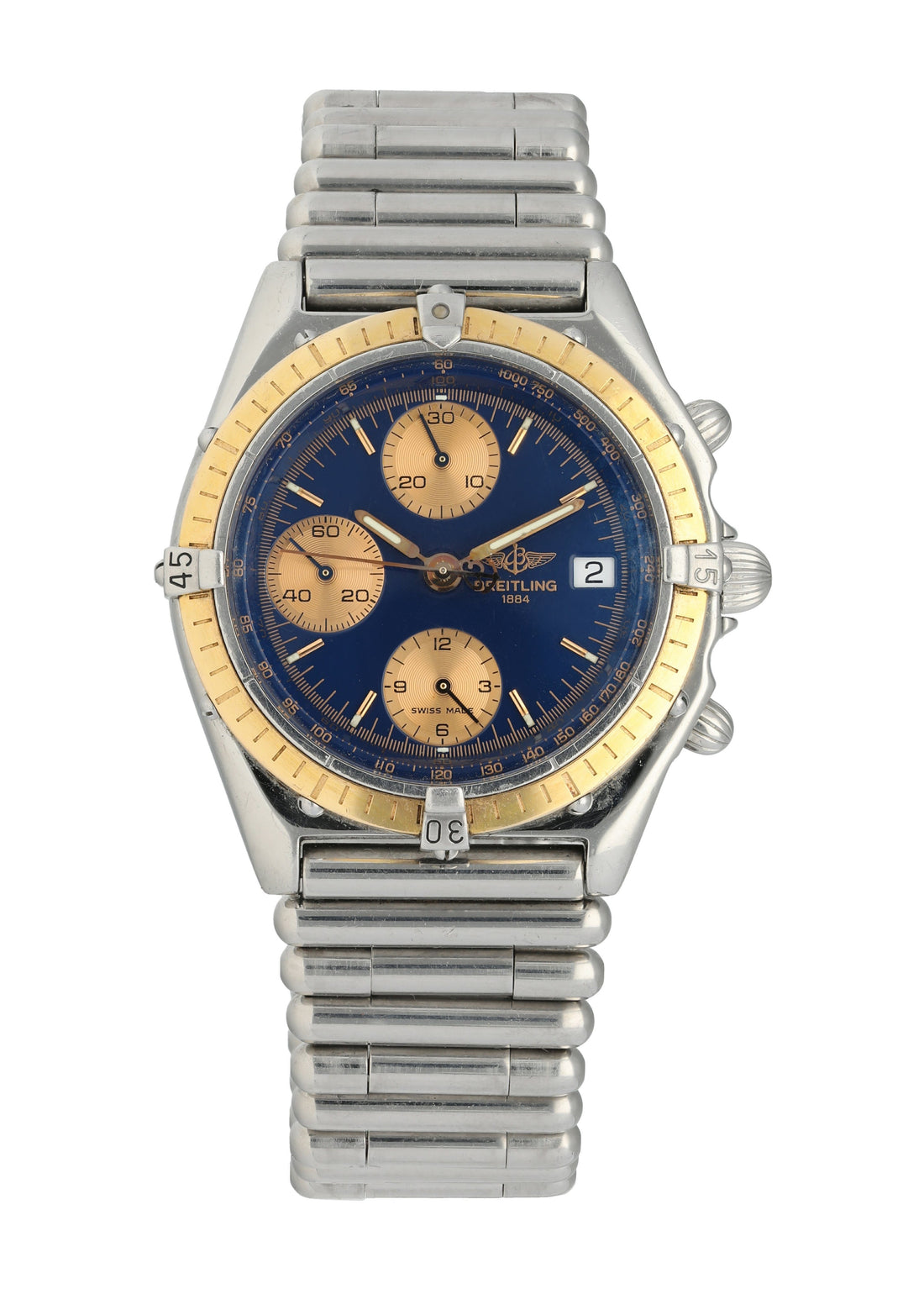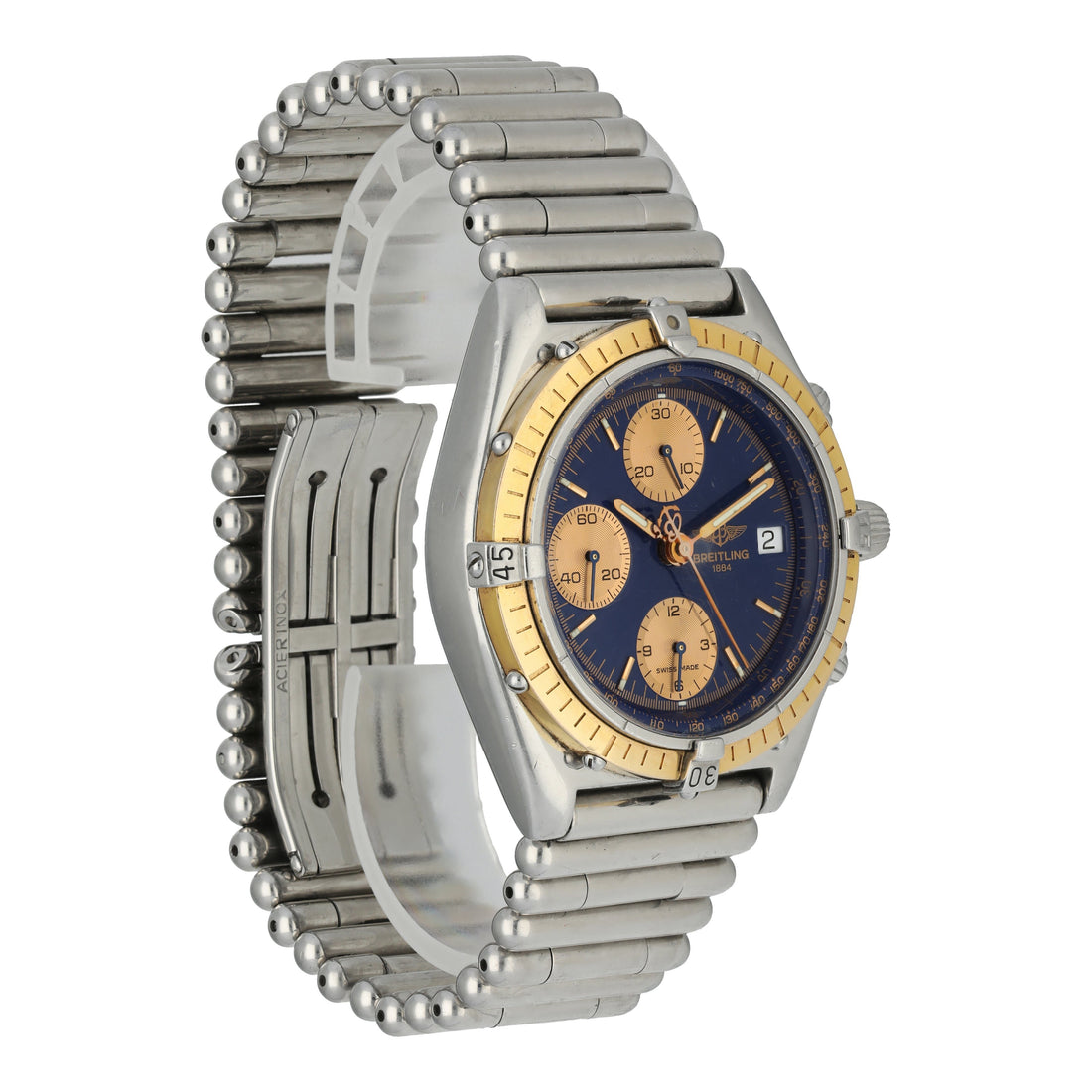 Breitling Chronomat C13048 Bullet Band Men's Watch. 39mm Stainless Steel case. Yellow Gold Unidirectional bezel. Blue dial with luminous gold hands and index hour markers. Minute markers on the outer dial. Date display at the 3 o'clock position. Stainless Steel Bracelet with Hidden Butterfly. Will fit up to a 7-inch wrist. Sapphire Crystal, Stainless steel case back. Automatic self-winding movement. This watch is backed by our two year warranty.