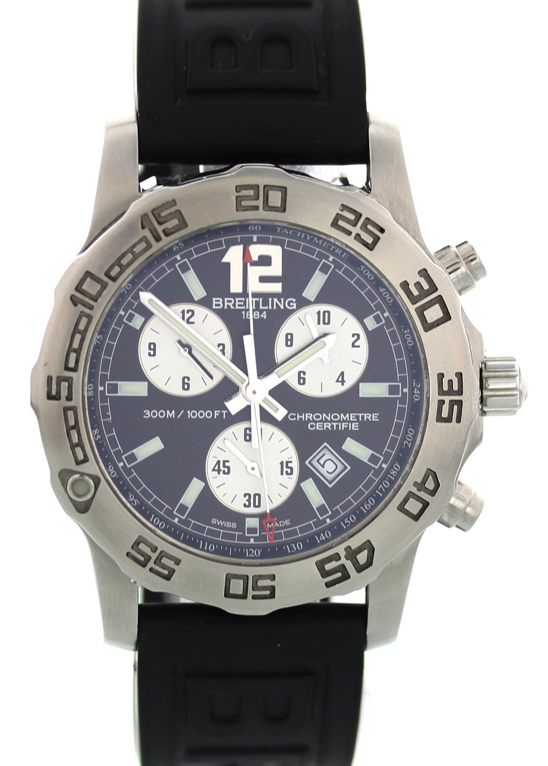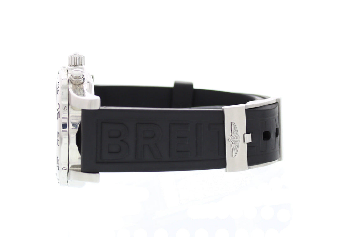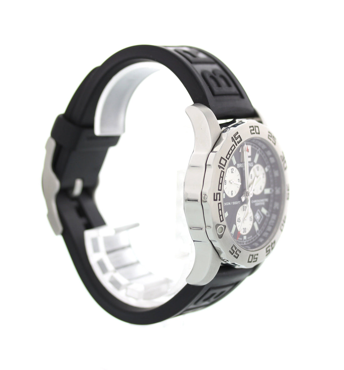 Breitling Colt Ocean A73387. Stainless Steel 43mm case with unidirectional rotating bezel. Black triple register dial with silver luminous hands and hour markers. Date aperture. Black rubber strap with a steel buckle. Sapphire crystal glass. Quartz battery movement. This watch is backed by our two year warranty.