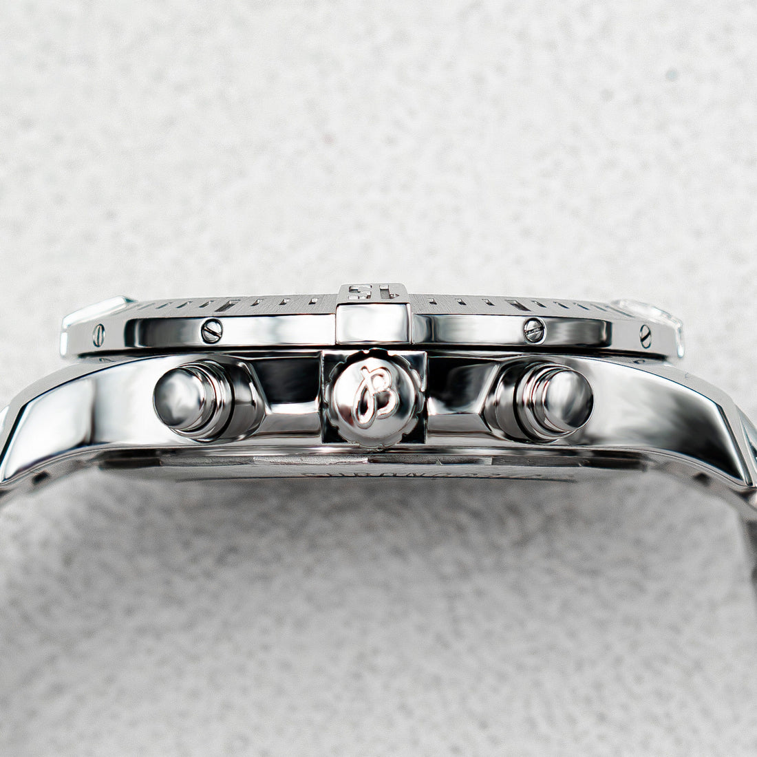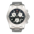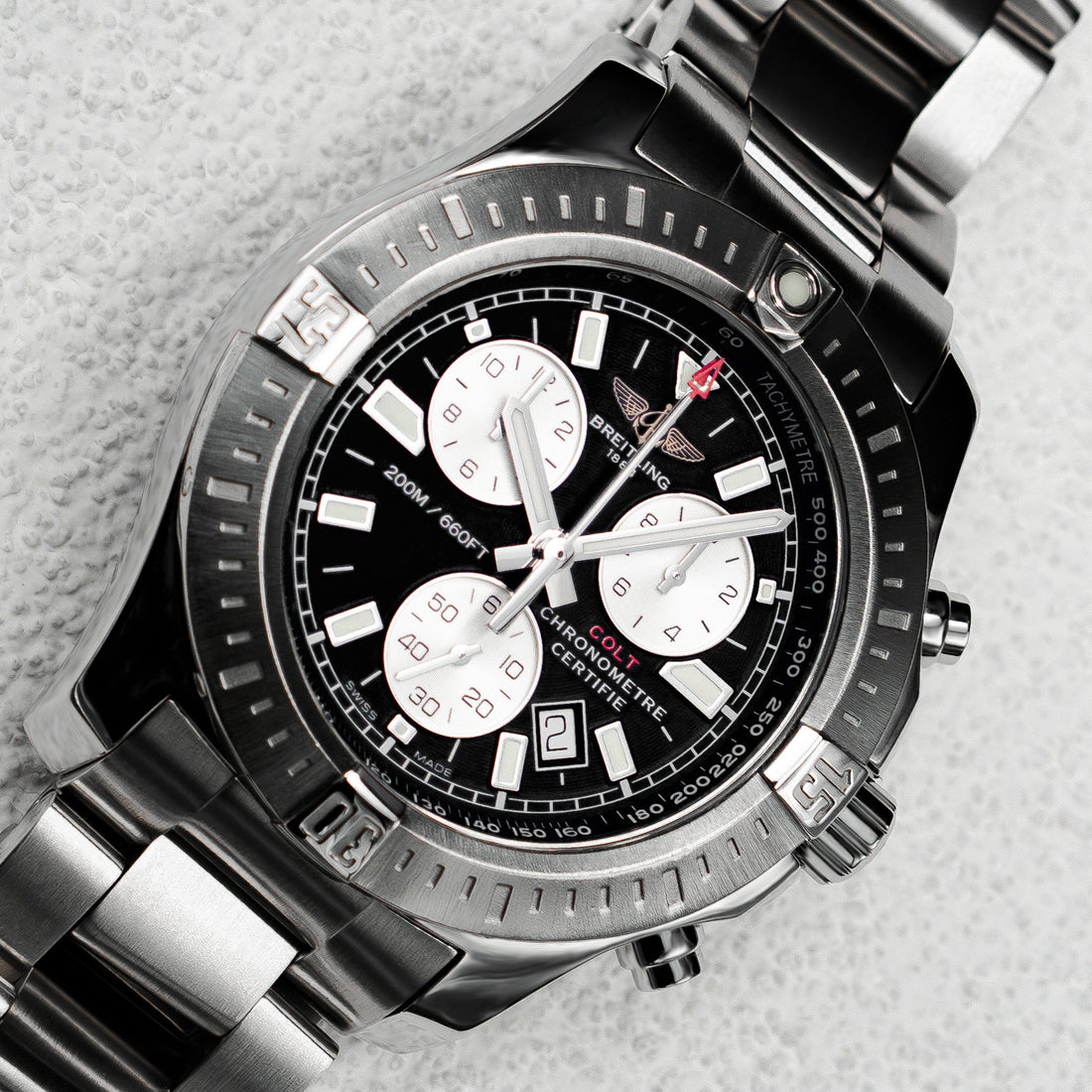 Breitling Colt Chronograph A73388 Mens Watch. 44mm stainless steel case. Unidirectional rotating stainless steel bezel. Black dial with luminous silver-tone hands and index hour markers. Three black sub-dials. Small seconds hand at 6 o'clock. Recording 1/10 second increments dial at 3 o'clock. 12-hour counter at 9 o'clock. Minute markers on the outer dial. Date display between 4 and 5 o'clock. Stainless steel bracelet with fold over clasp with safety. Will fit up to a 7-inch wrist. Sapphire crystal. Titanium case back. Quartz: Battery powered movement.