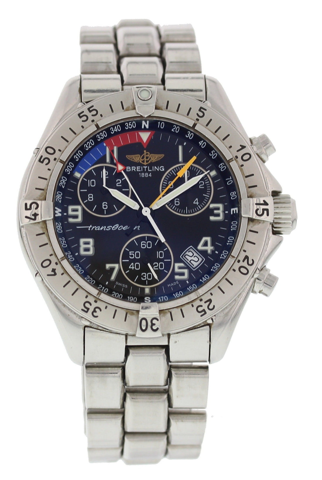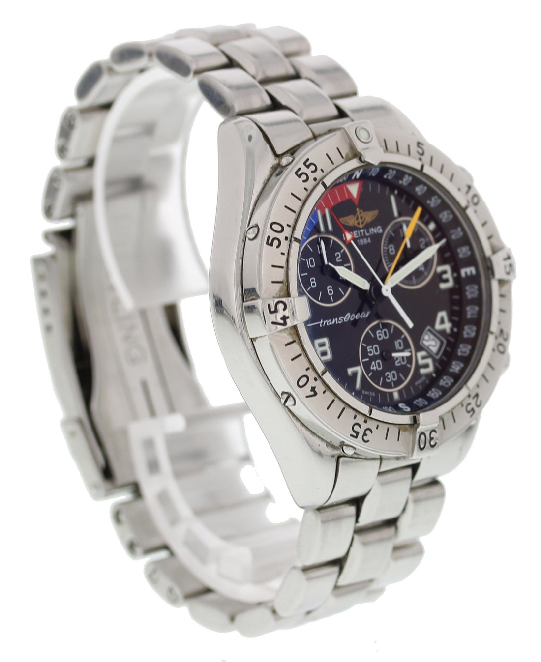 Men's Breitling Colt Chronograph Transocean A53340. Stainless steel 43mm case. Stainless steel unidirectional bezel. Black dial with luminous hands/markers, second display, date aperture, and chronograph function. Stainless steel band; fold over clasp with safety. Will fit up to 6 inch wrist. Sapphire crystal glass. This watch is backed by our two year warranty.