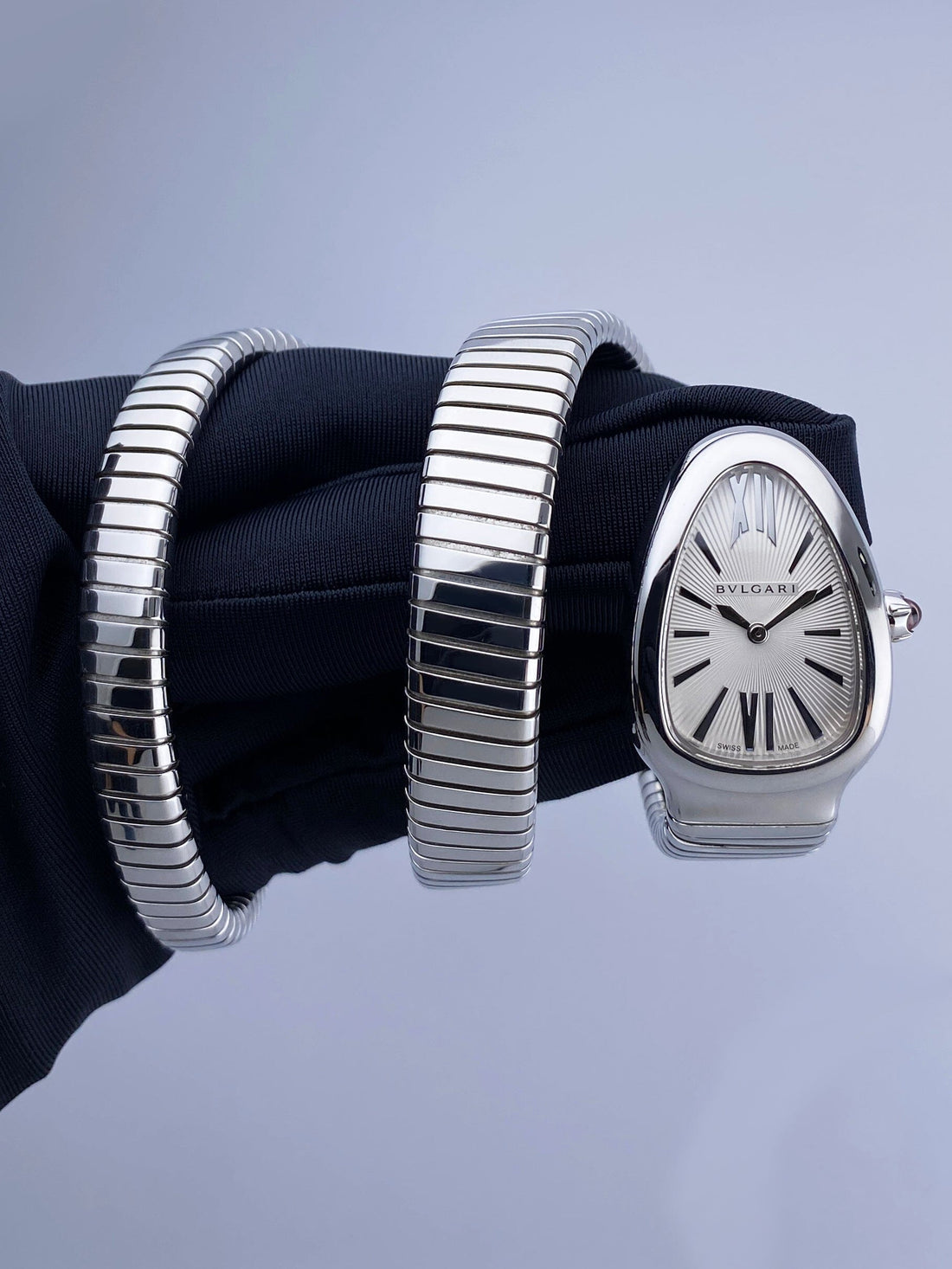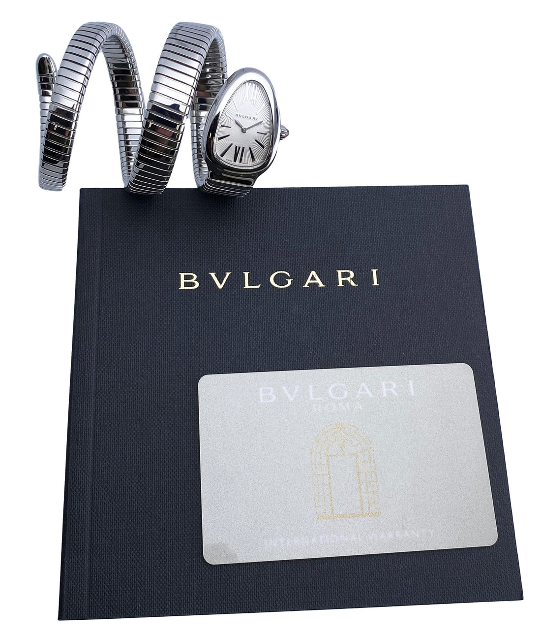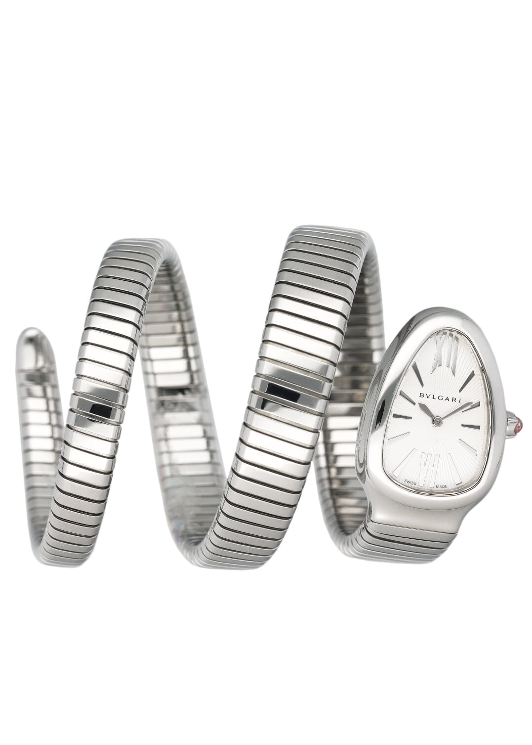 Bvlgari Serpenti Tubogas 101911 / SP 35 S Ladies Watch. 35mm stainless steel case. Stainless steel bezel. Silver dial with silver-tone hands and Roman numeral & index hour marker. Cabochon cut pink rubellite crown. Stainless steel serpent snake bracelet. Will fit up to between 6 to 7 inches, this design is flexible so will fit most wrists. Sapphire crystal. Stainless steel case back. Quartz: battery powered movement. This watch comes with original Papers.