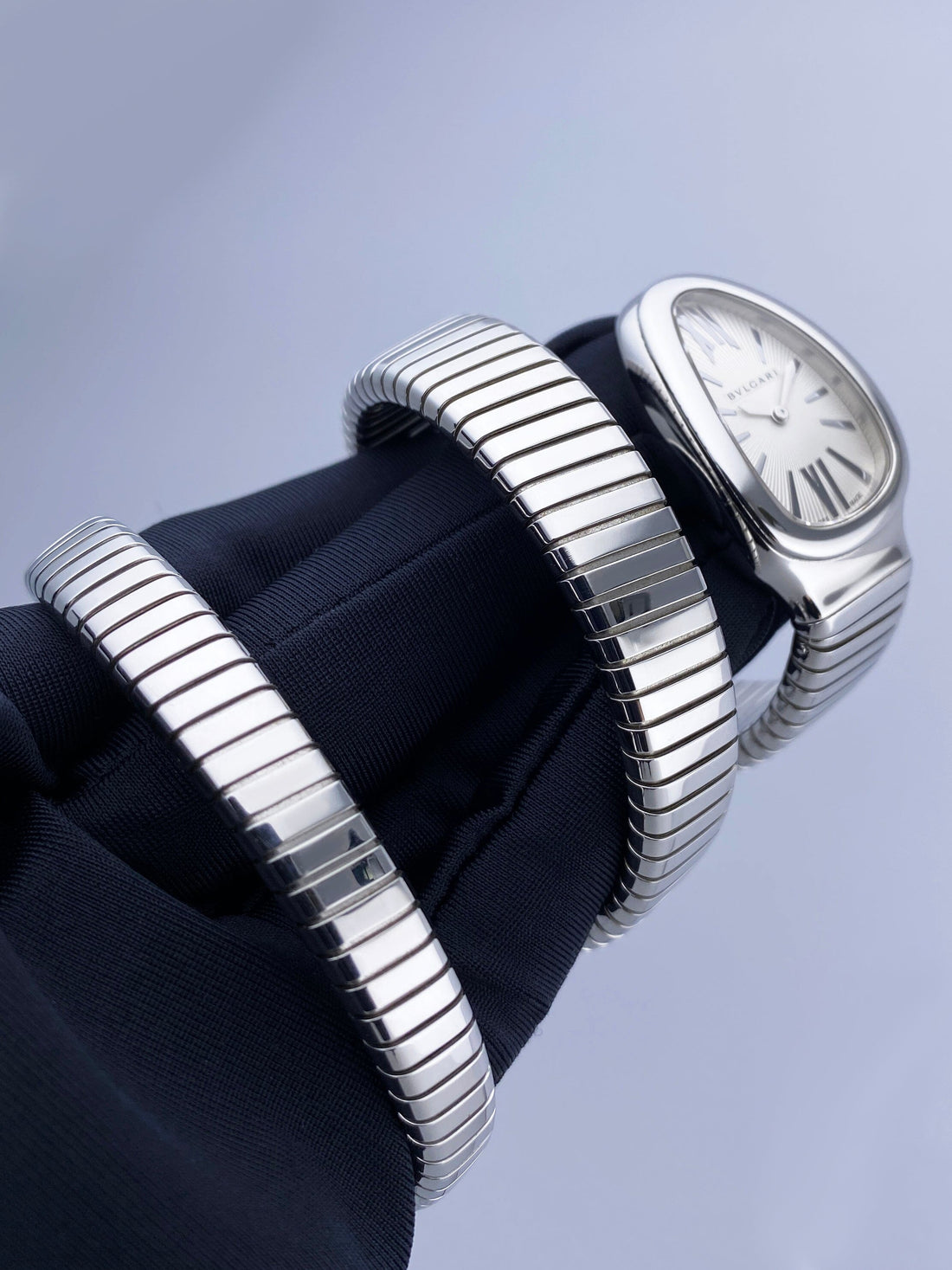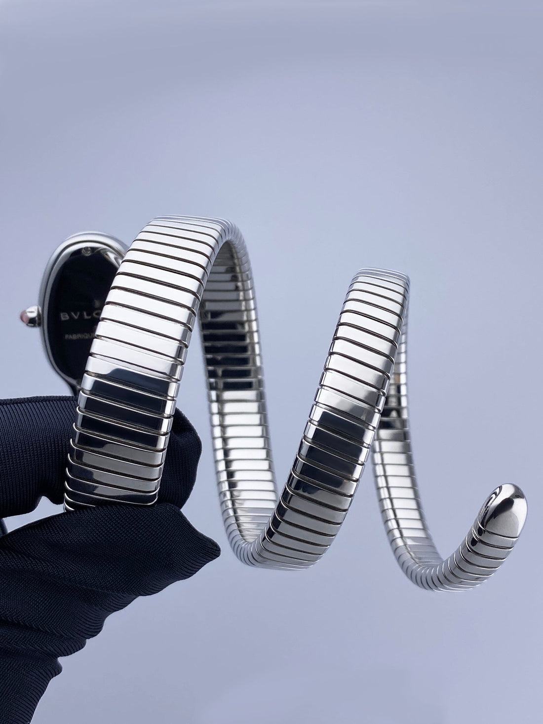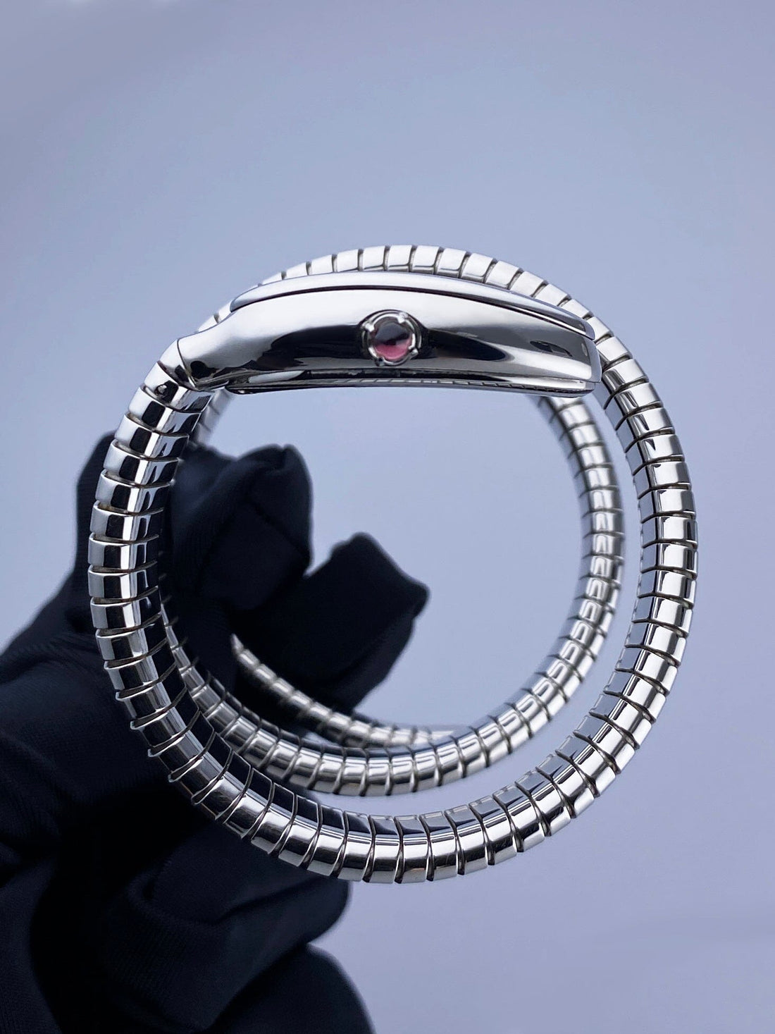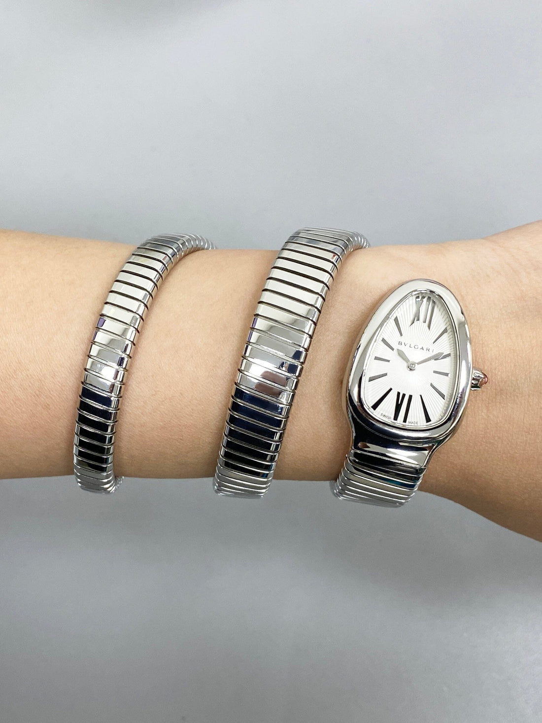 Bvlgari Serpenti Tubogas 101911 / SP 35 S Ladies Watch. 35mm stainless steel case. Stainless steel bezel. Silver dial with silver-tone hands and Roman numeral & index hour marker. Cabochon cut pink rubellite crown. Stainless steel serpent snake bracelet. Will fit up to between 6 to 7 inches, this design is flexible so will fit most wrists. Sapphire crystal. Stainless steel case back. Quartz: battery powered movement. This watch comes with original Papers.
