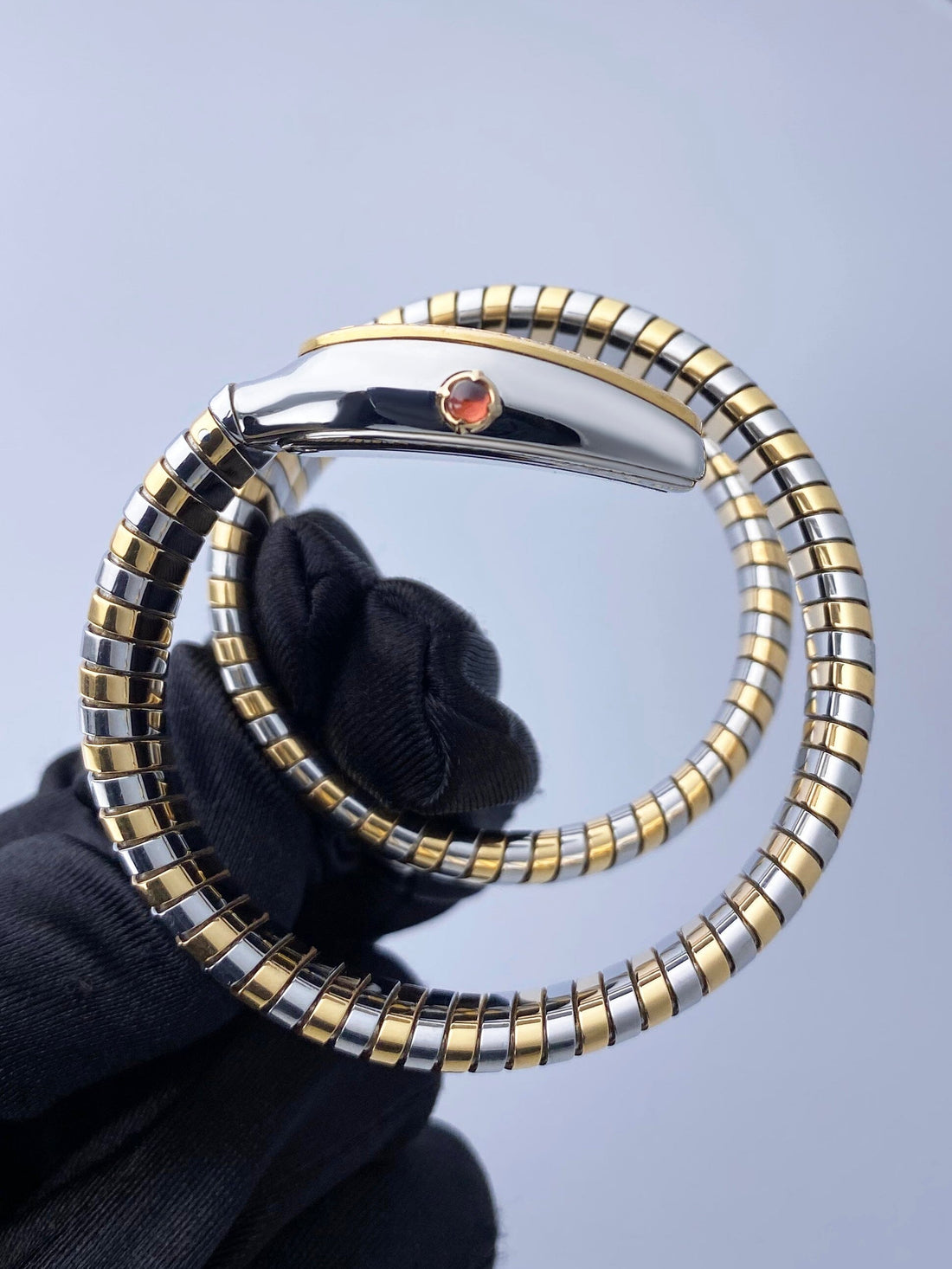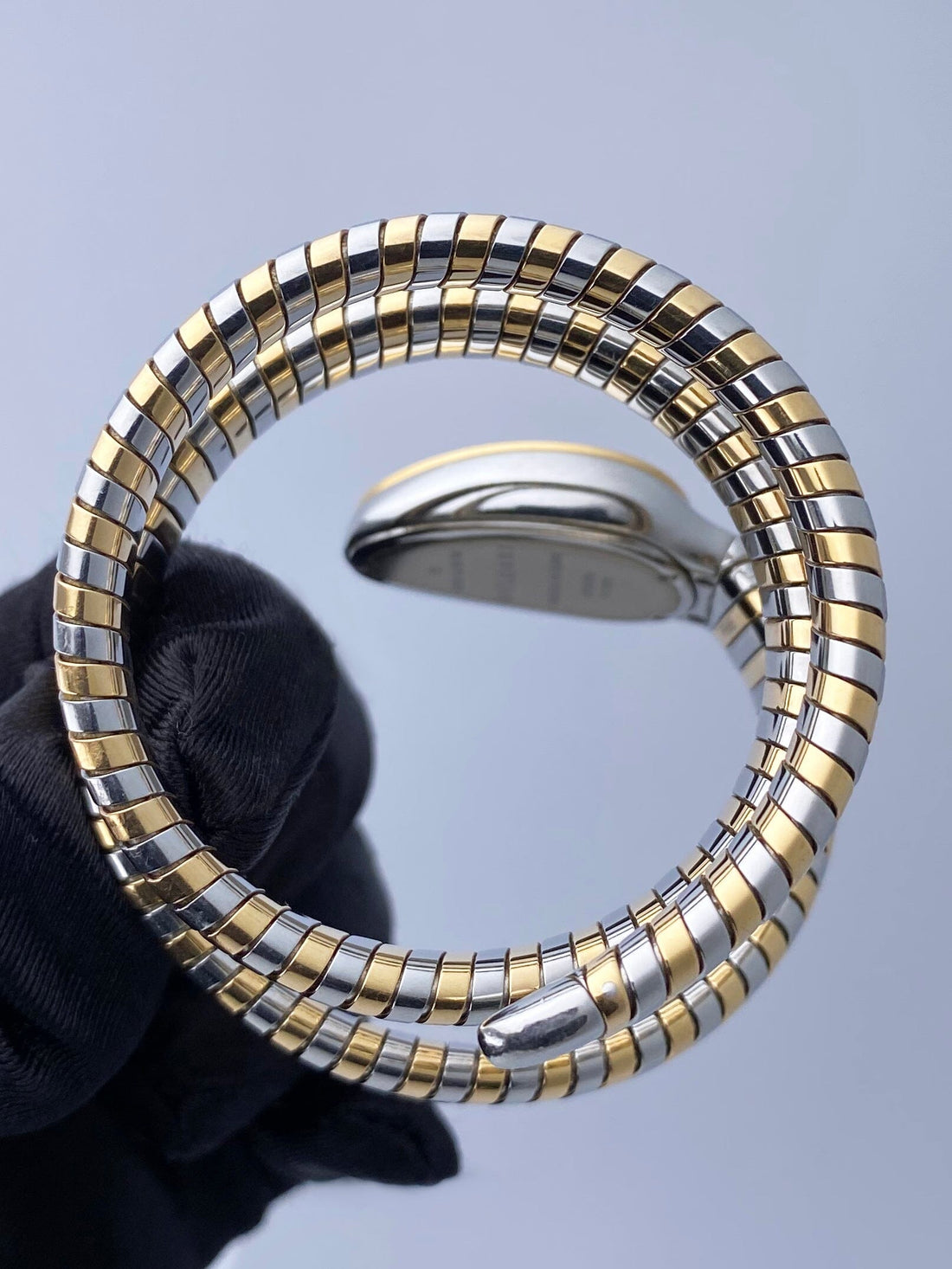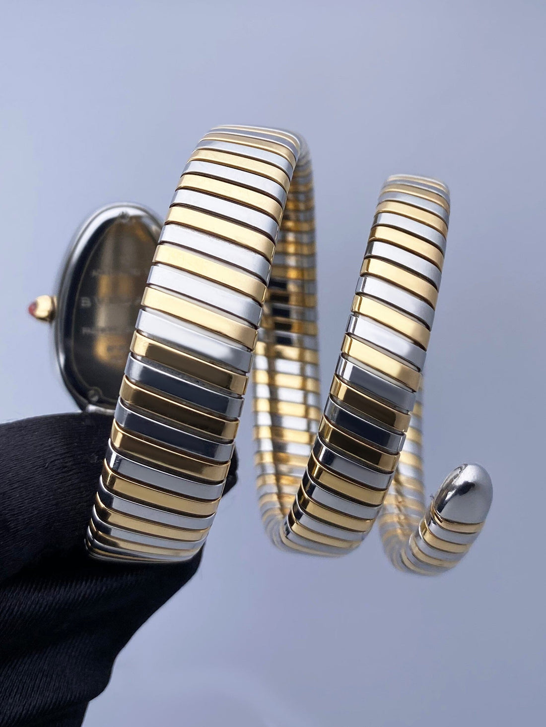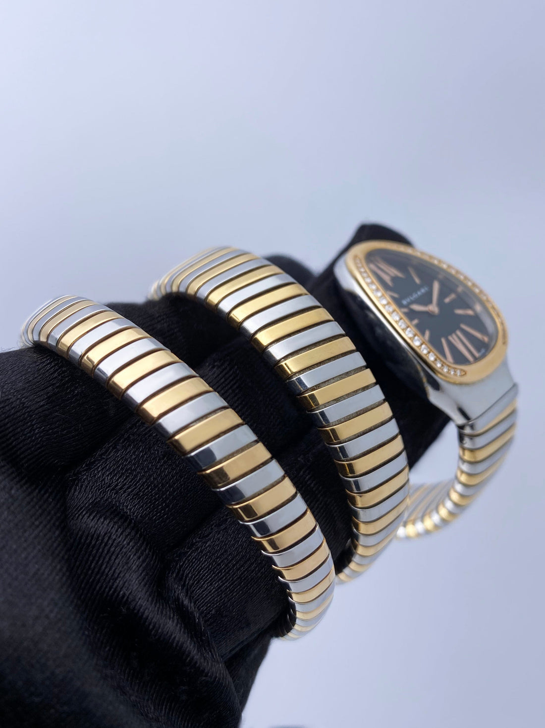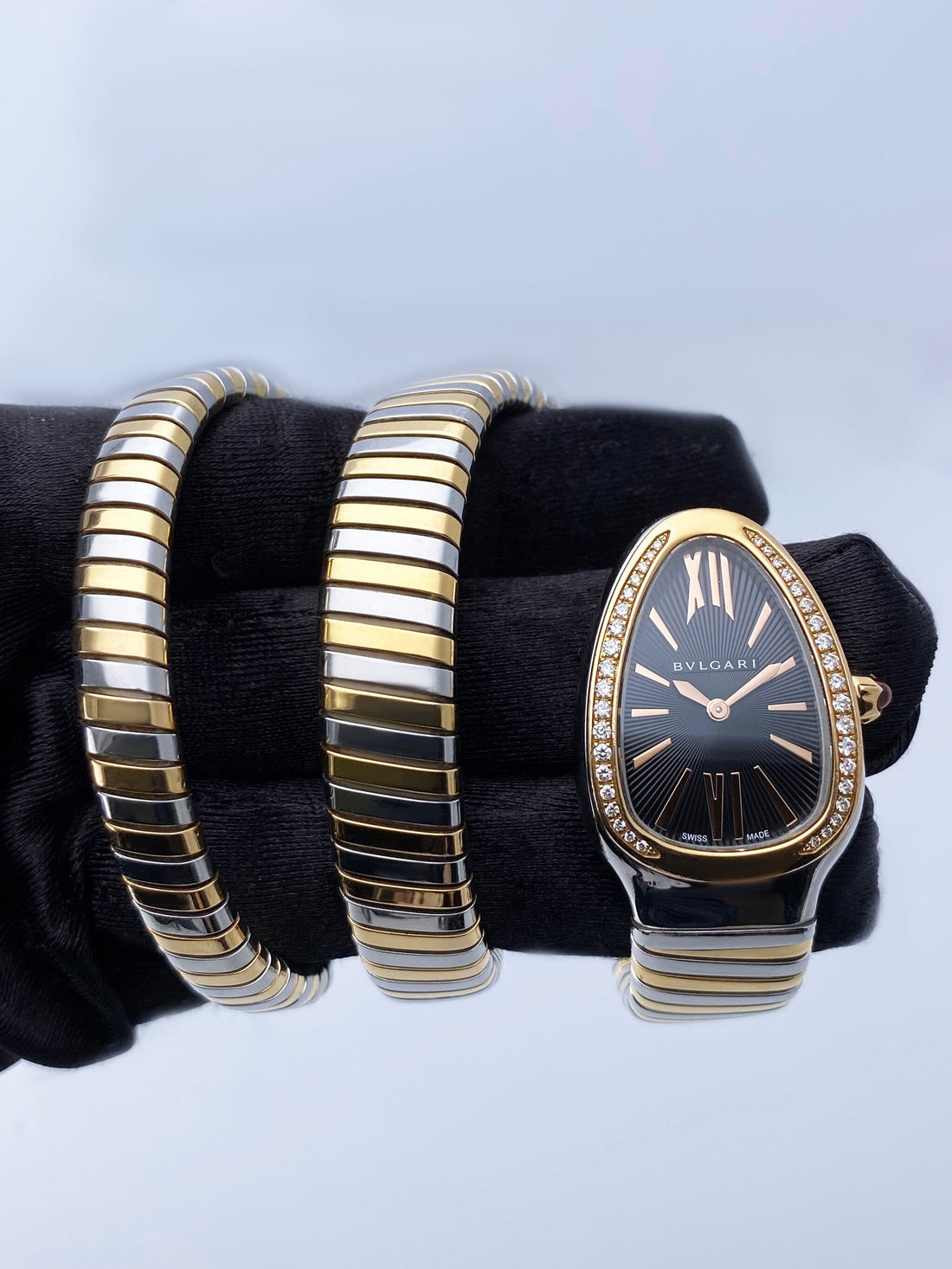 Bvlgari Serpenti 102099 / SP 35 SPG Ladies Watch. 35mm stainless steel case. 18K rose gold bezel with factory diamond set. Black dial with rose gold hands and Roman numeral & index hour marker. 18K rose gold and stainless steel serpent snake bracelet. Will fit up to between 6 to 7 inches, this design is flexible so will fit most wrists. Sapphire crystal. Stainless steel case back. Quartz: battery powered movement.