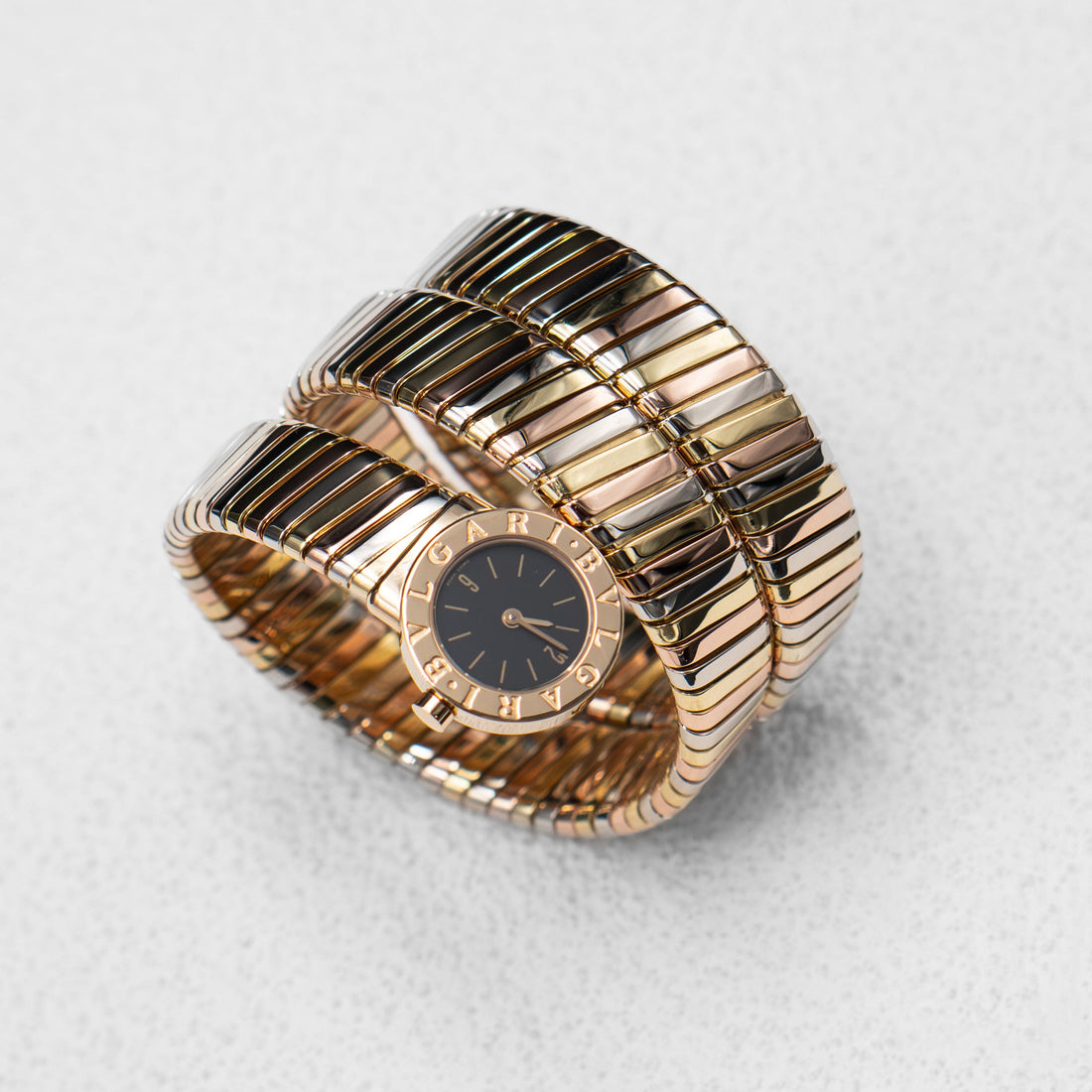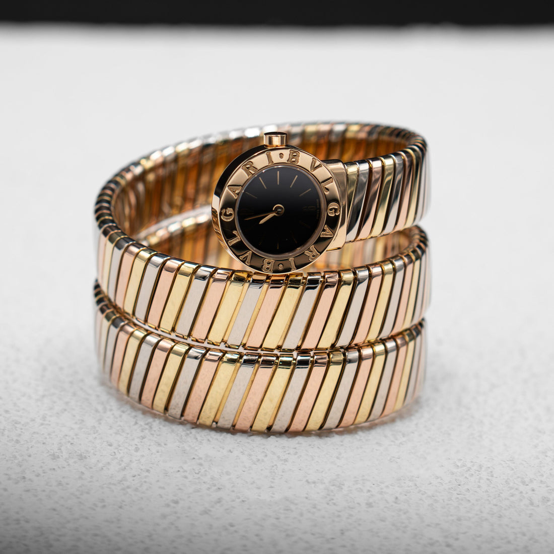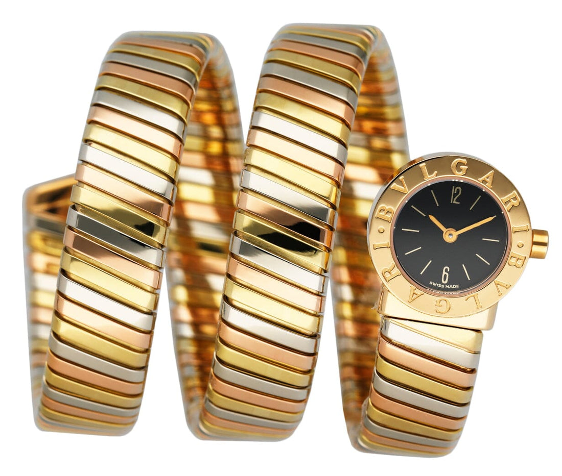 Bvlgari Serpenti Tubogas BB 19 1T Ladies Watch. 19mm 18K yellow gold case with 18K yellow gold bezel. Black dial with gold hands and Arabic numeral & index hour marker. 18K yellow gold, 18K white gold and 18K rose gold serpent snake bracelet. Will fit up to between 6 to 7 inches, this design is flexible so will fit most wrists. Sapphire crystal. 18K yellow gold case back. Quartz: battery powered movement.