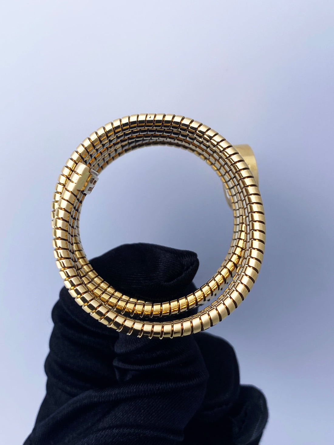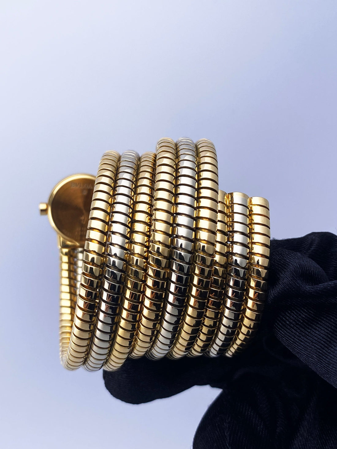 Bvlgari Serpenti Tubogas BB 19 1T Ladies Watch. 19mm 18K yellow gold case. Black dial with gold hands and Arabic numeral & index hour marker. 18K yellow gold, white gold, and rose gold serpent snake bracelet. Will fit up to between 6 to 7 inches, this design is flexible so will fit most wrists. Sapphire crystal. 18K yellow gold case back. Quartz: battery powered movement.