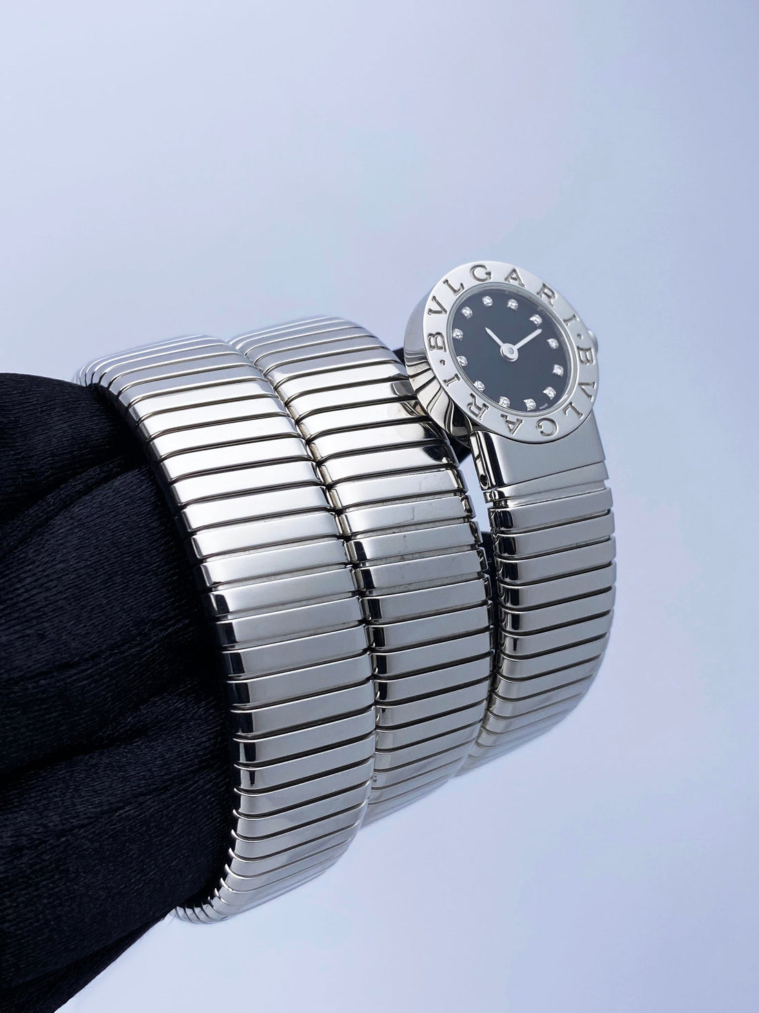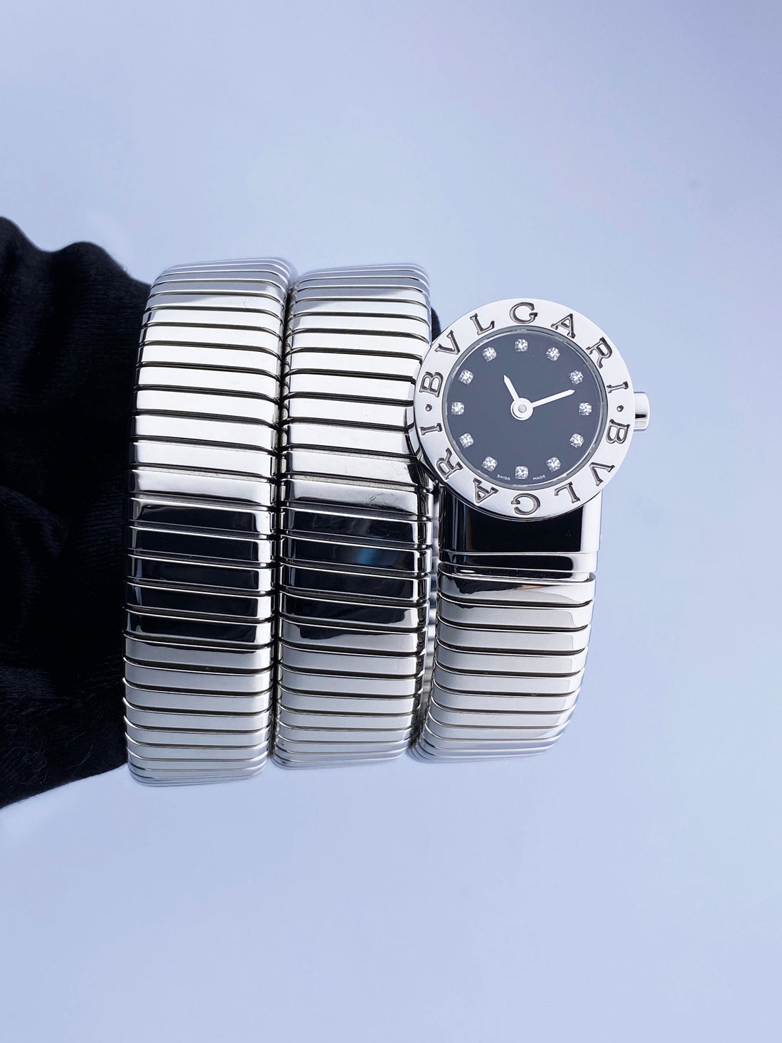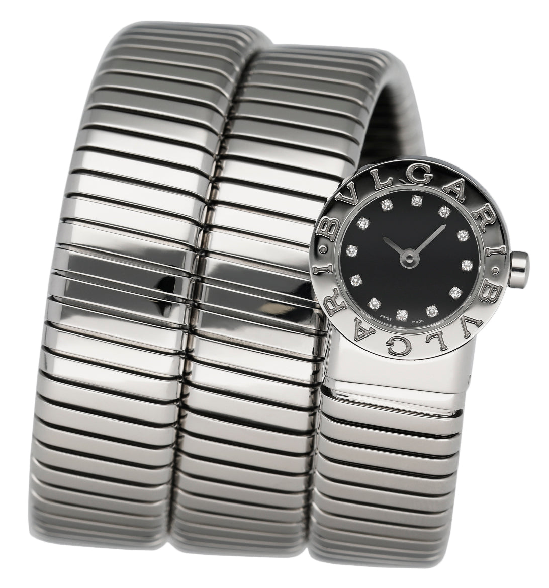 Bvlgari Serpenti Tubogas BB 19 1TS Ladies Watch. 19mm stainless steel case with stainless steel bezel. Black dial with gold hands and original factory diamond set hour marker. Stainless steel serpent snake bracelet. Will fit up to between 6 to 7 inches, this design is flexible so will fit most wrists. Sapphire crystal. Stainless steel case back. Quartz: battery powered movement.