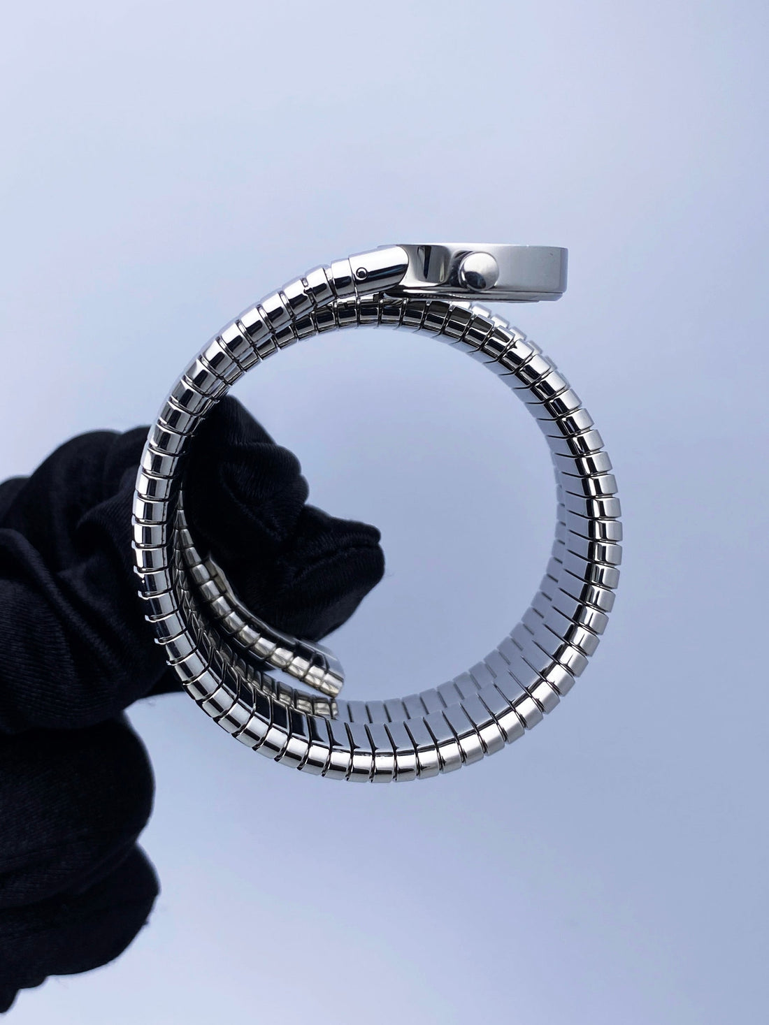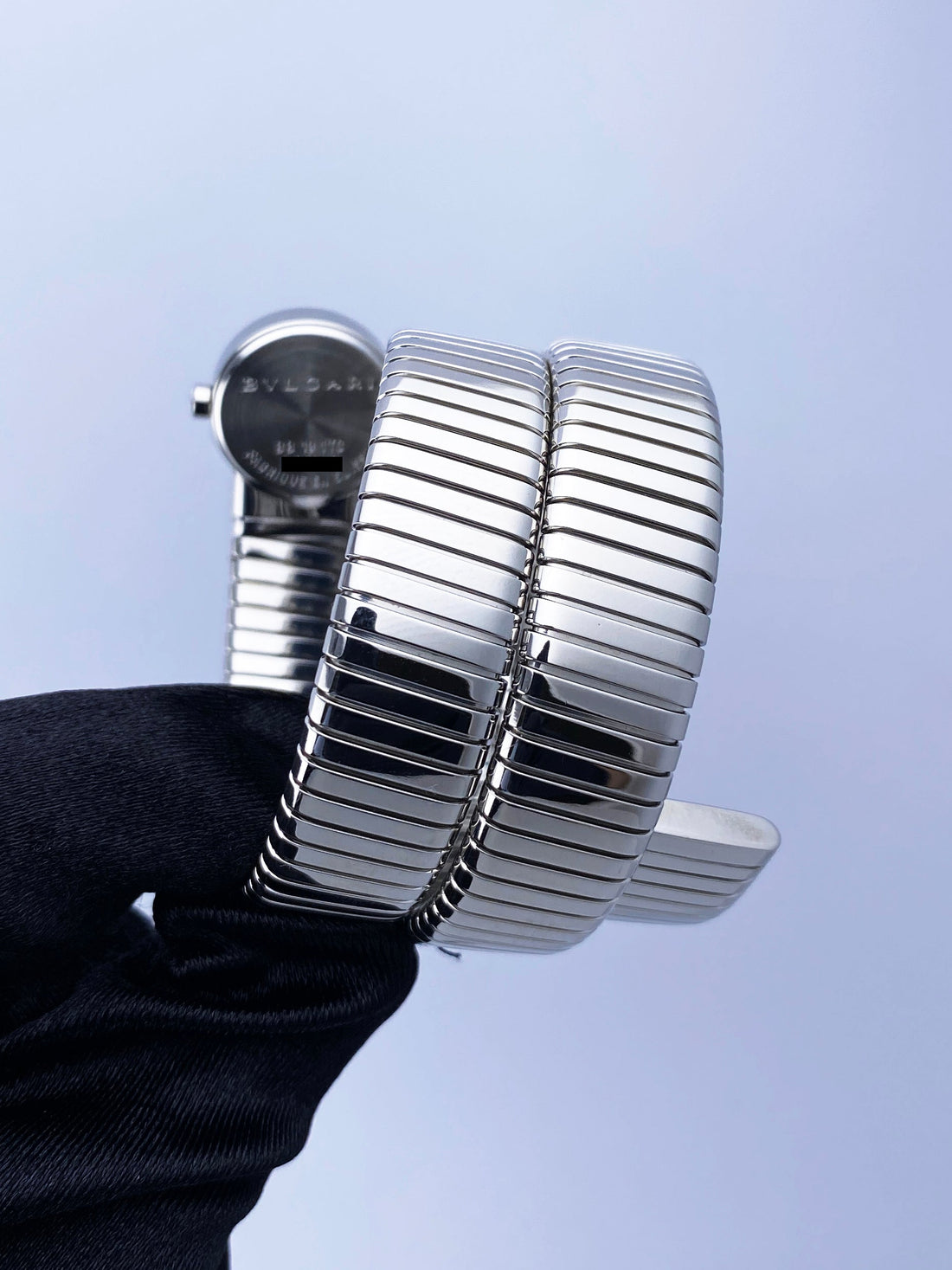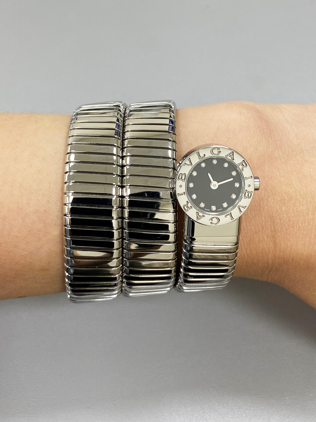 Bvlgari Serpenti Tubogas BB 19 1TS Ladies Watch. 19mm stainless steel case with stainless steel bezel. Black dial with gold hands and original factory diamond set hour marker. Stainless steel serpent snake bracelet. Will fit up to between 6 to 7 inches, this design is flexible so will fit most wrists. Sapphire crystal. Stainless steel case back. Quartz: battery powered movement.