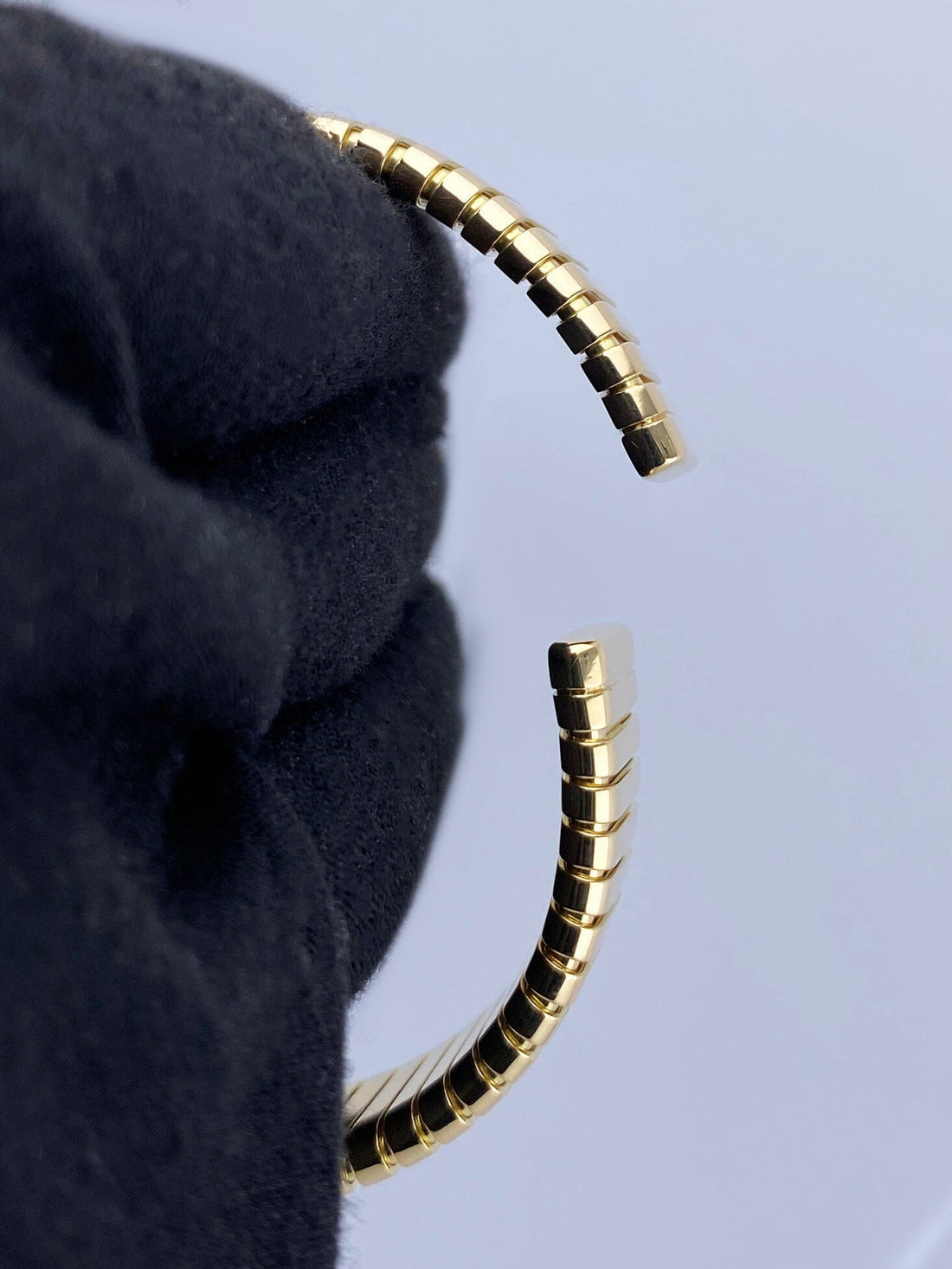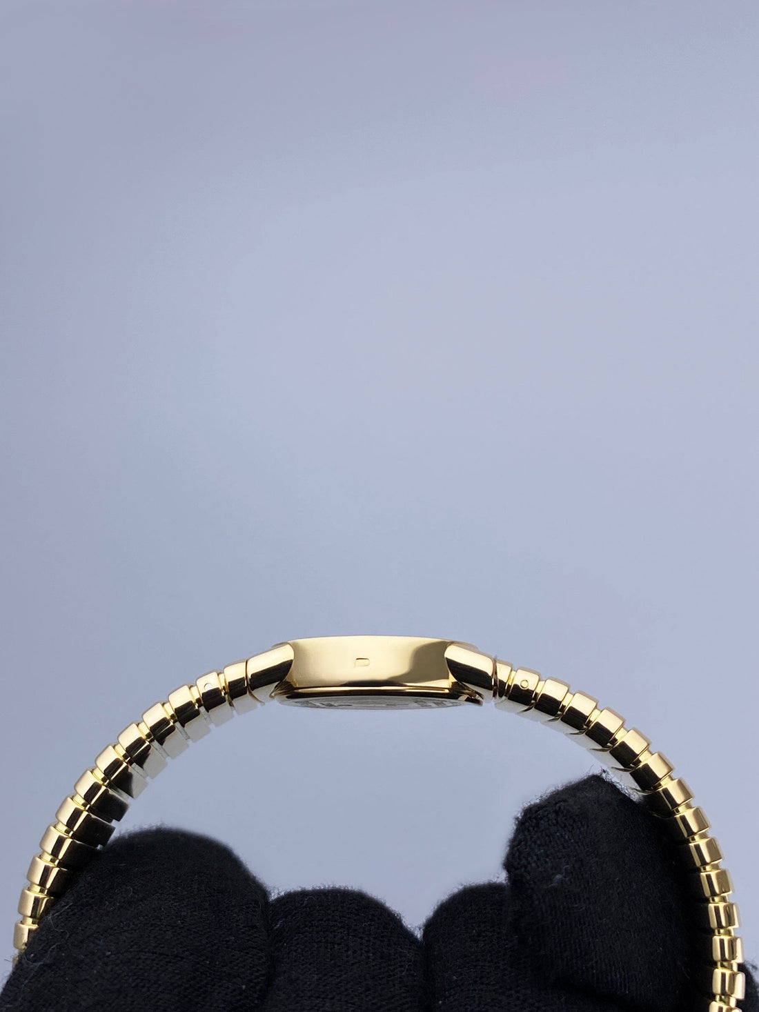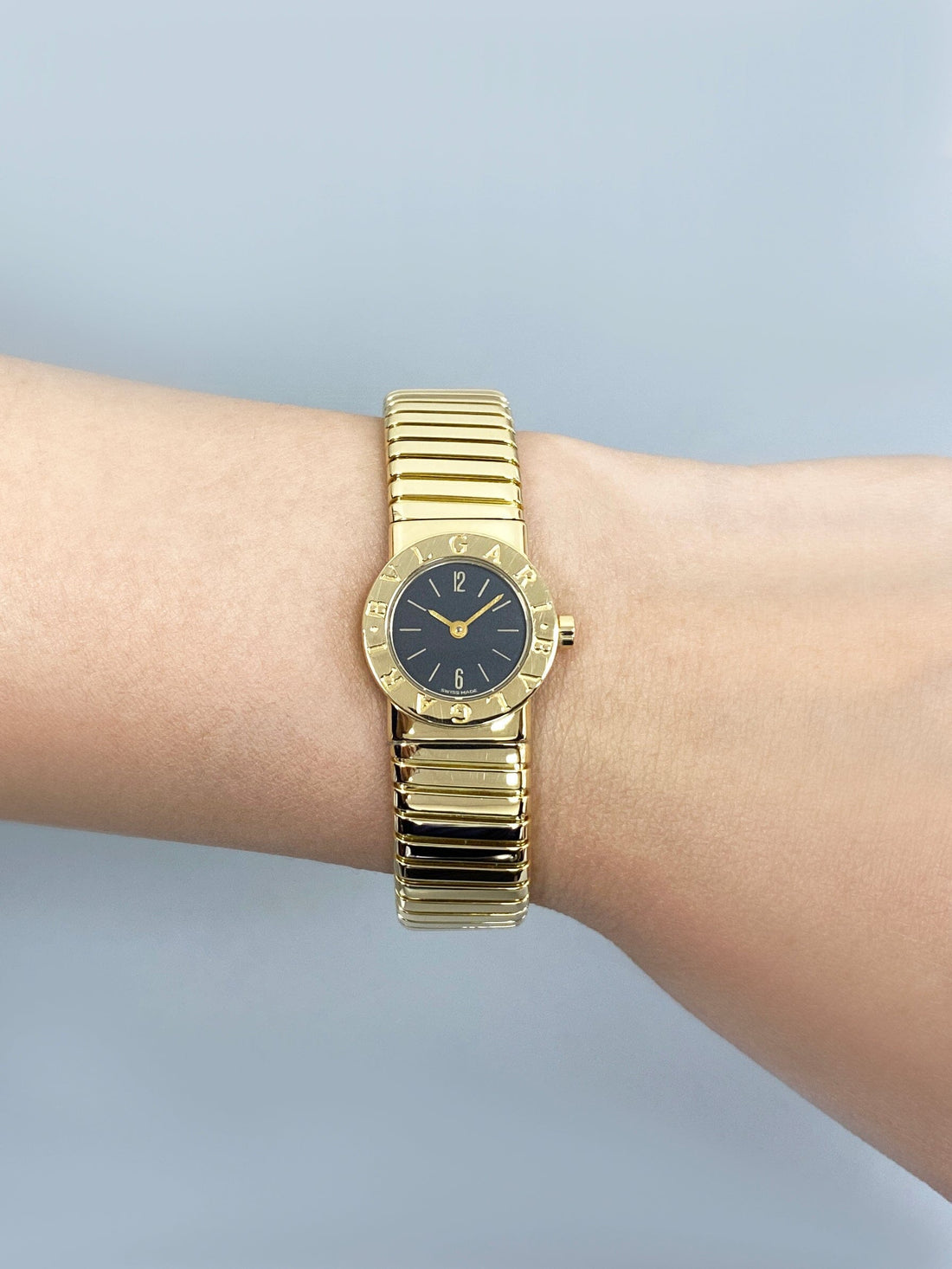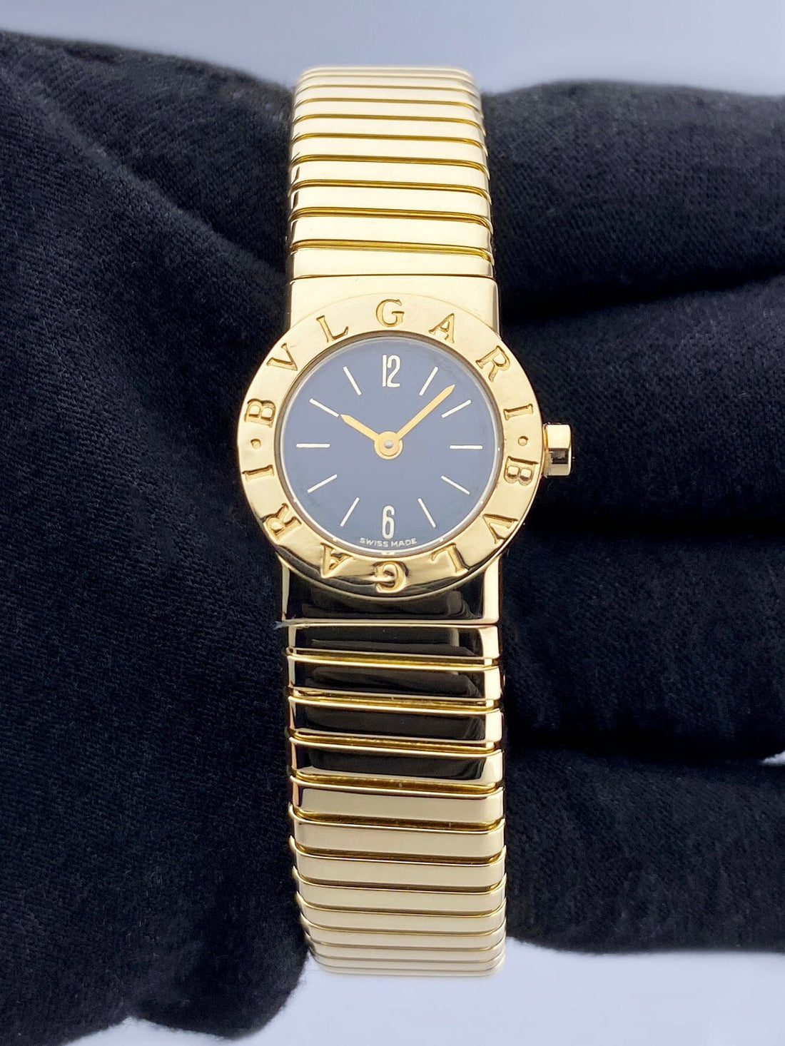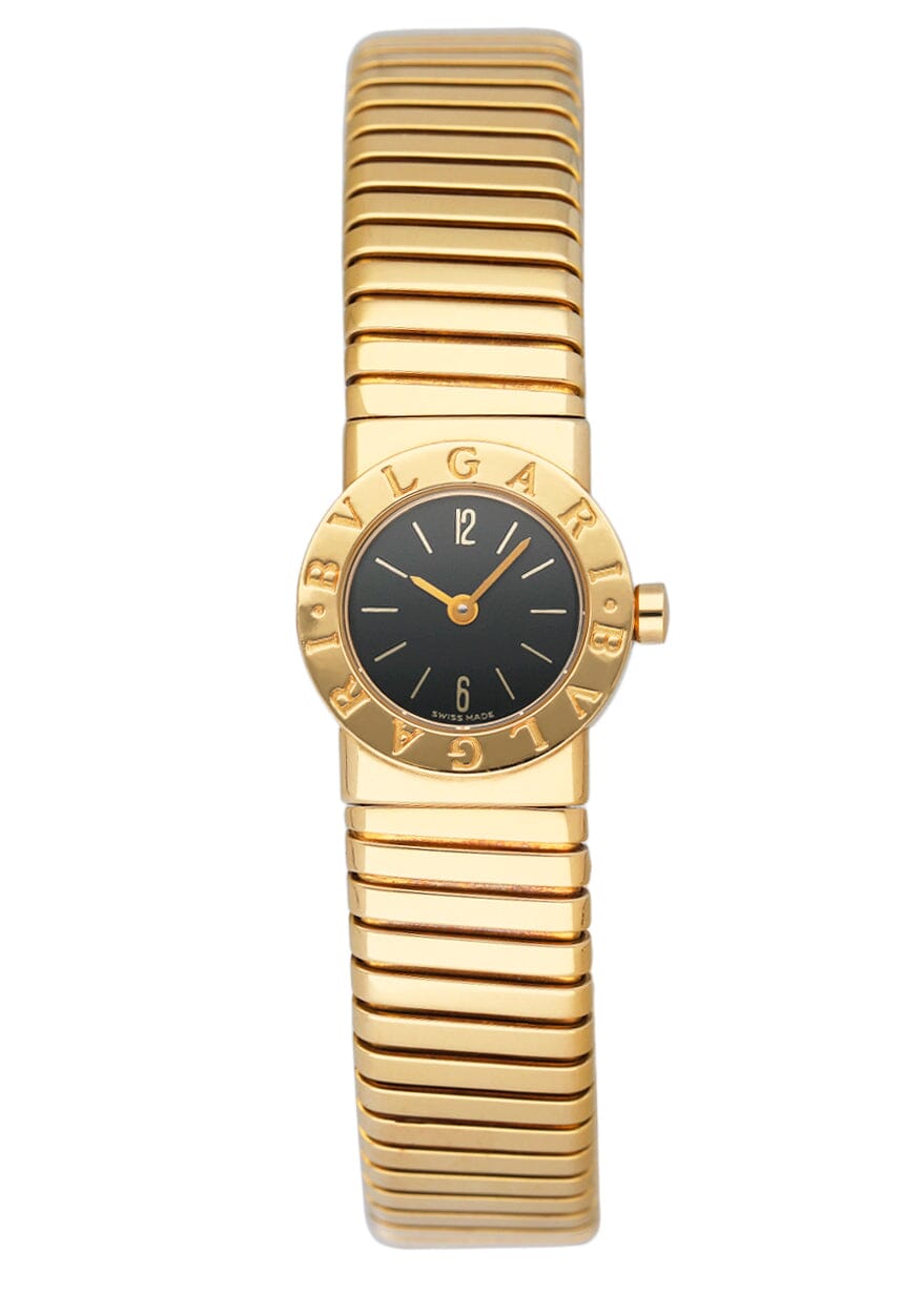 Bvlgari Tubogas BB 19 2T Ladies Watch. 19mm 18K yellow gold case. 18K yellow gold fixed bezel with engraved Bvlgari. Black dial with gold hands and index hour markers and Arabic 6 & 12-hour indicators. 18K yellow gold bangle bracelet. Will fit up to a 6-inch wrist. Sapphire crystal. 18K yellow gold case back. Quartz: battery powered movement.