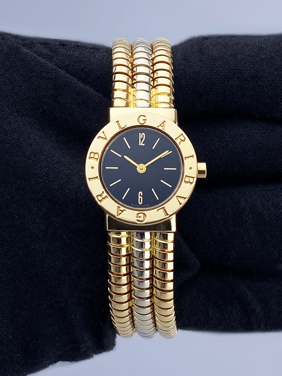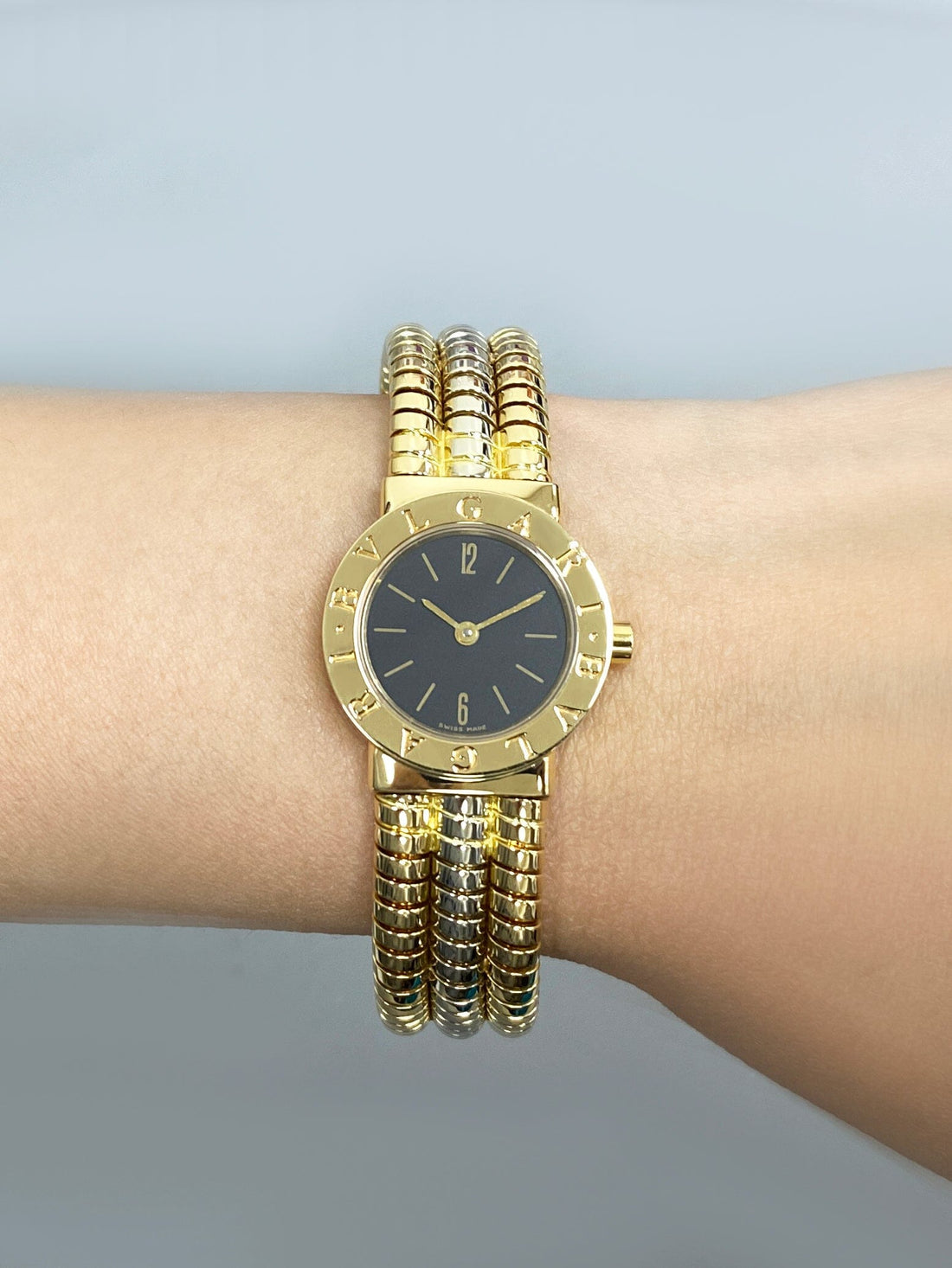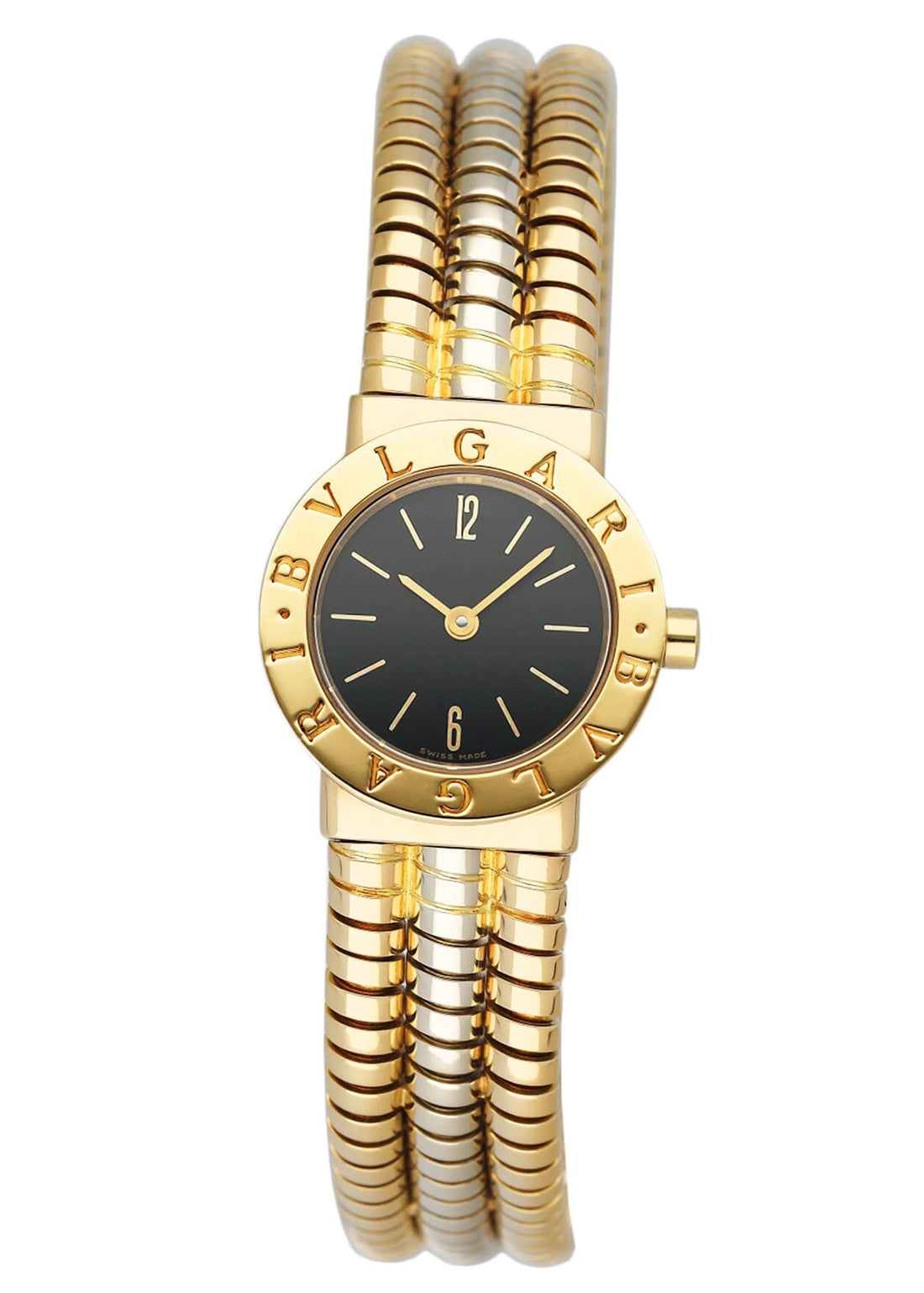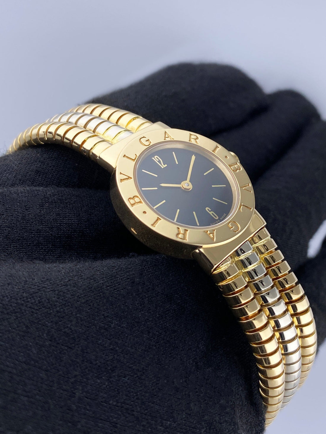 Bvlgari Tubogas BB232T Ladies Watch. 23mm 18K yellow gold case. 18K yellow gold fixed bezel with engraved Bvlgari. Black dial with gold hands and index hour markers and Arabic 6 & 12-hour indicators. 18K yellow & white gold bangle bracelet. Will fit up to a 6-inch wrist. Sapphire crystal. 18K yellow gold case back. Quartz: battery powered movement.