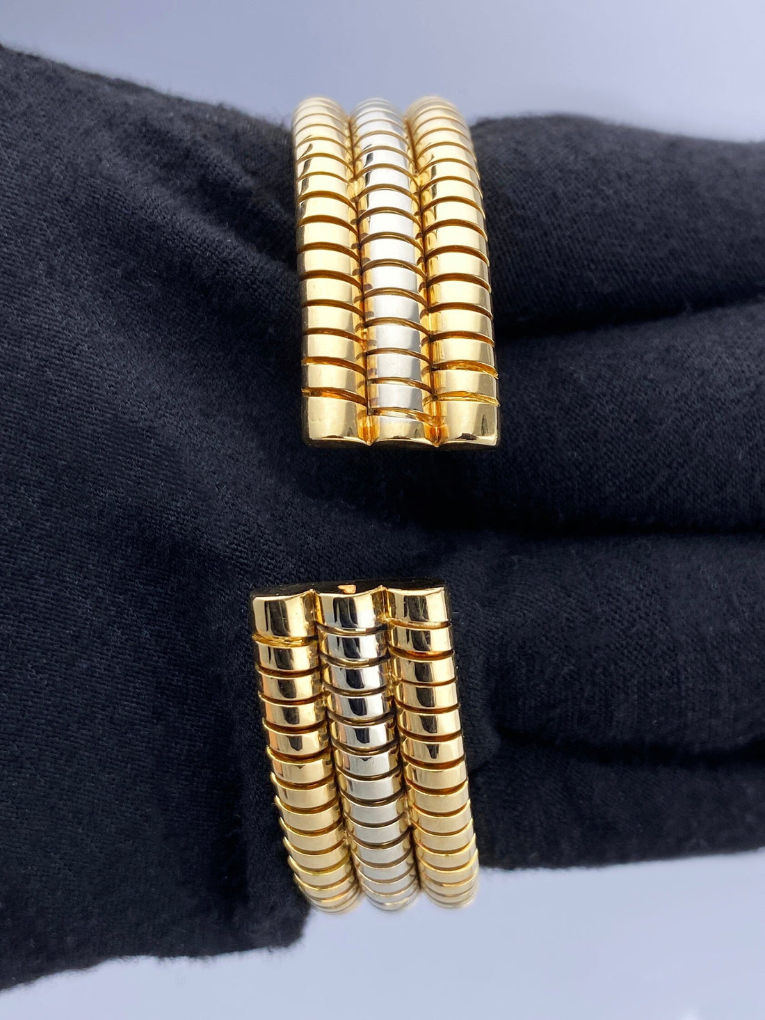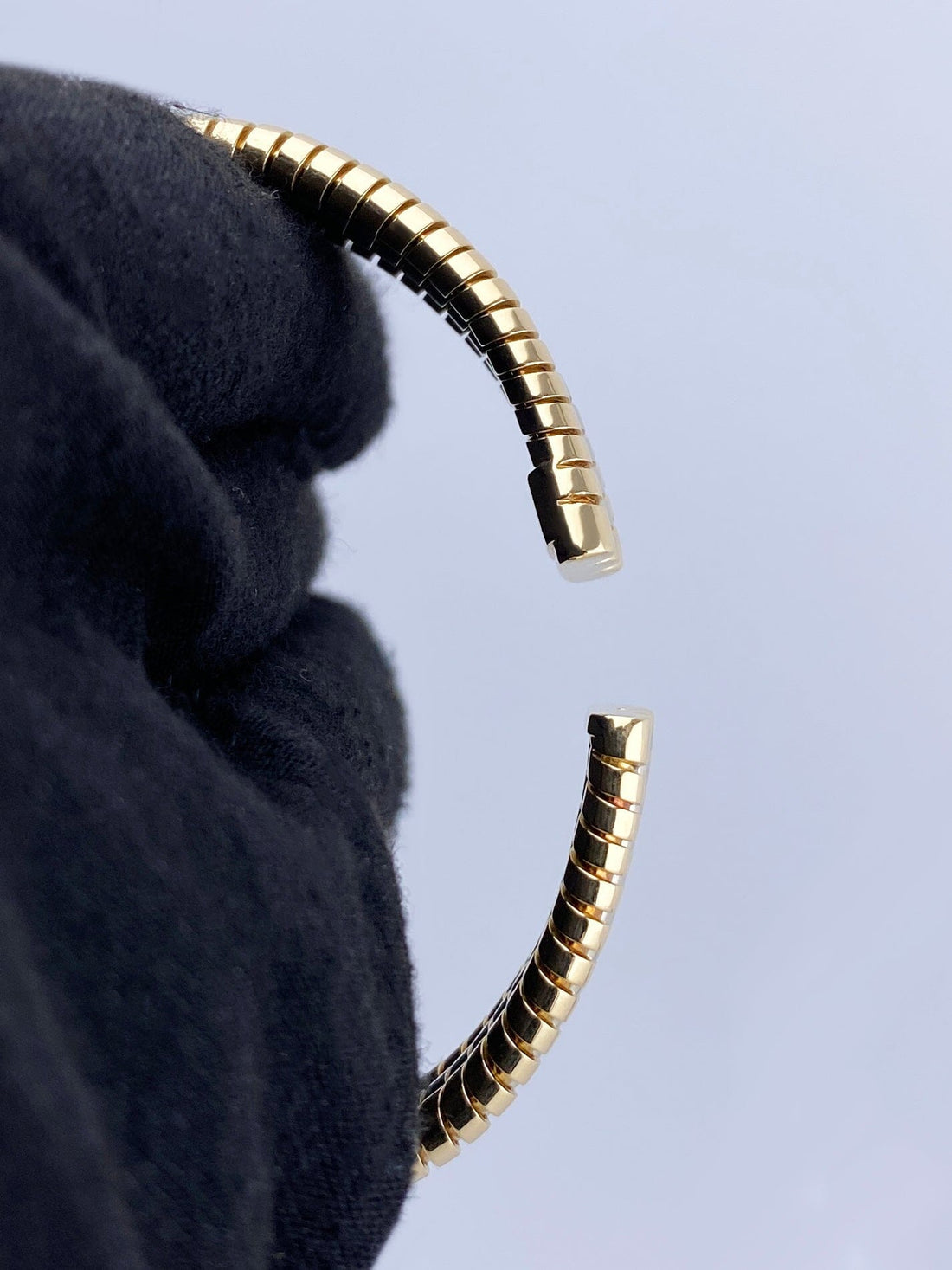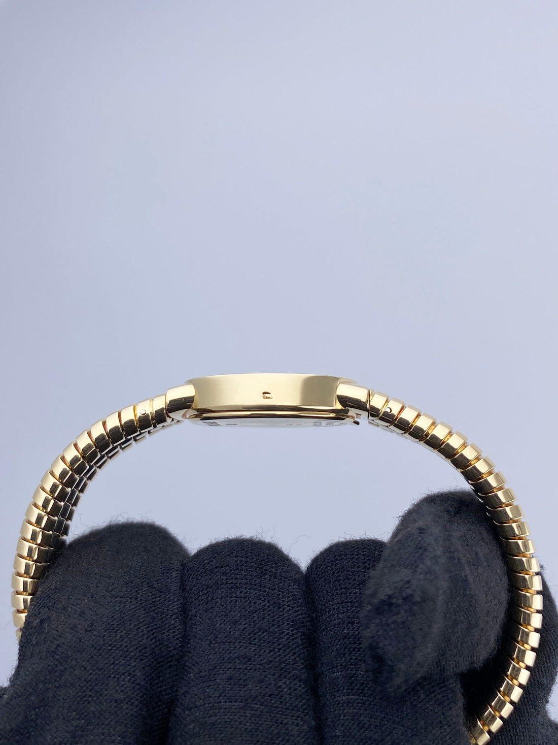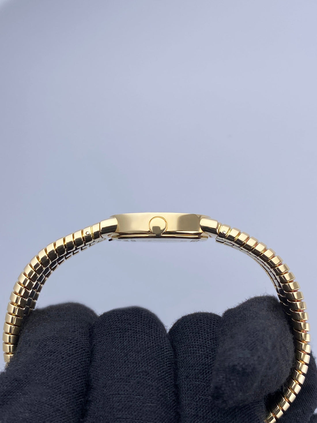 Bvlgari Tubogas BB232T Ladies Watch. 23mm 18K yellow gold case. 18K yellow gold fixed bezel with engraved Bvlgari. Black dial with gold hands and index hour markers and Arabic 6 & 12-hour indicators. 18K yellow & white gold bangle bracelet. Will fit up to a 6-inch wrist. Sapphire crystal. 18K yellow gold case back. Quartz: battery powered movement.