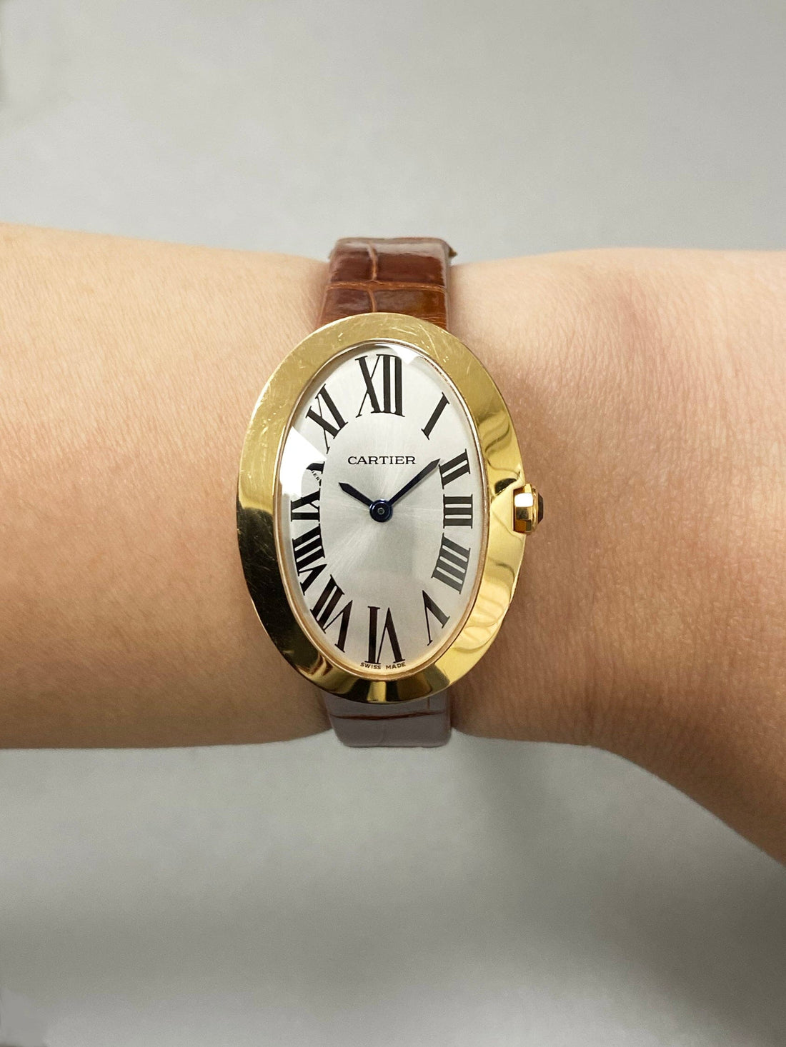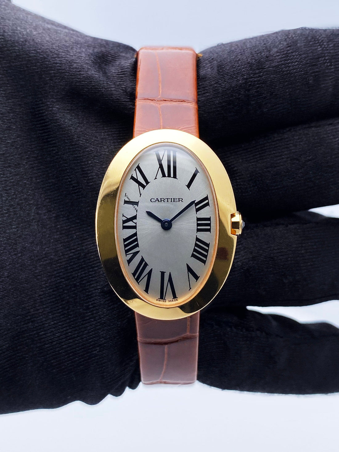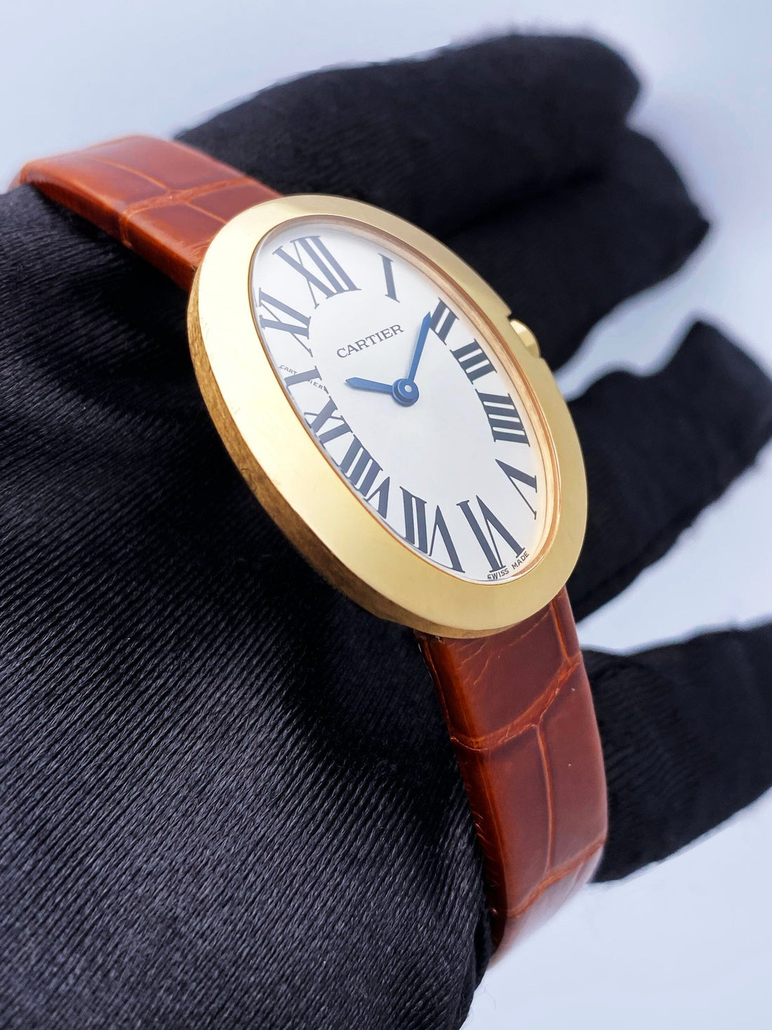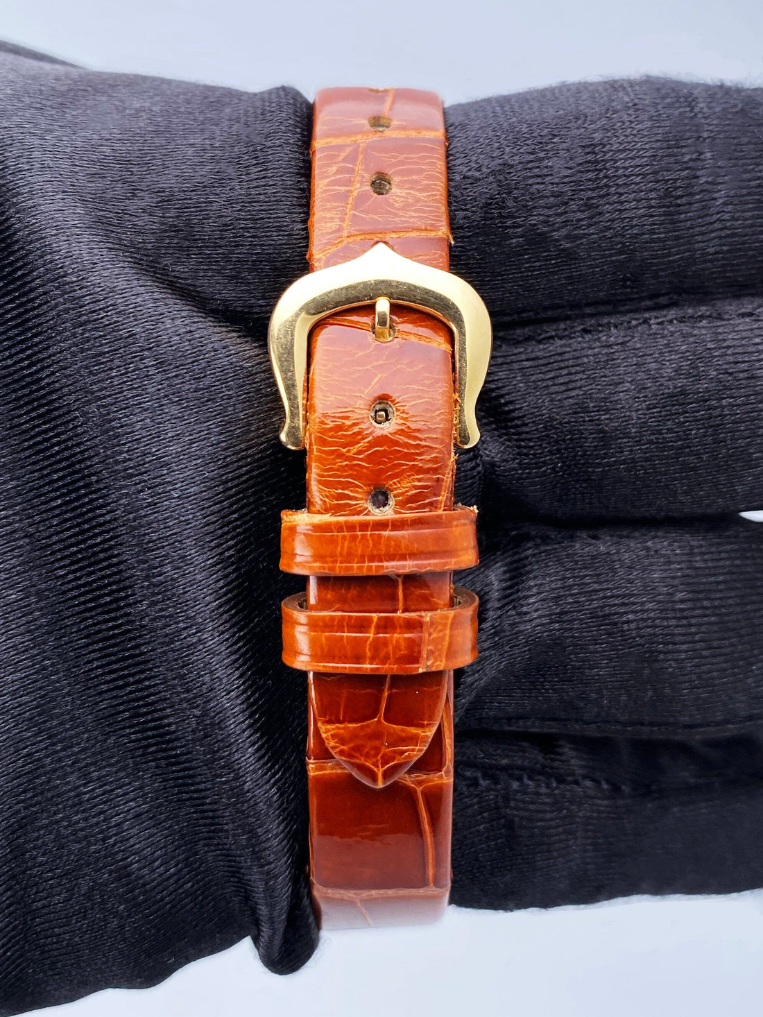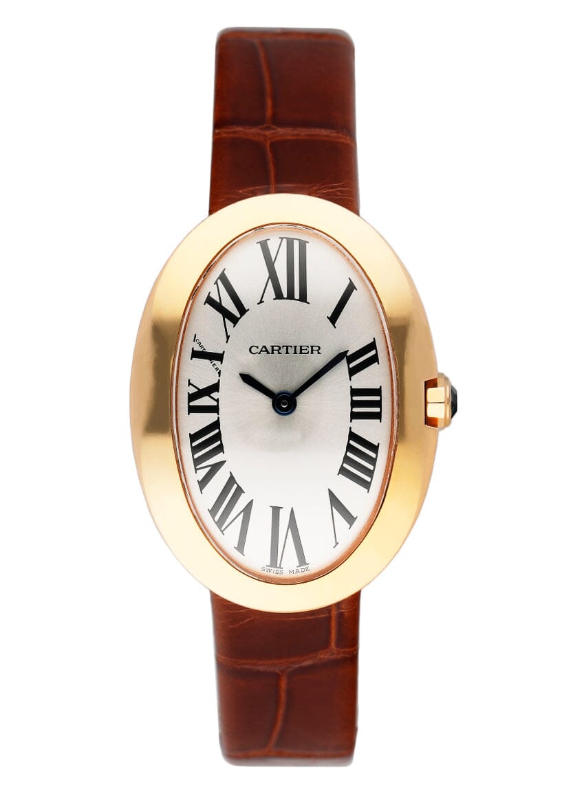 Cartier Baignoire W8000007 / 3064 Ladies Watch. 23.1mm 18K rose gold case. 18K rose gold bezel. Silver dial with blue hands and black Roman numeral hour markers. Brown leather strap with 18K rose gold buckle. Will fit up to a 6.5-inch wrist. Sapphire crystal. 18K rose gold case back. Quartz: Battery powered movement.