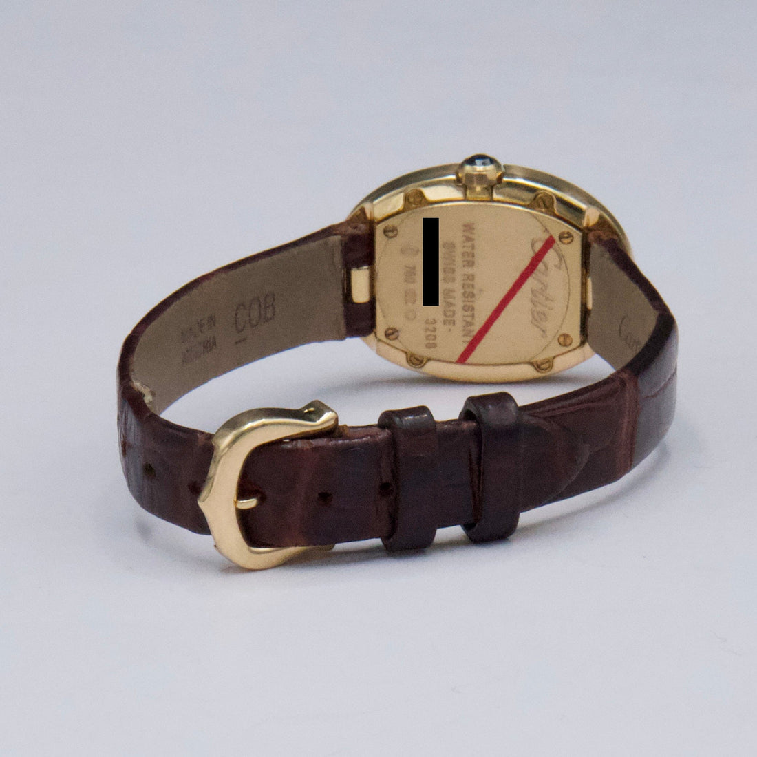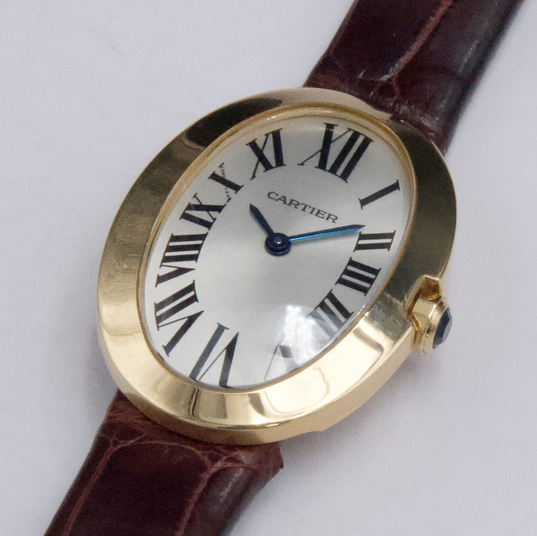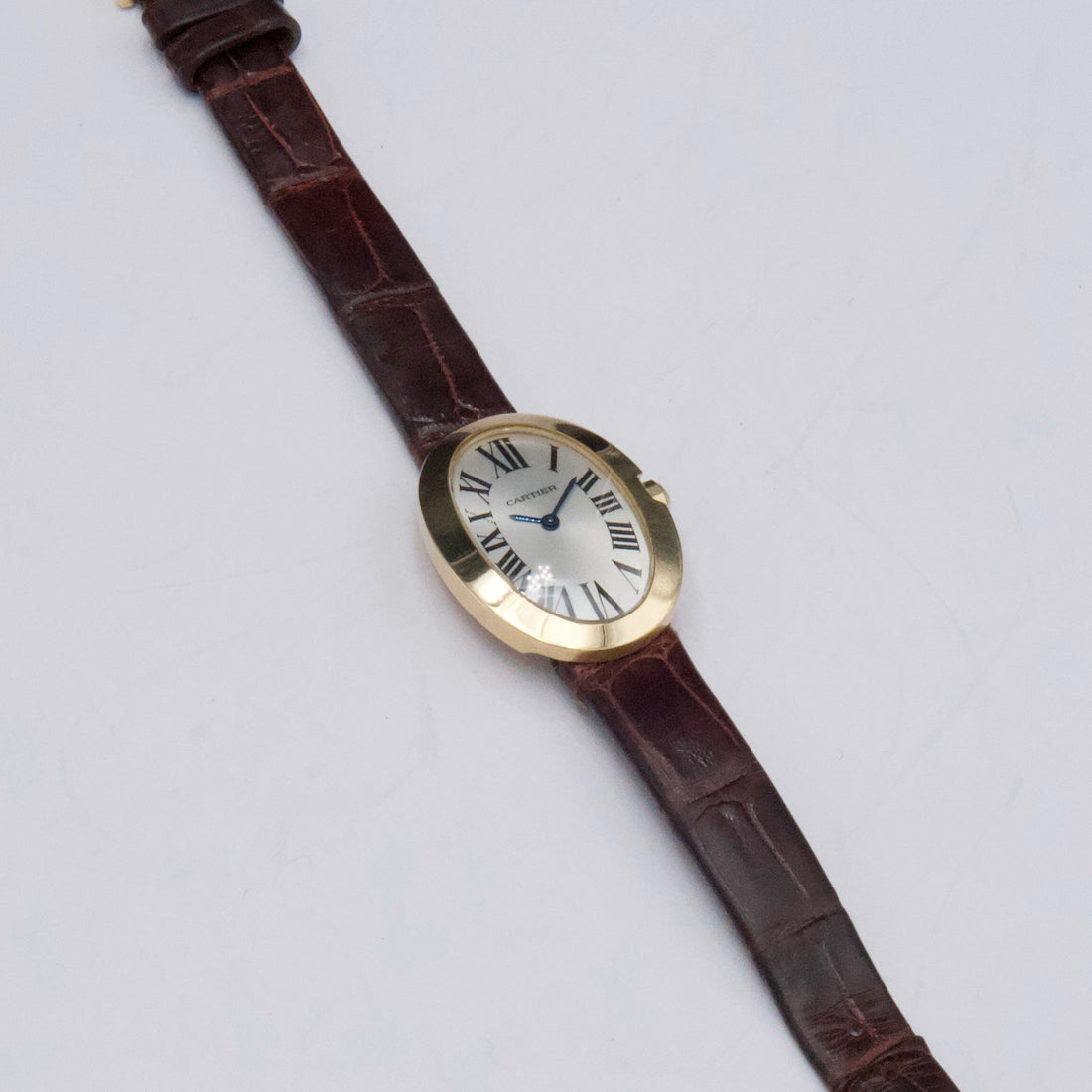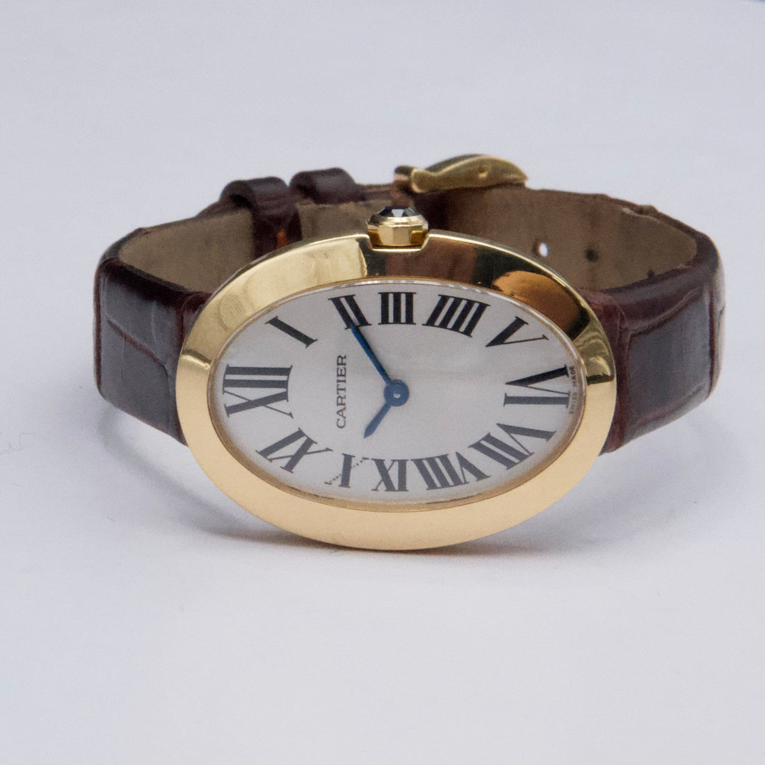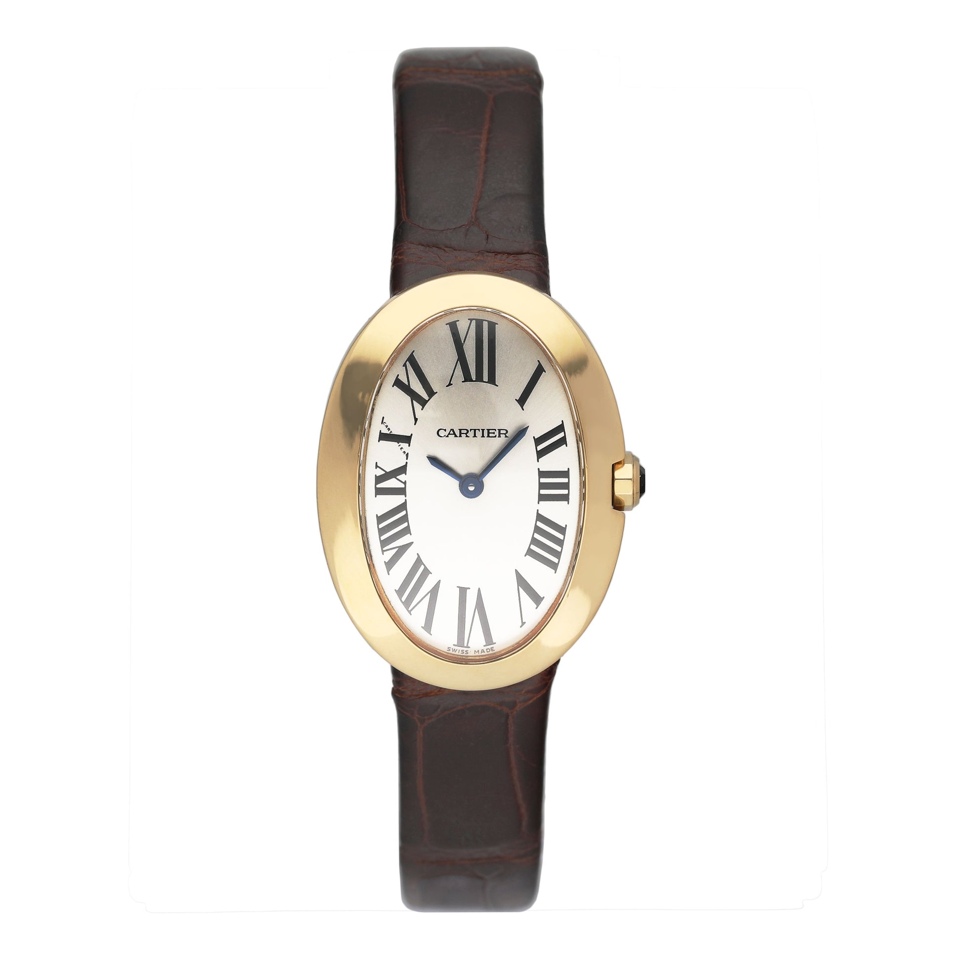 Cartier Baignoire W8000009 / 3208 Ladies Watch. 23mm 18K yellow gold case. 18K yellow gold bezel. Silver dial with blue hands and black Roman numeral hour markers. Brown leather strap with 18K yellow gold buckle. Will fit up to a 6.5-inch wrist. Sapphire crystal. 18K yellow gold case back. Quartz: Battery powered movement.